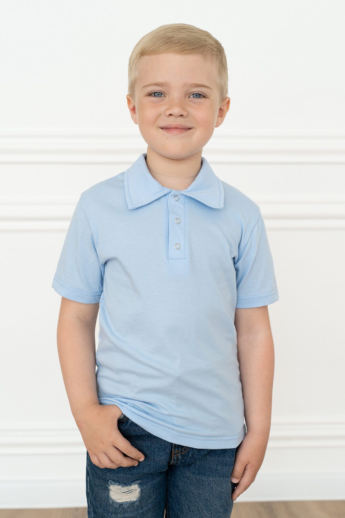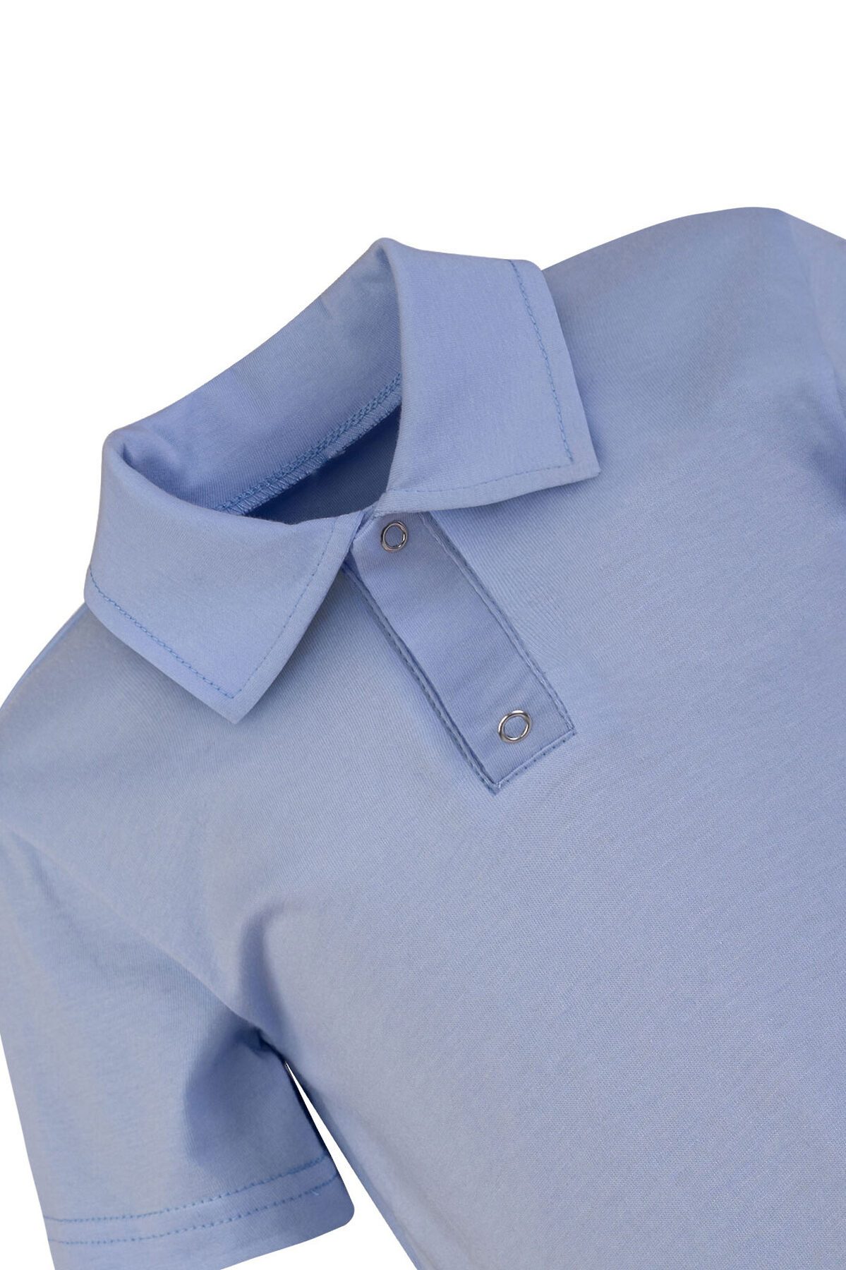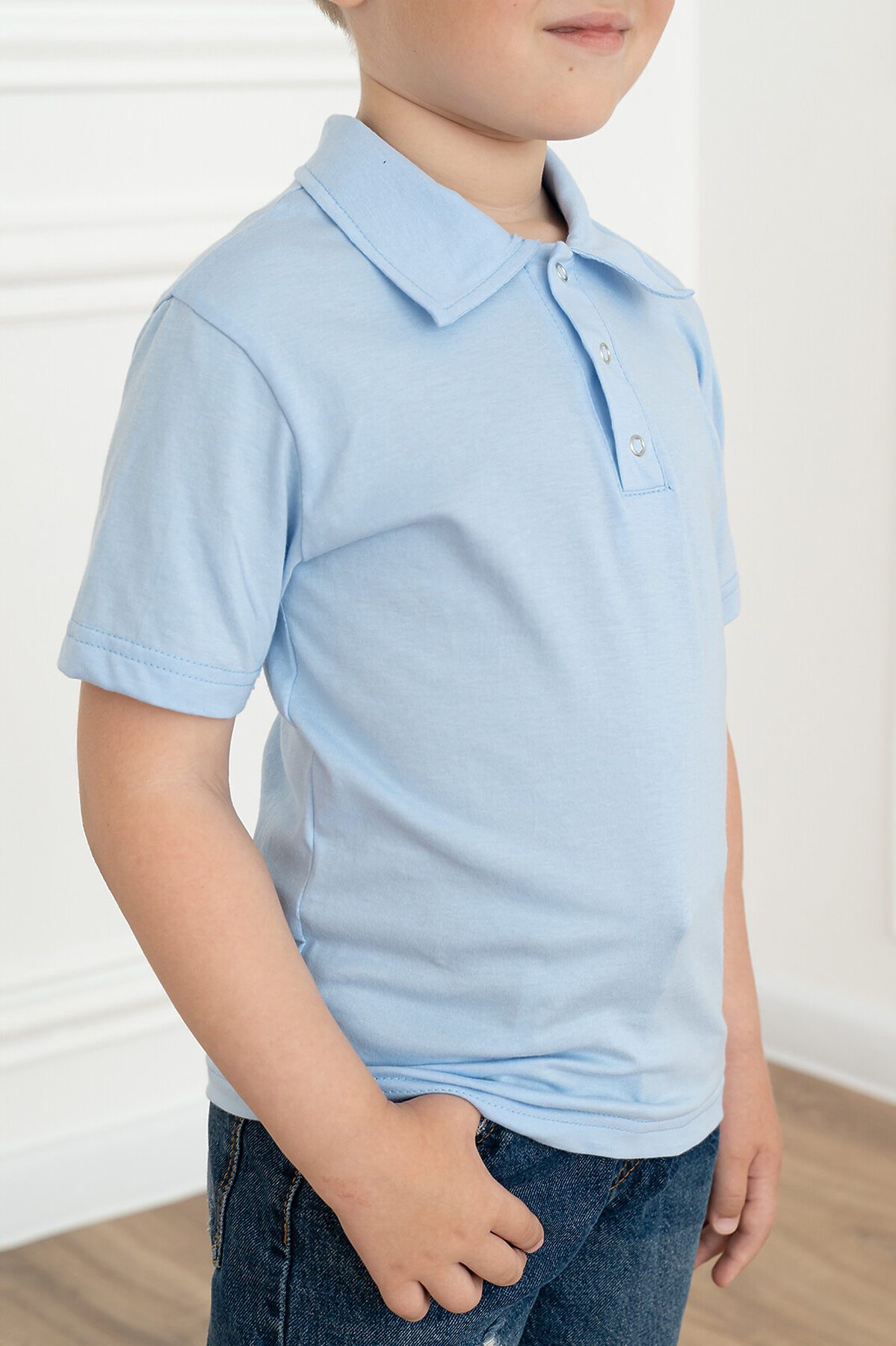 Футболка поло нежного голубого цвета с короткими рукавами понравится мальчику своим качеством и стильным дизайном. Горловина изделия обработана отложным воротником, снизу от которого расположены застёжки в стиле “поло”. Подол и края рукавов аккуратно прошиты крепкими швами. >