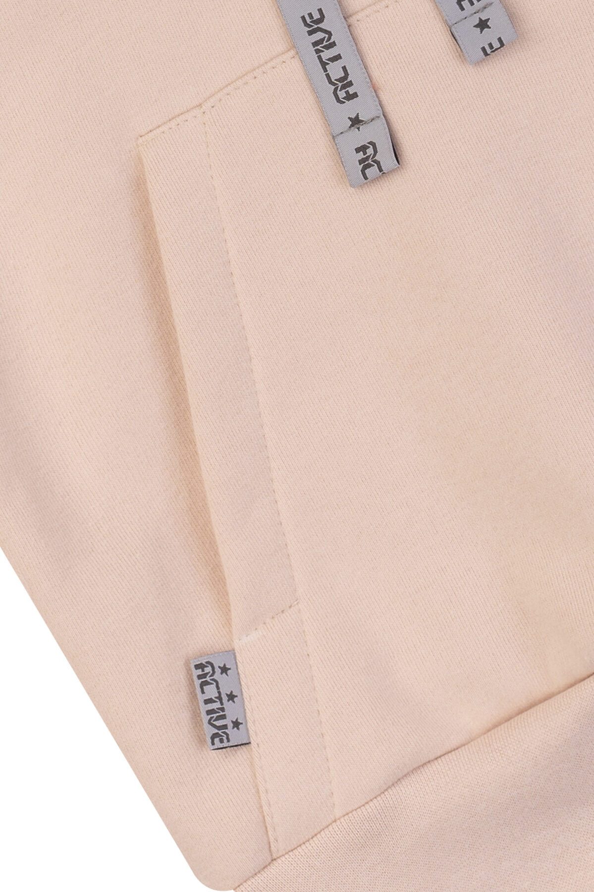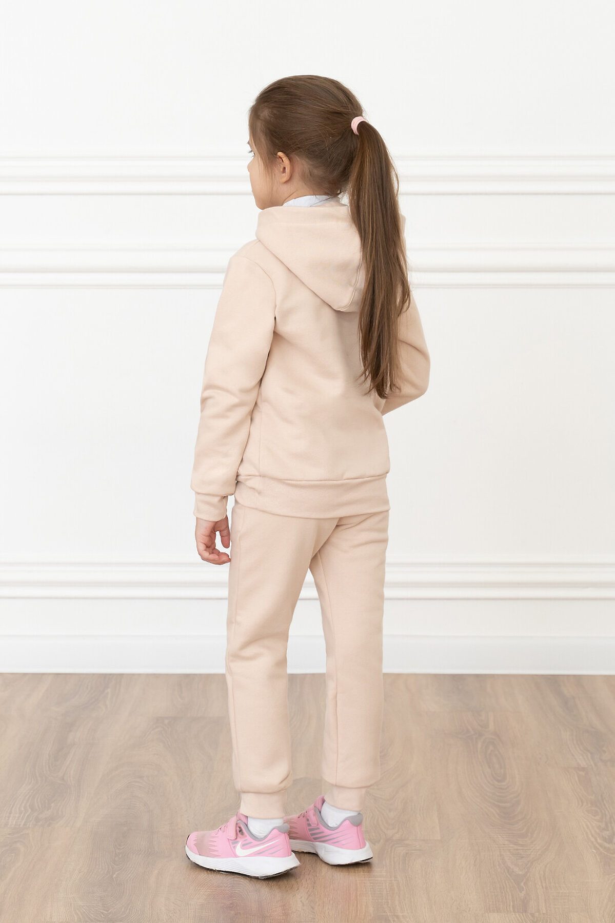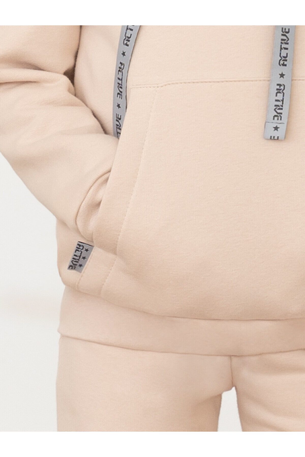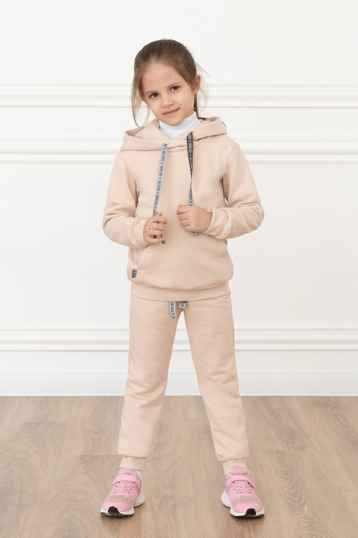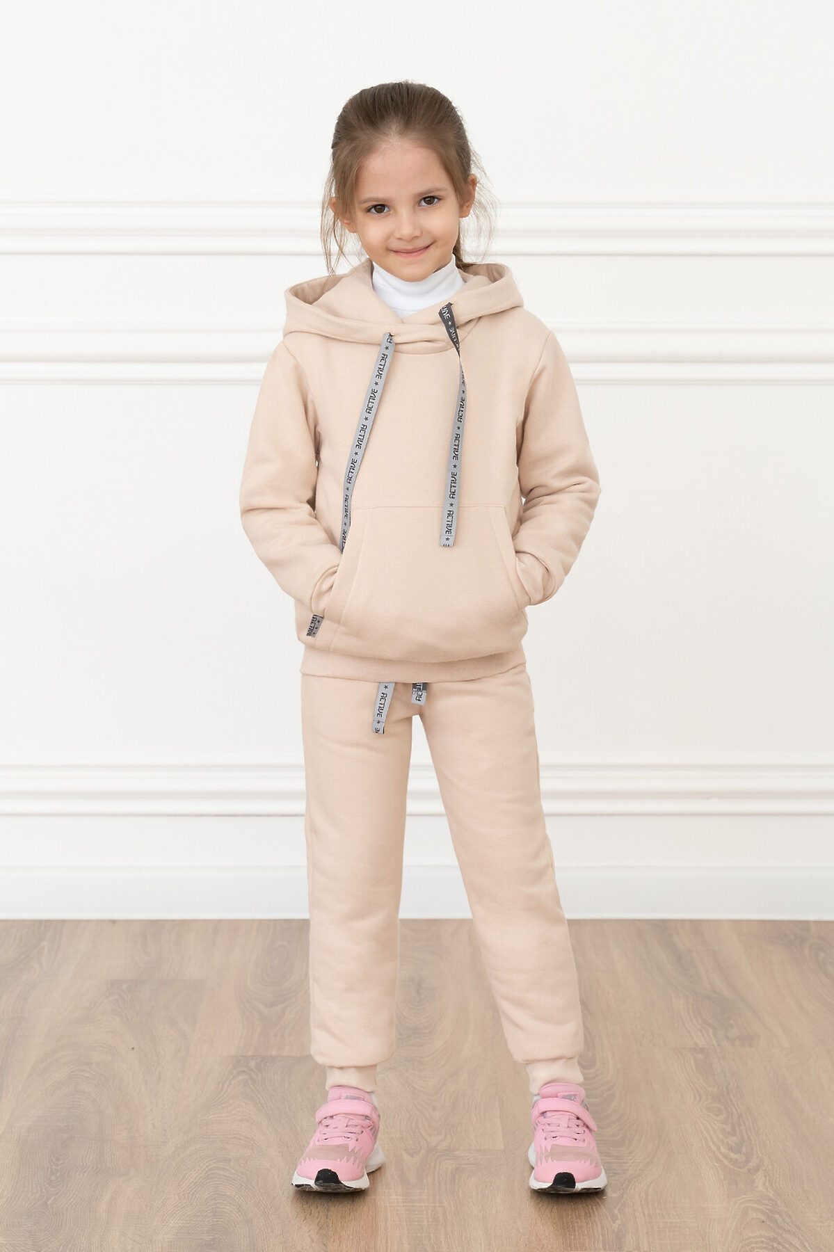 Детский спортивный костюм из однотонного кремового трикотажа футер с начесом. Состоит из уютной свободной толстовки и брюк. Капюшон объемный двухслойный со шнурком для регулировки, спереди карман “кенгуру”. Штаны на широком эластичном поясе также со шнурком. По низу толстовки, штанин и рукавов эластичные манжеты. >