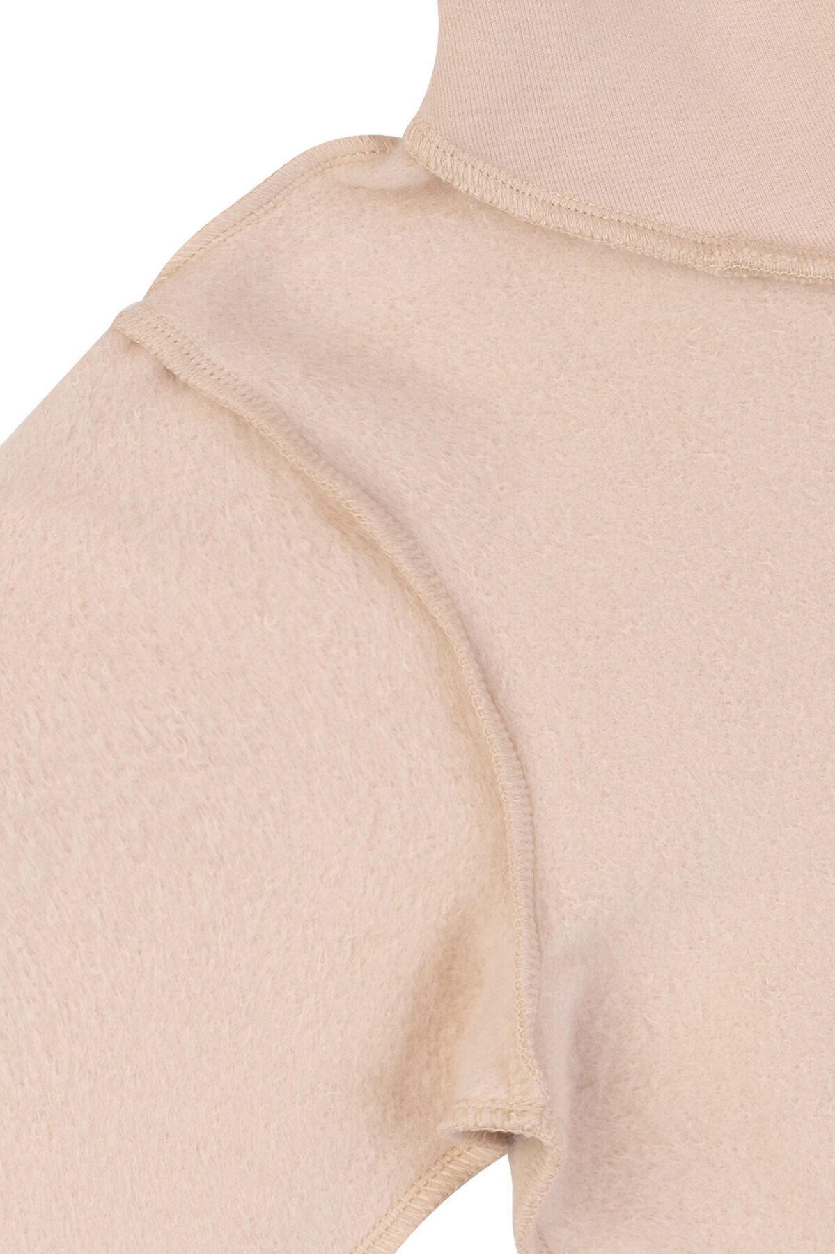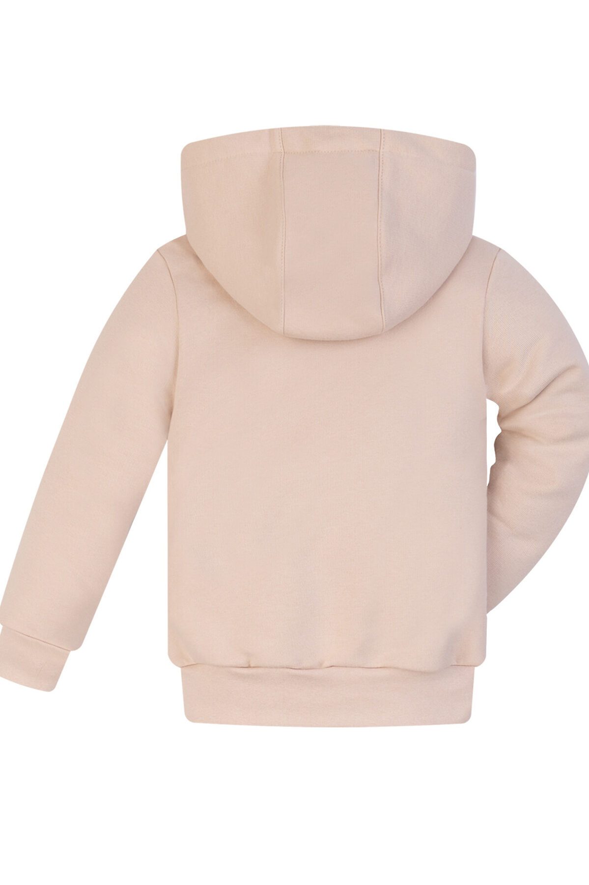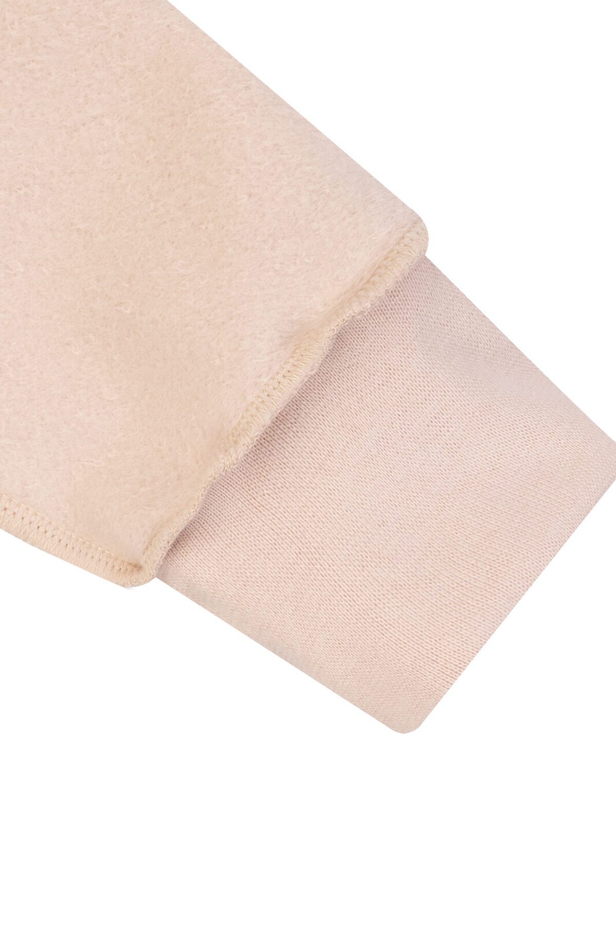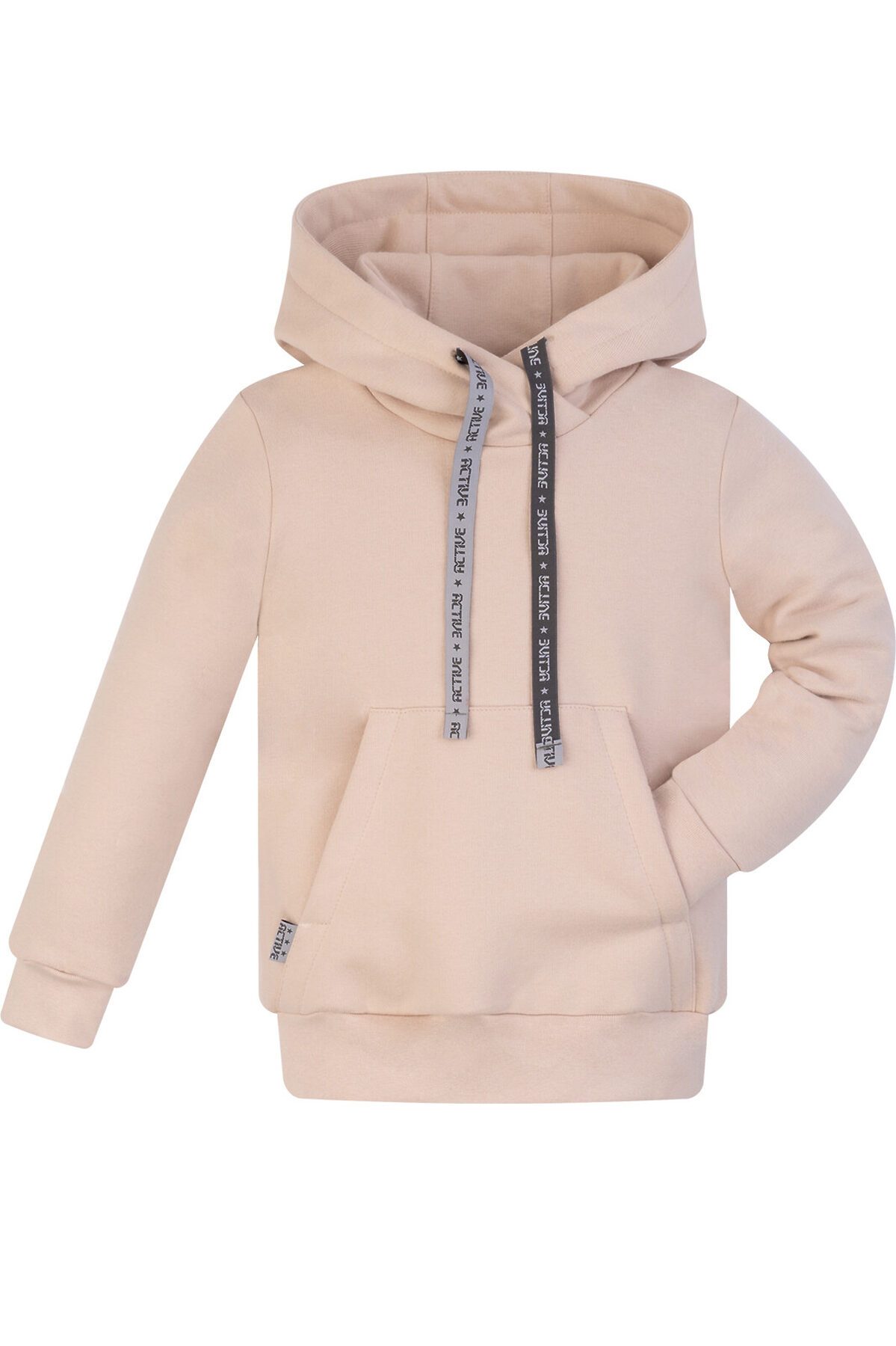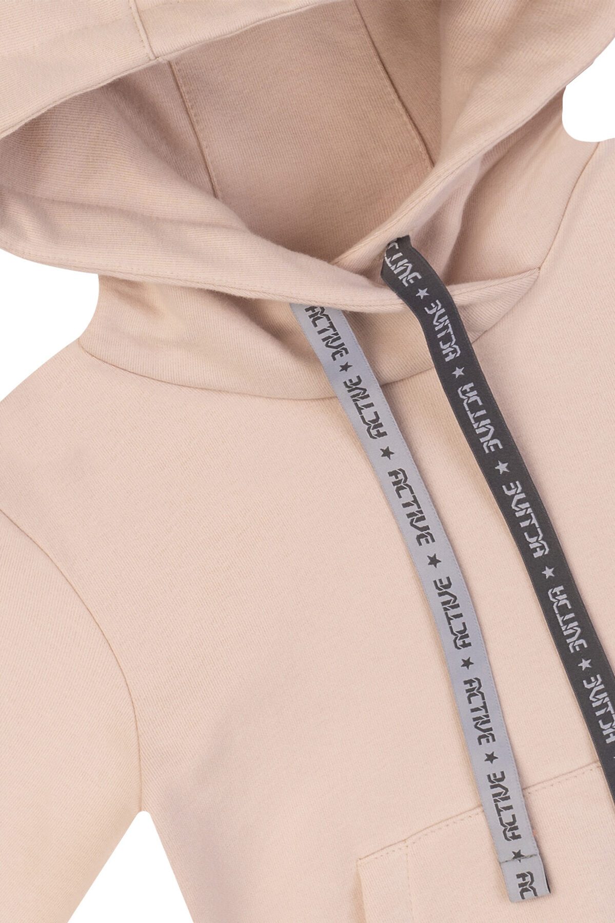 Детский спортивный костюм из однотонного кремового трикотажа футер с начесом. Состоит из уютной свободной толстовки и брюк. Капюшон объемный двухслойный со шнурком для регулировки, спереди карман “кенгуру”. Штаны на широком эластичном поясе также со шнурком. По низу толстовки, штанин и рукавов эластичные манжеты. >