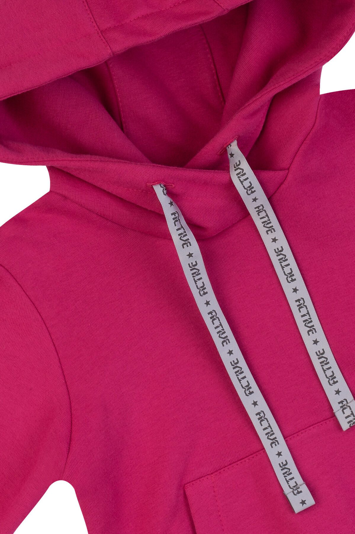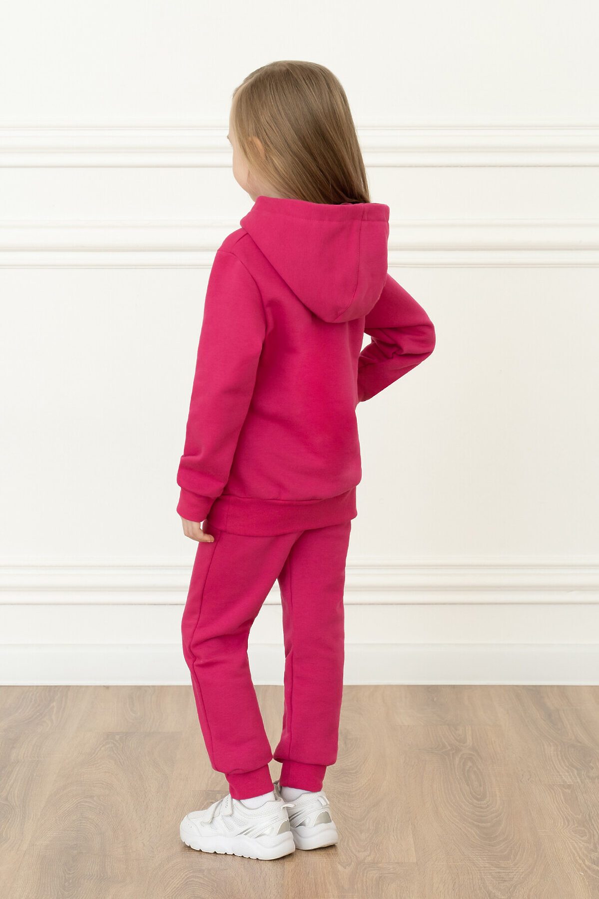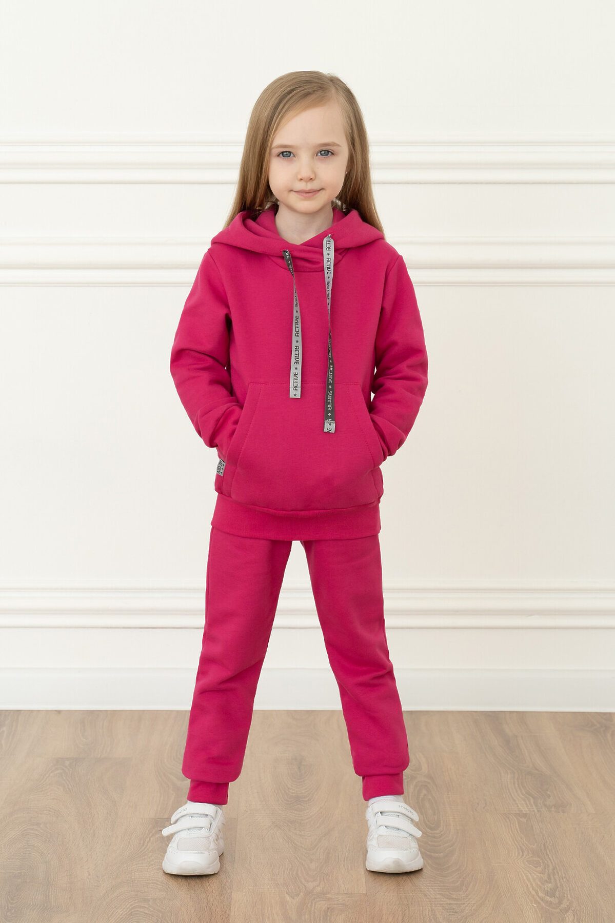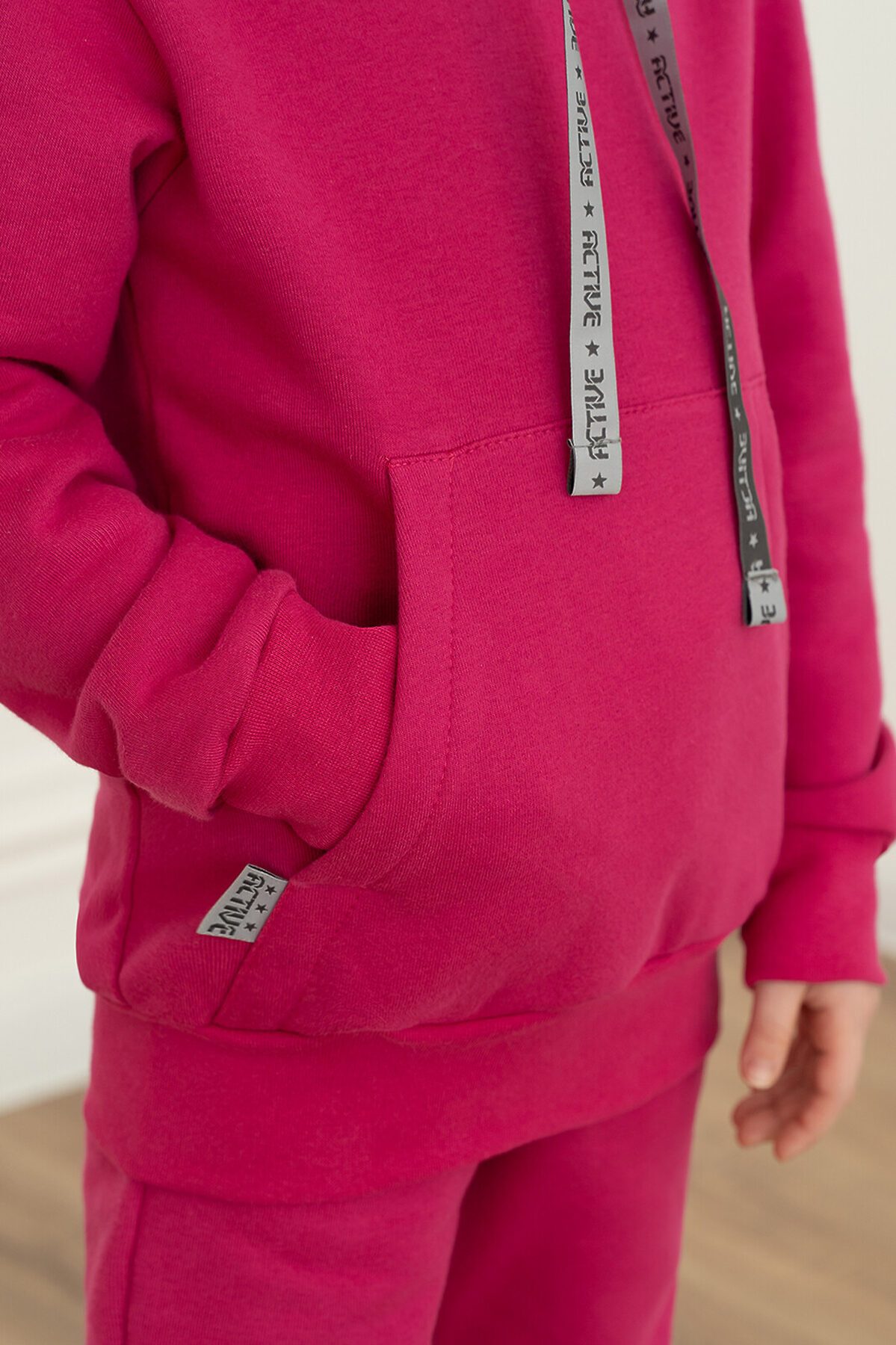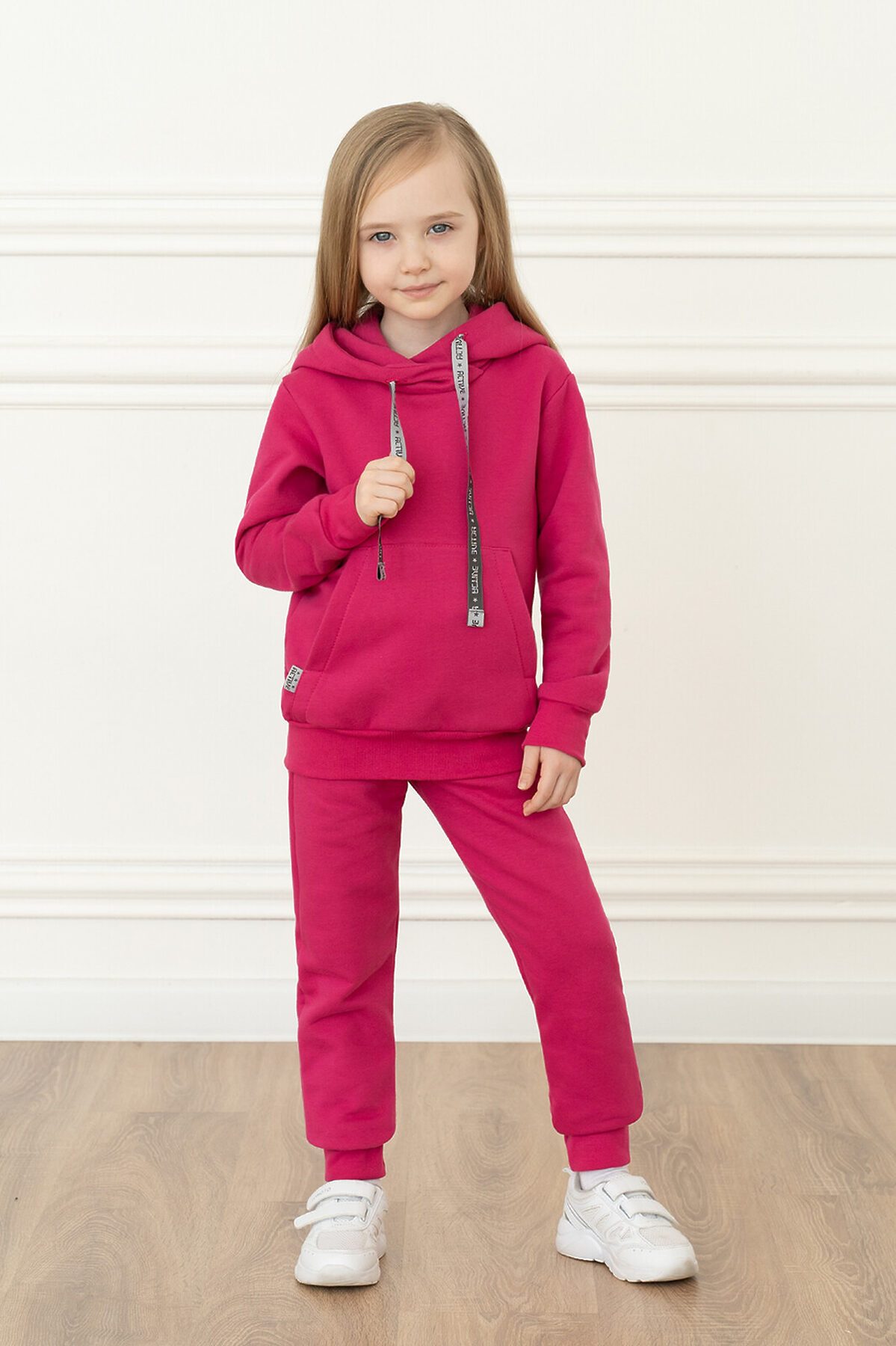 Детский спортивный костюм из однотонного футера с начесом цвета фуксии. Состоит из уютной свободной толстовки и брюк. Капюшон объемный двухслойный со шнурком для регулировки, спереди карман “кенгуру”. Штаны на широком эластичном поясе также со шнурком. По низу толстовки, штанин и рукавов эластичные манжеты. >
