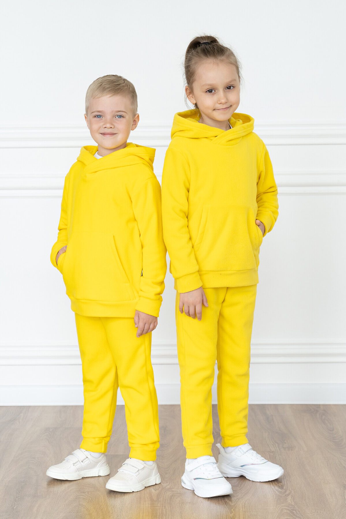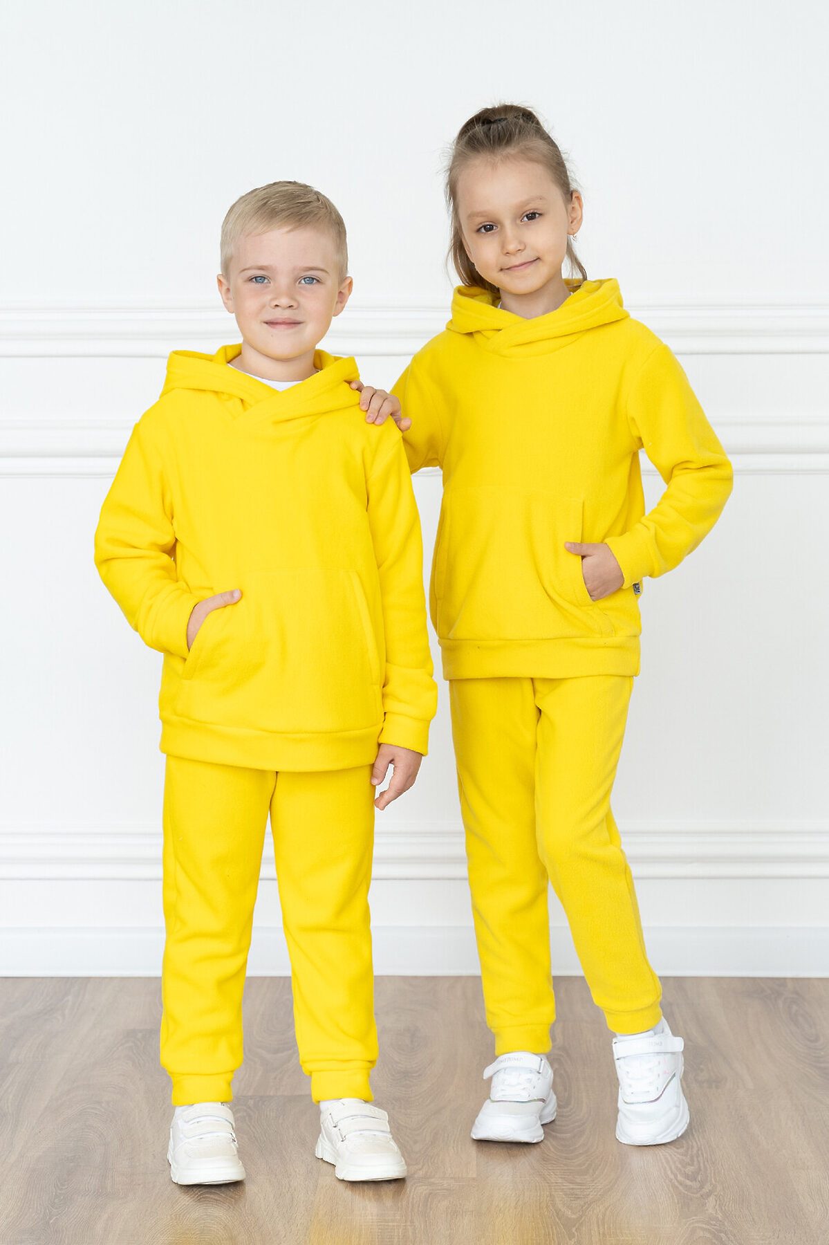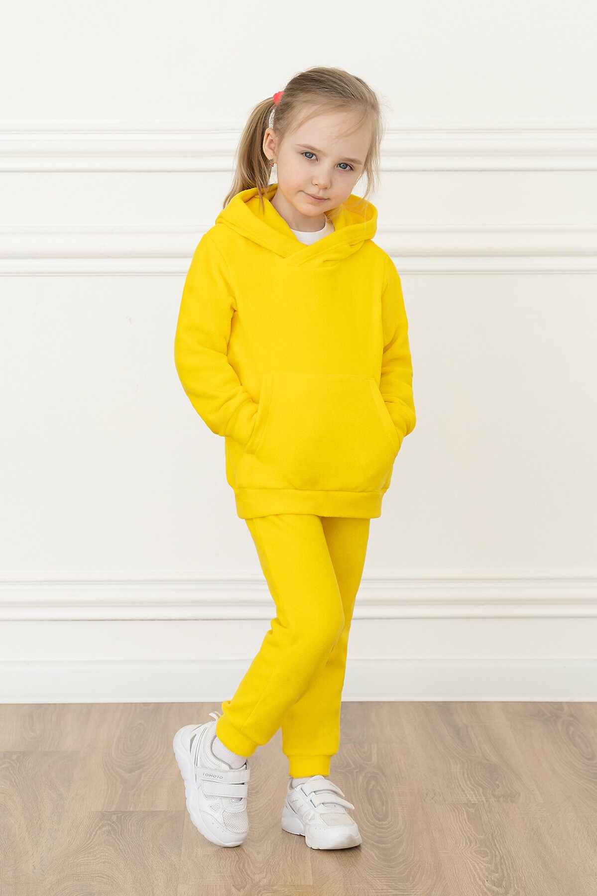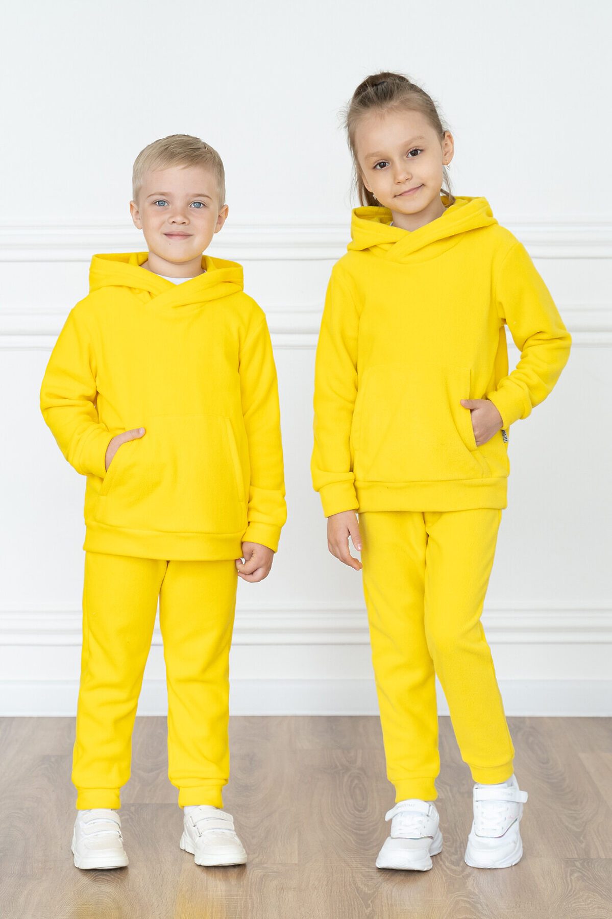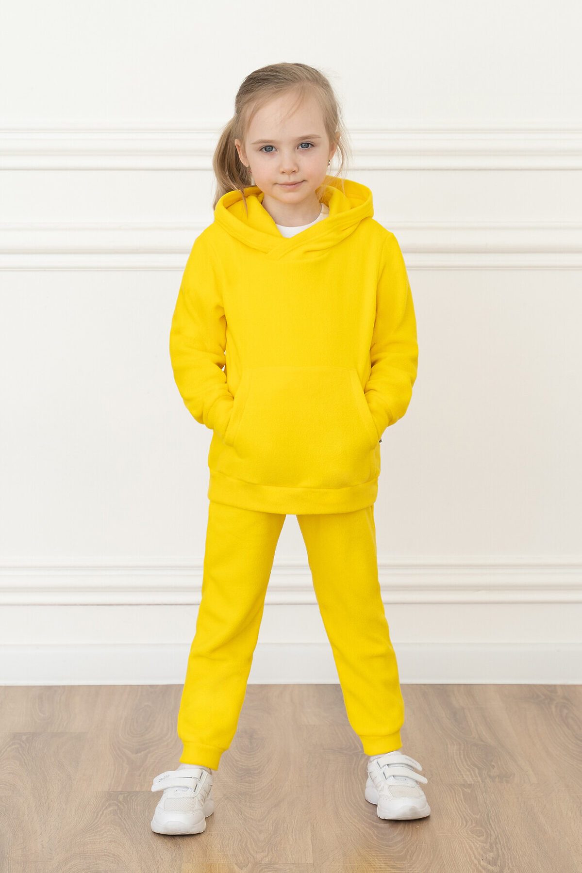 Назначение: детский комплект одежды для занятий спортом, прогулок и дома для мальчиков и девочек. Свойства ткани: прочный, мягкий на ощупь, приятный к телу, тёплый флис. Удерживает тепло и согревает даже во влажном состоянии. Особенности модели: детский флисовый костюм. Брюки на резинке в поясе, манжеты на штанинах. Толстовка с капюшоном и карманом-кенгуру. Низ и рукава на манжете. Костюм сшит в однотонном желтом цвете. >
