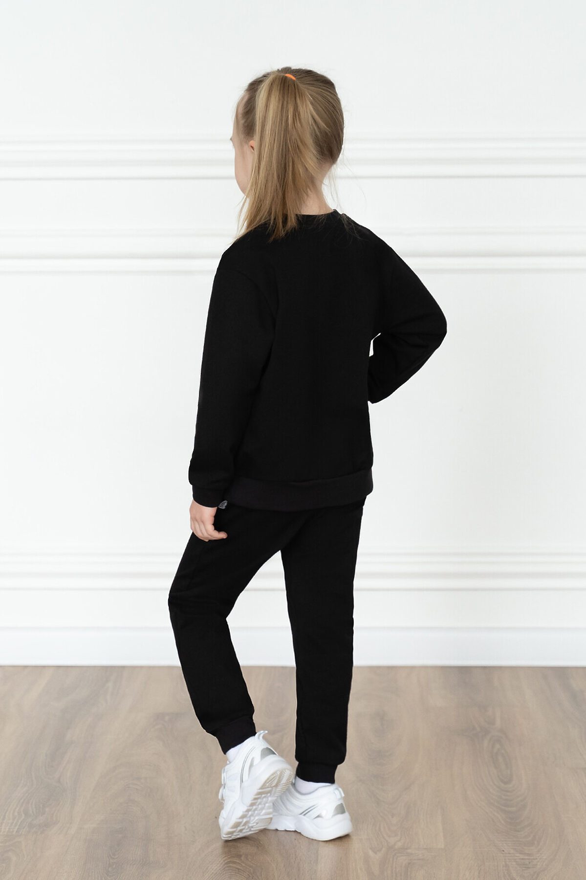 Детский трикотажный спортивный костюм свободного кроя. Свитшот с длинными спущенными рукавами. Горловина эластичная, укреплена киперной лентой. Спереди красивый принт. Штанишки на поясе с резинкой и дополнительным шнурком для лучшей посадки. Низ рукавов, штанин, и свитшота обработаны эластичной мягкой манжетой в цвет. На брючках по бокам карманы. >