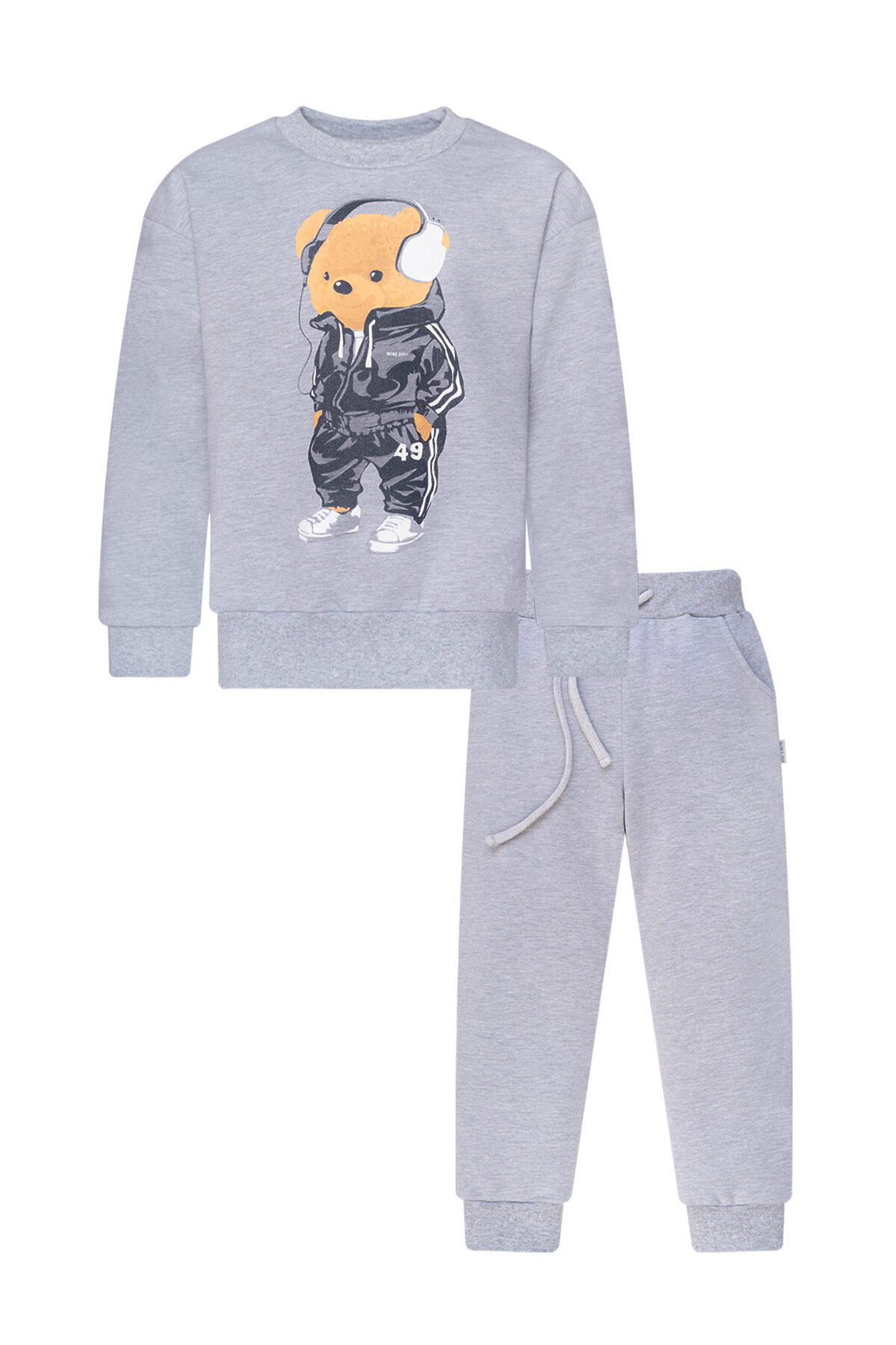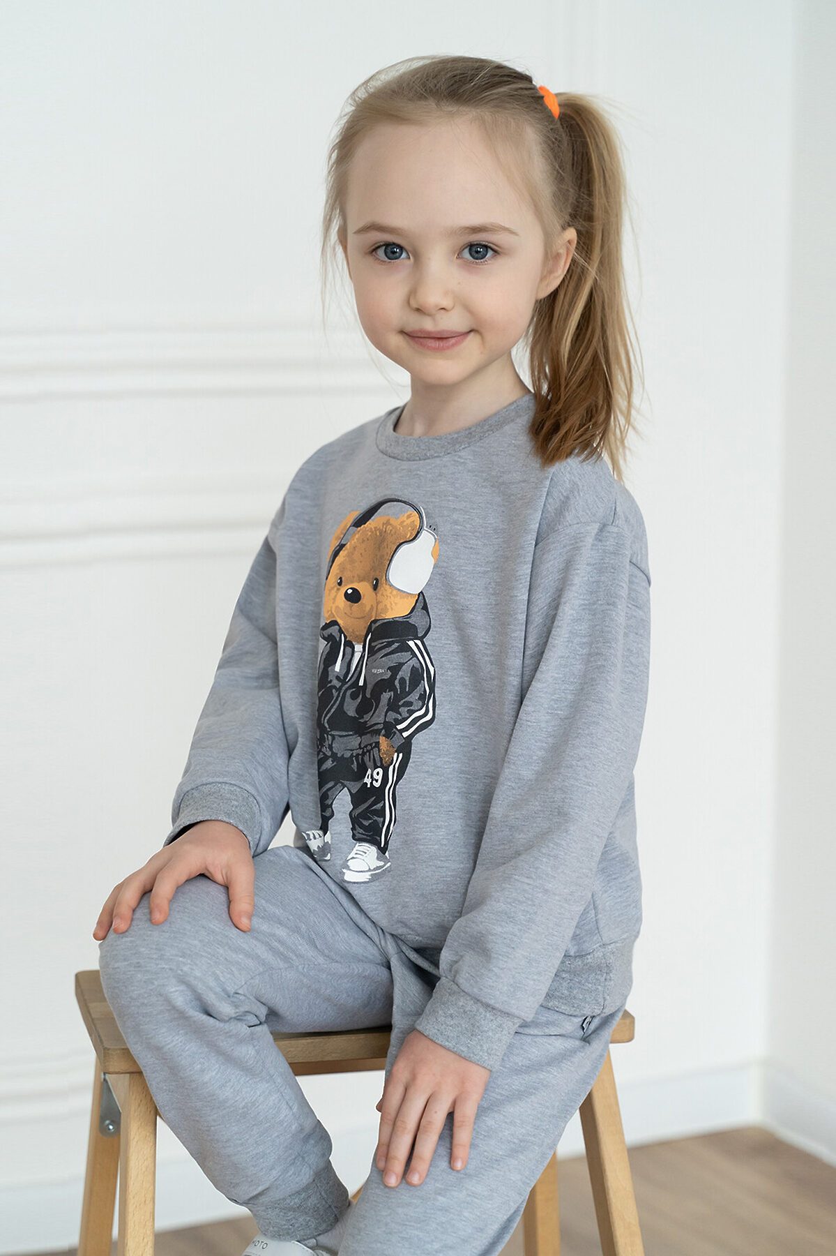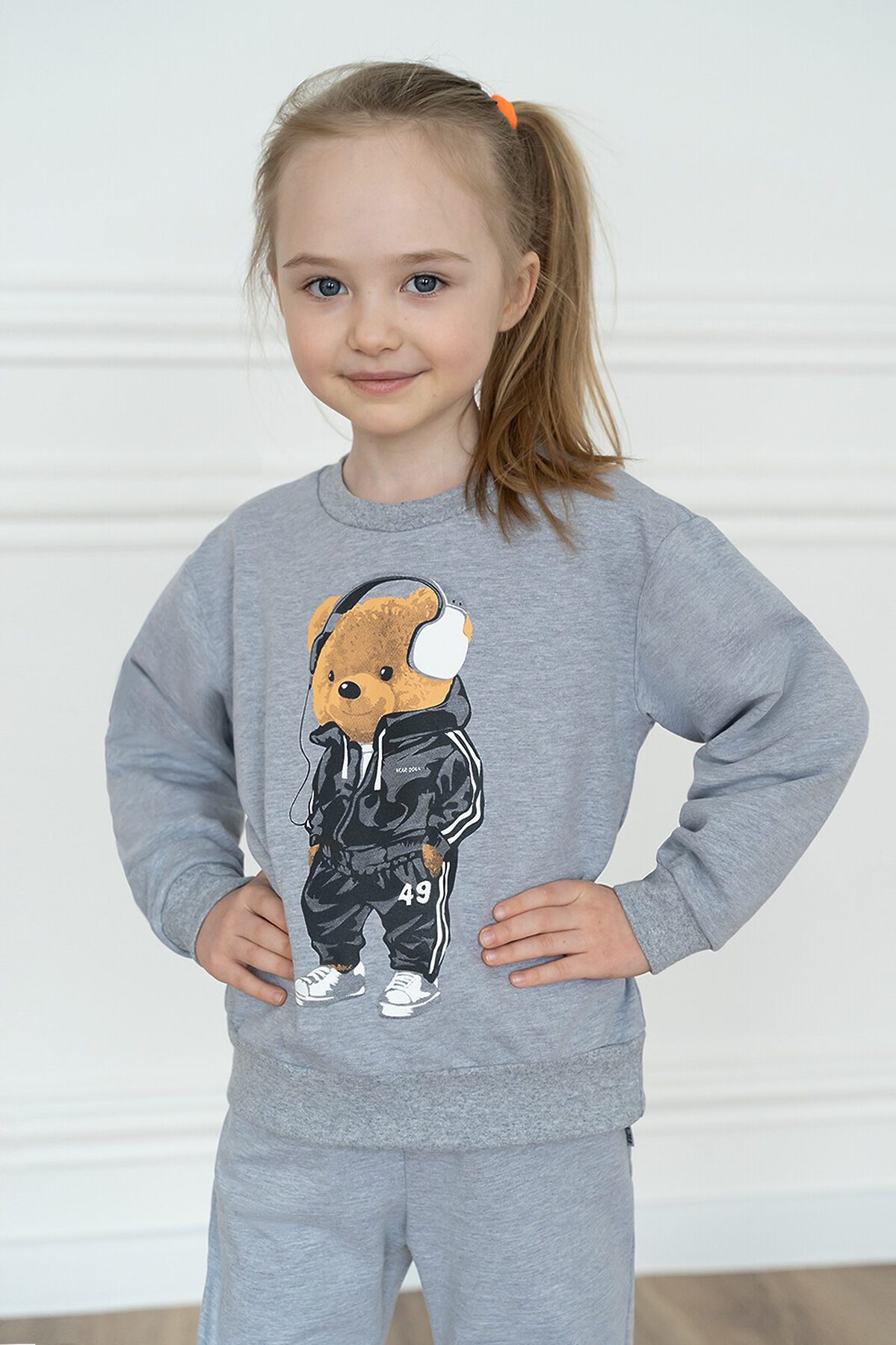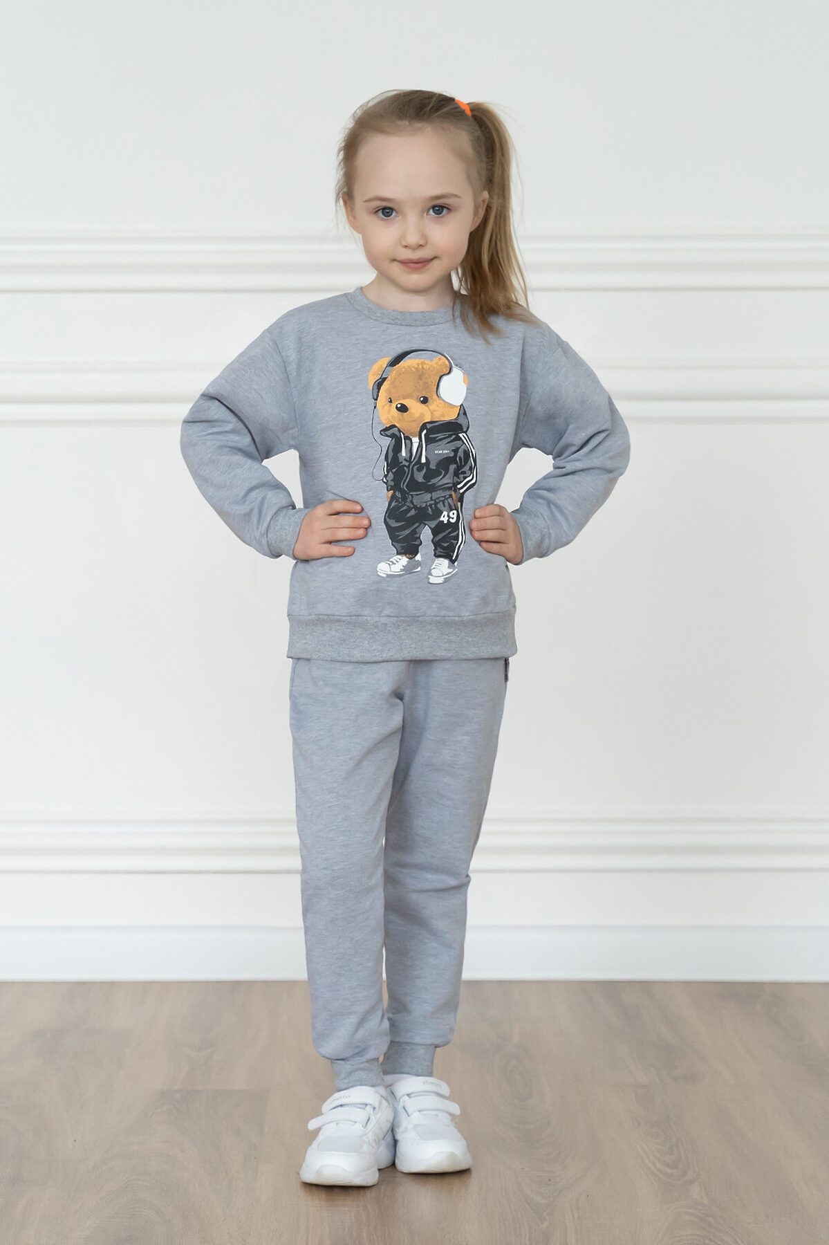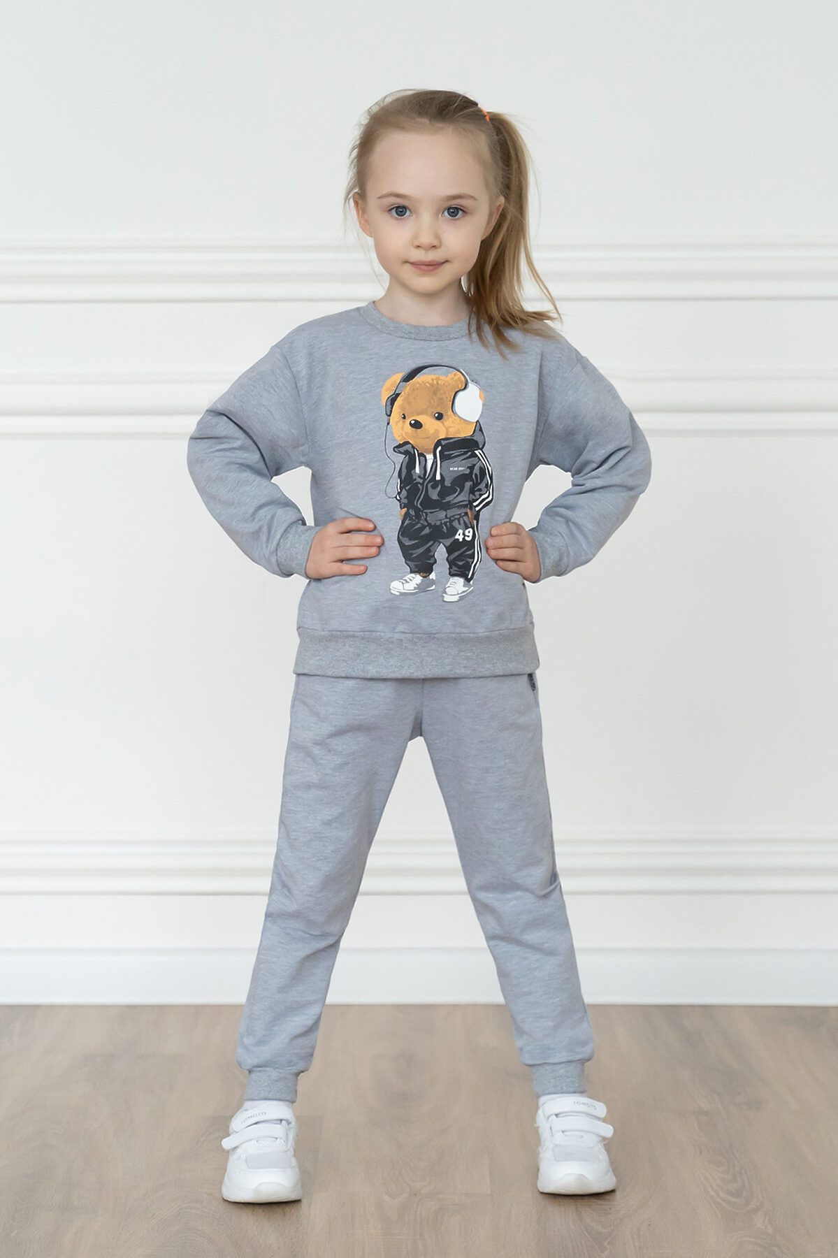 Детский трикотажный спортивный костюм свободного кроя серого меланжевого цвета. Свитшот с длинными спущенными рукавами. Горловина эластичная, укреплена киперной лентой. Спереди красивый принт мишка в наушниках. Штанишки на поясе с резинкой и дополнительным шнурком для лучшей посадки. Низ рукавов, штанин, и свитшота обработаны эластичной мягкой манжетой в цвет. На брючках по бокам карманы. >