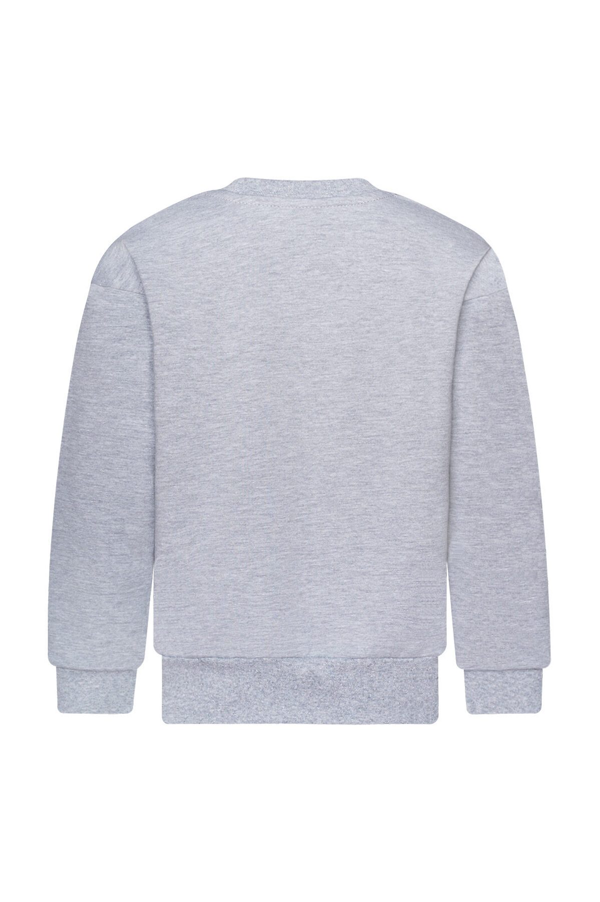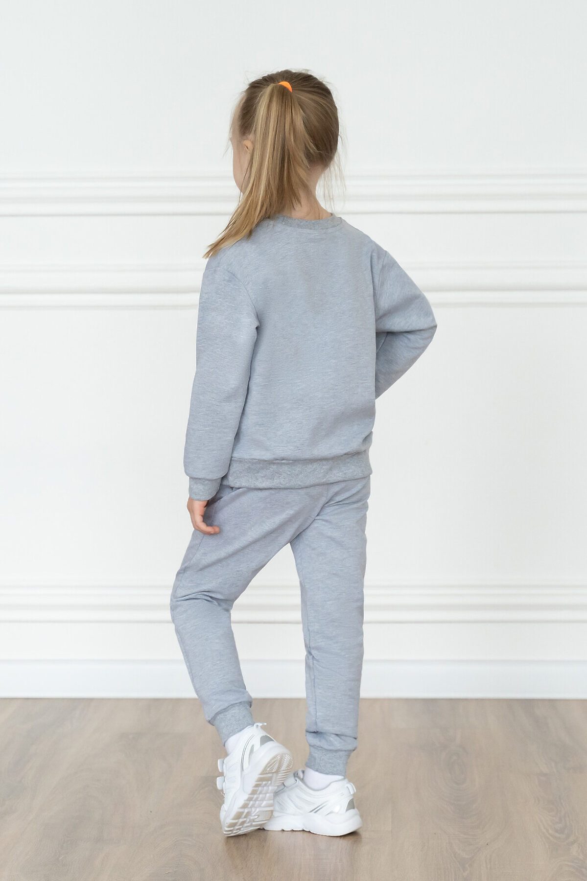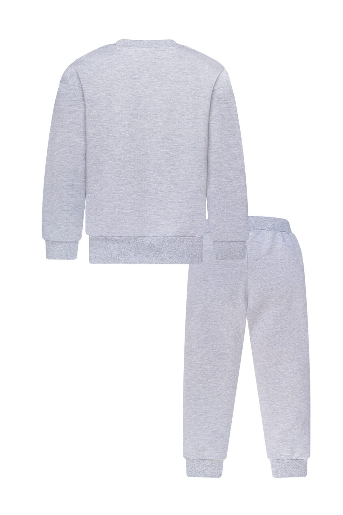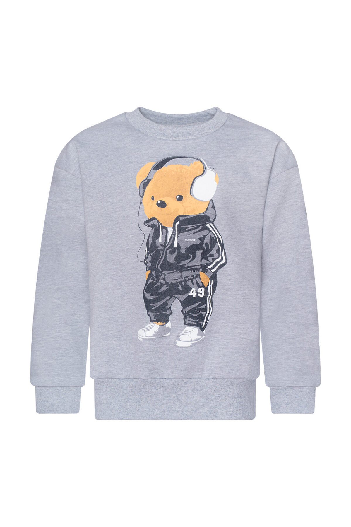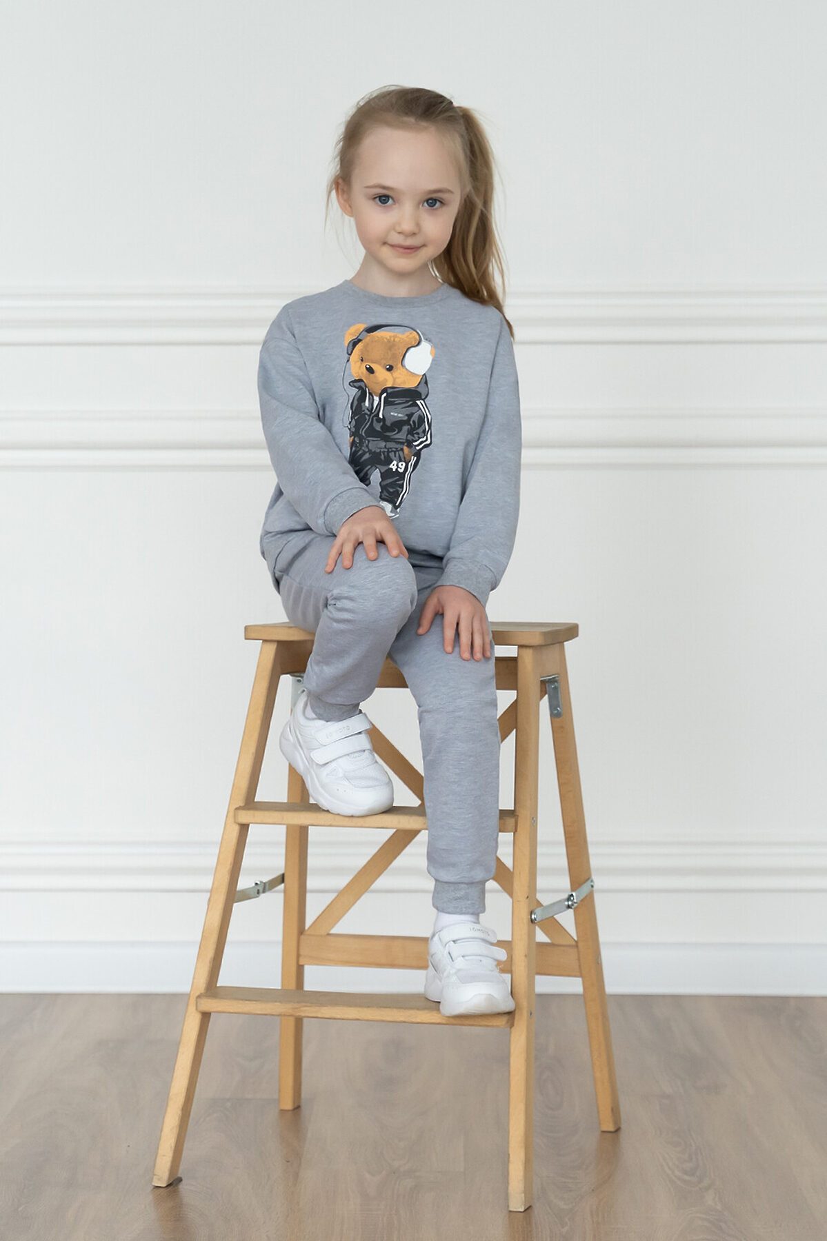 Детский трикотажный спортивный костюм свободного кроя серого меланжевого цвета. Свитшот с длинными спущенными рукавами. Горловина эластичная, укреплена киперной лентой. Спереди красивый принт мишка в наушниках. Штанишки на поясе с резинкой и дополнительным шнурком для лучшей посадки. Низ рукавов, штанин, и свитшота обработаны эластичной мягкой манжетой в цвет. На брючках по бокам карманы. >
