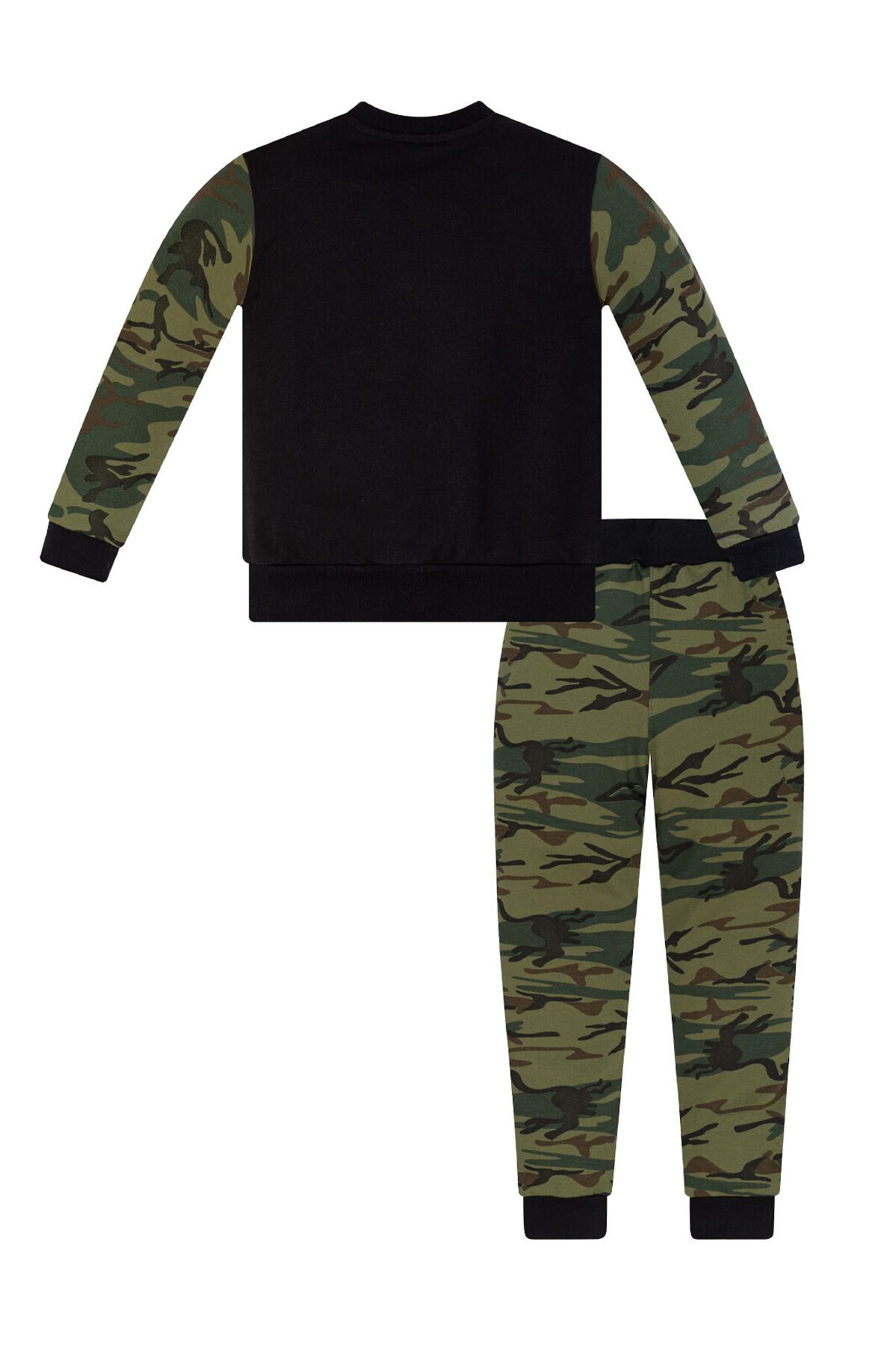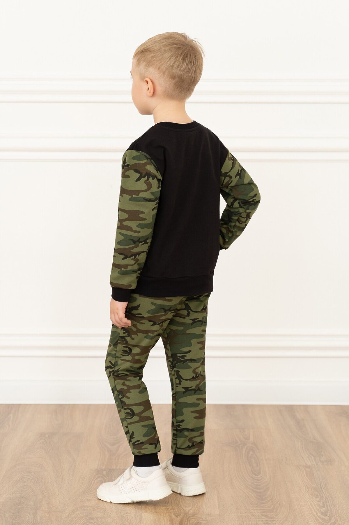 Детский костюм из футера с лайкрой комбинированного однотонного меланжевого и серого камуфляжного цветов. Свитшот с однотонной полочкой и спинкой. Спереди большой красивый принт. Штаны на поясе с резинкой камуфляжного цвета, с дополнительным шнурком для лучшей посадки. По низу рукавов и штанин мягкие эластичные манжеты. Материал, из которого сшит костюм, устойчив к вытягиванию и образованию катышков. Дизайн костюма подходит и мальчикам и девочкам. >