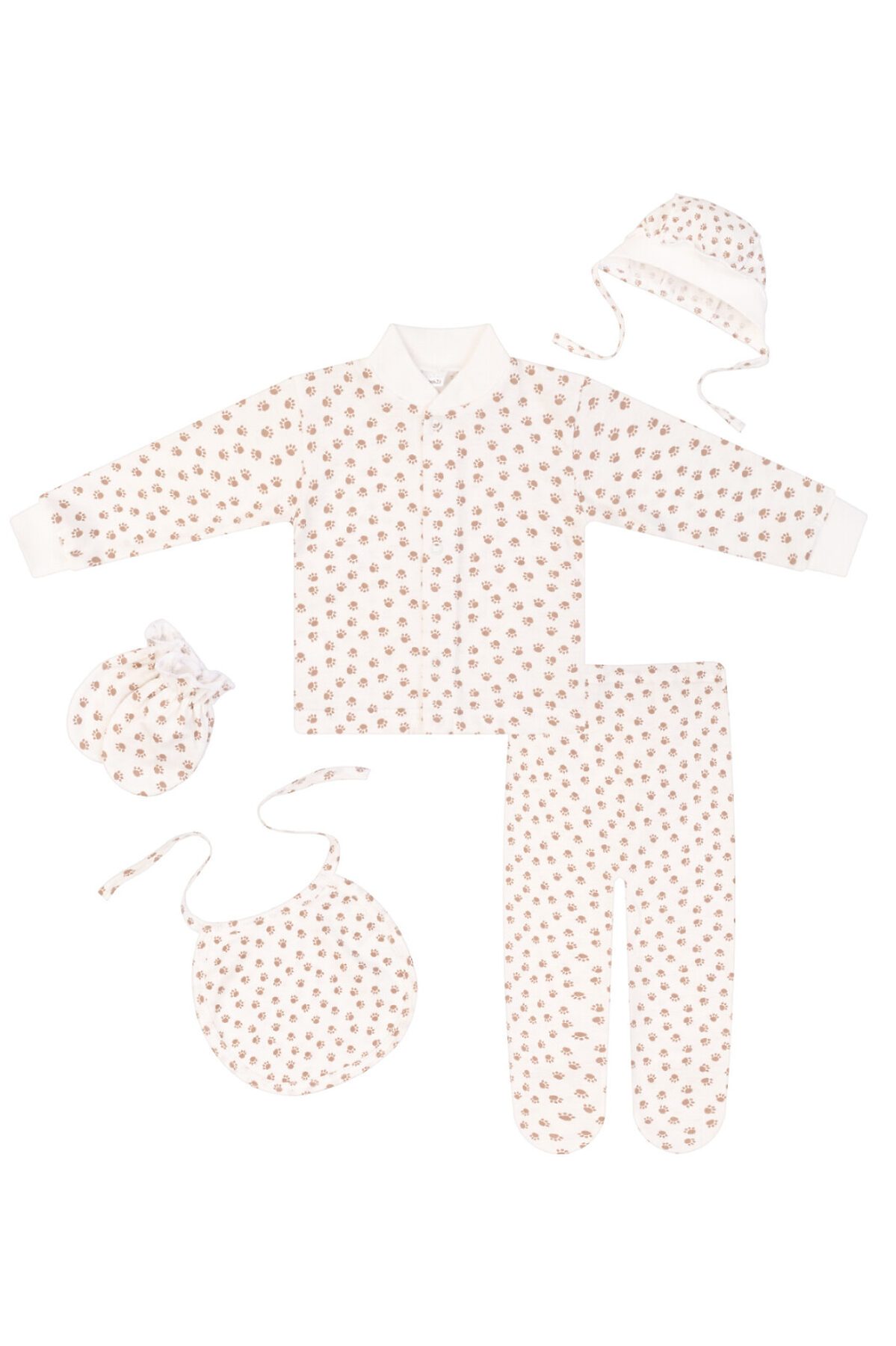 Натуральный, дышащий, приятный к телу трикотаж. Повседневный комплект для детей из пяти предметов. Ясельная кофточка с воротником-стойкой, эластичными манжетами и кнопками-застёжками спереди. Короткие ползунки с закрытыми ножками и на резинке в поясе. Чепчик на завязках, с эластичной манжетой, выполнен швами наружу. Рукавички-антицарапки на тонкой резинке. Двухслойный фартук на завязках, по краю обработан трикотажный бейкой. >