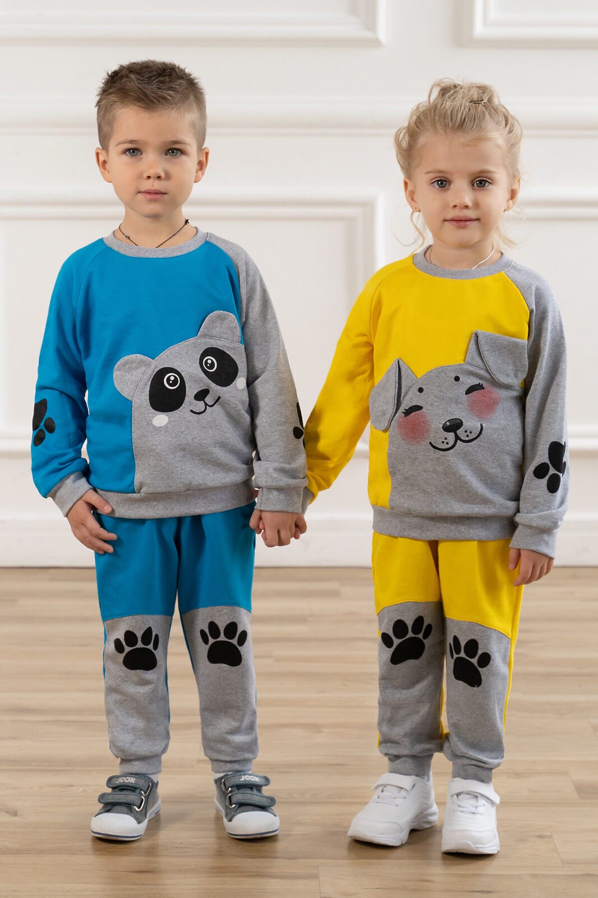 Трикотажный костюм для прогулок в прохладную погоду состоит из брюк свободного кроя и удобной толстовки. Комплект сшит из нежного, плотного, стойкого к быстрому изнашиванию хлопкового футера. Брюки выполнены с глубокими боковыми карманами, плотными манжетами внизу штанин и мягким поясом на резинке. Горловина толстовки оформлена окантовочной бейкой, подол и низ рукавов-регланов отделаны манжетами. Эффектное сочетание серого и кораллового цвета красиво перекликается с рисунком симпатичной собаки на толстовке. >