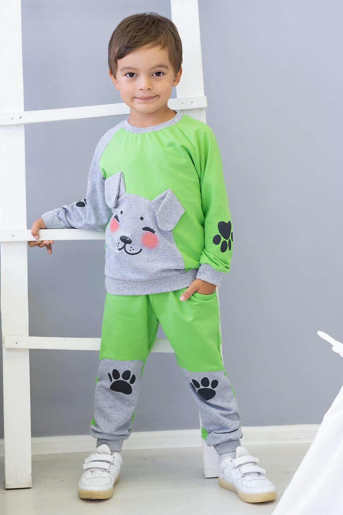 Трикотажный костюм для прогулок в прохладную погоду состоит из брюк свободного кроя и удобной толстовки. Комплект сшит из нежного, плотного, стойкого к быстрому изнашиванию хлопкового футера. Брюки выполнены с глубокими боковыми карманами, плотными манжетами внизу штанин и мягким поясом на резинке. Горловина толстовки оформлена окантовочной бейкой, подол и низ рукавов-регланов отделаны манжетами. Эффектное сочетание серого и кораллового цвета красиво перекликается с рисунком симпатичной собаки на толстовке. >
