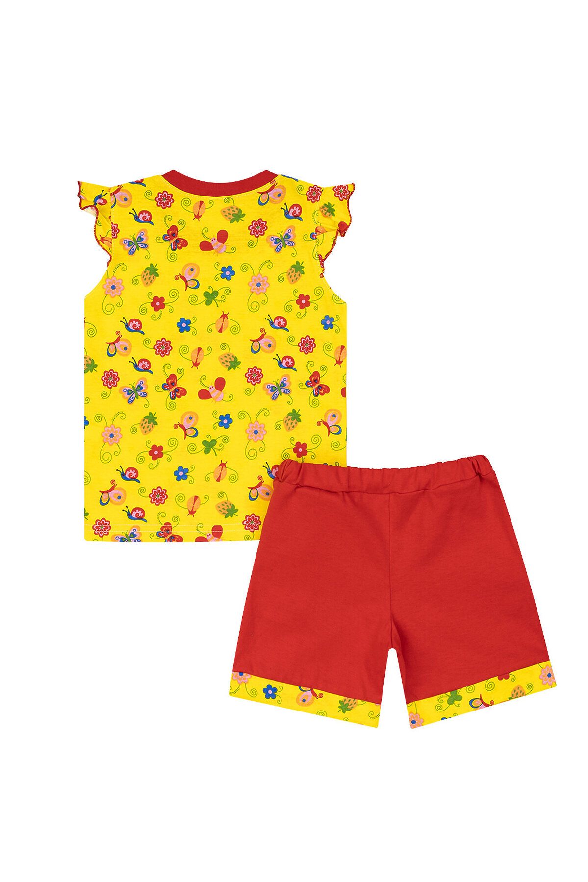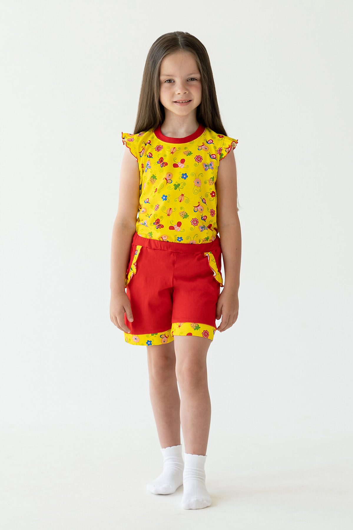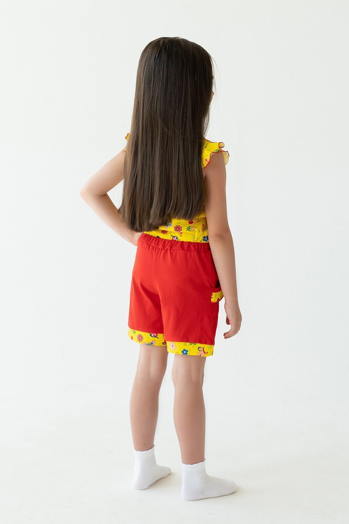 Комплект для девочки из майки и шорт из нежной дышащей хлопковой кулирки. Трикотажная маечка желтого цвета с небольшими воланчиками на плечах с милым принтом, который понравится малышке. Шортики свободного кроя однотонного контрастного красного цвета, широкий пояс на резинке, два кармашка. Воланчики на карманах и манжета по низу шорт отделаны сделаны из материала маечки. >
