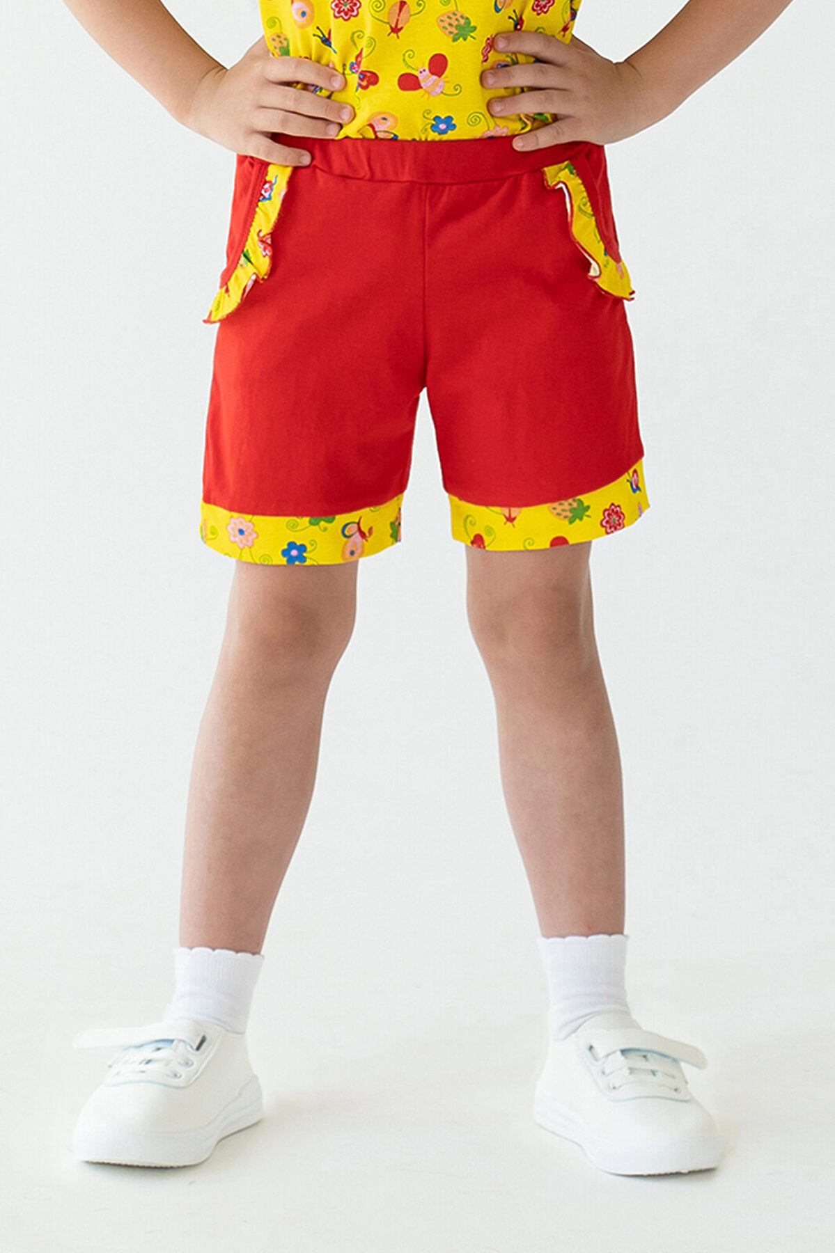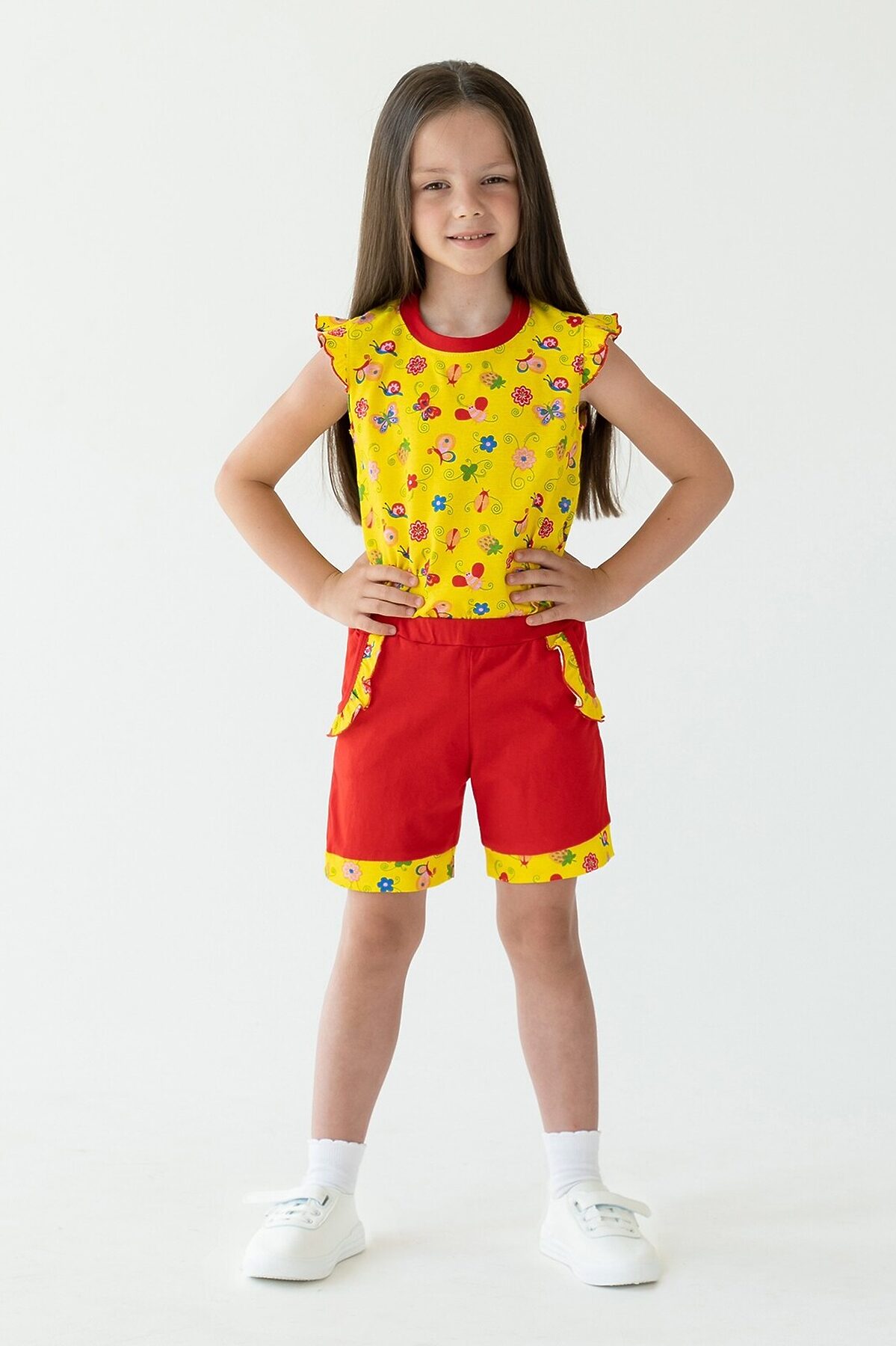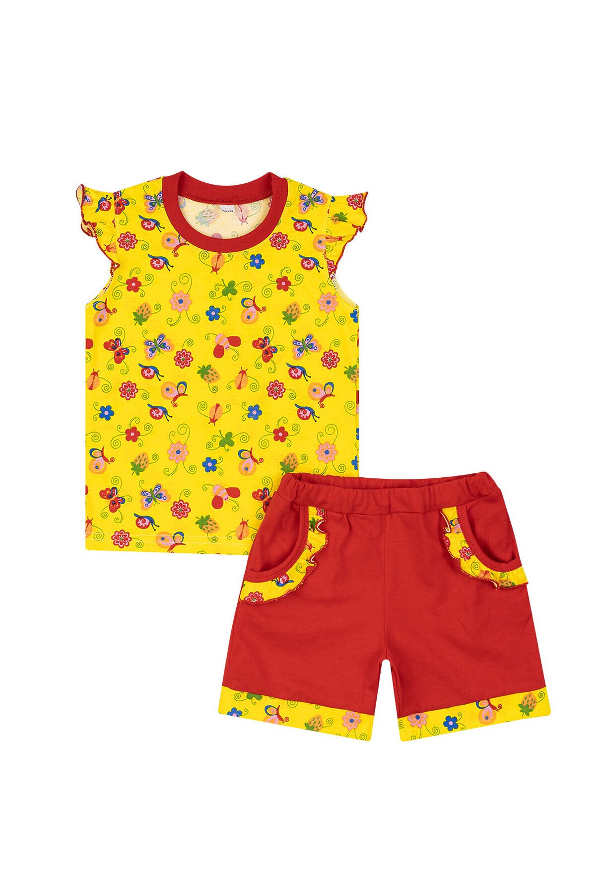 Комплект для девочки из майки и шорт из нежной дышащей хлопковой кулирки. Трикотажная маечка желтого цвета с небольшими воланчиками на плечах с милым принтом, который понравится малышке. Шортики свободного кроя однотонного контрастного красного цвета, широкий пояс на резинке, два кармашка. Воланчики на карманах и манжета по низу шорт отделаны сделаны из материала маечки. >