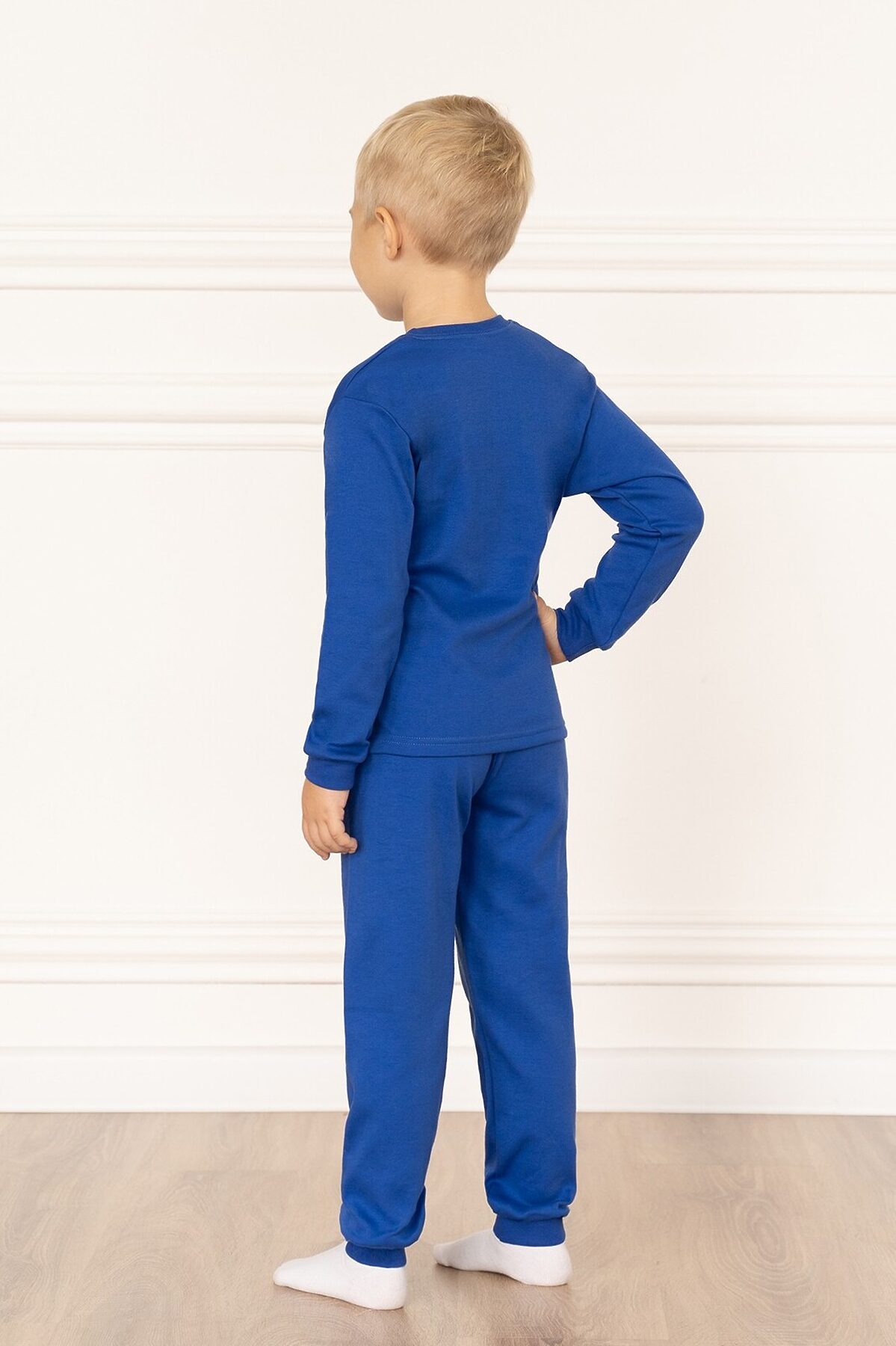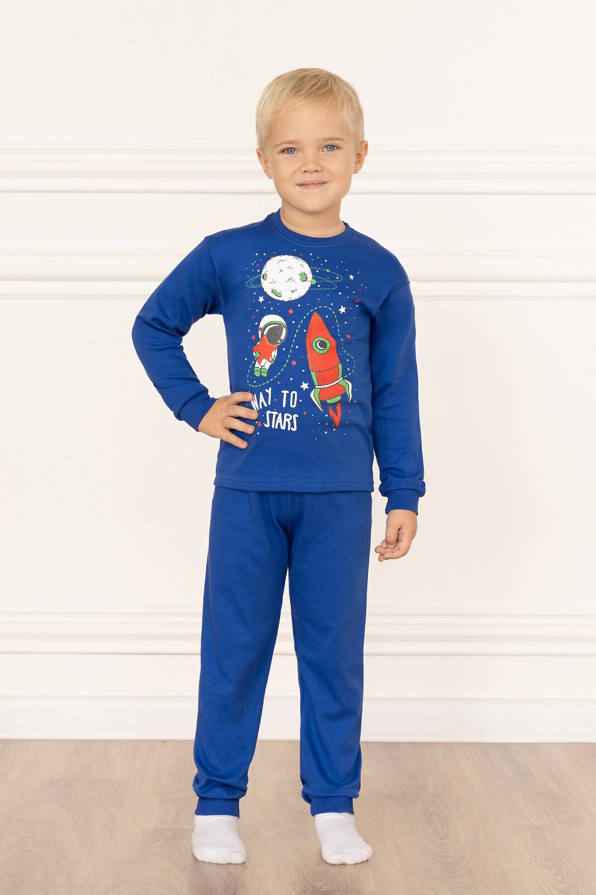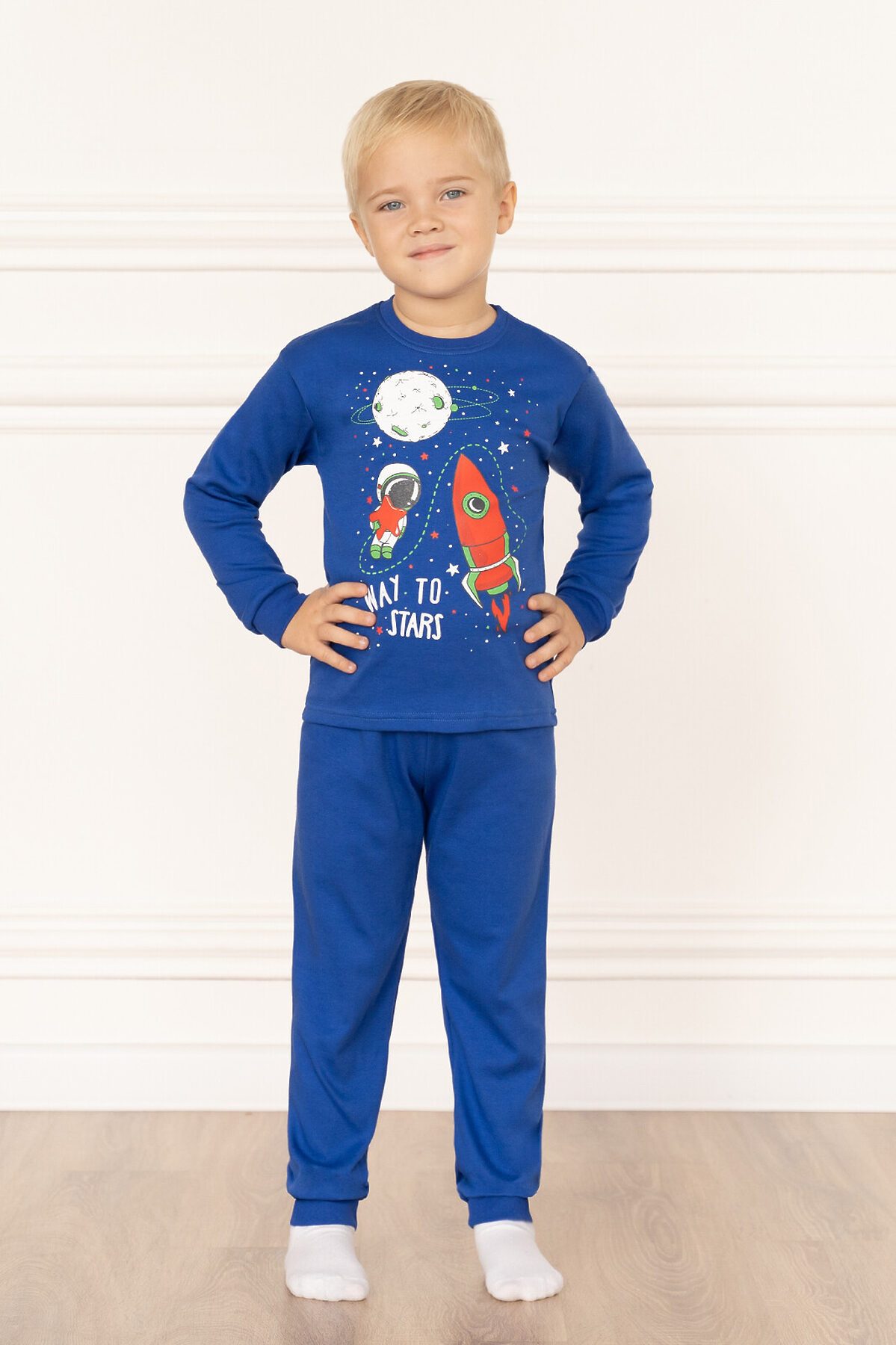 Детская пижама свободного кроя из свитшота и брючек на поясе с резинкой василькового цвета. Комплект сшит из нежного хлопкового интерлока. На рукавах и штанинах мягкие манжеты, горловина обработана эластичной бейкой, в цвет пижамы. Спереди свитшота большой принт астронавт и ракета. В этой пижаме ничего не будет сковывать движения ребенка, ему будет комфортно спать. Хорошо подходит для дома и детского сада, а также для пижамных вечеринок. >