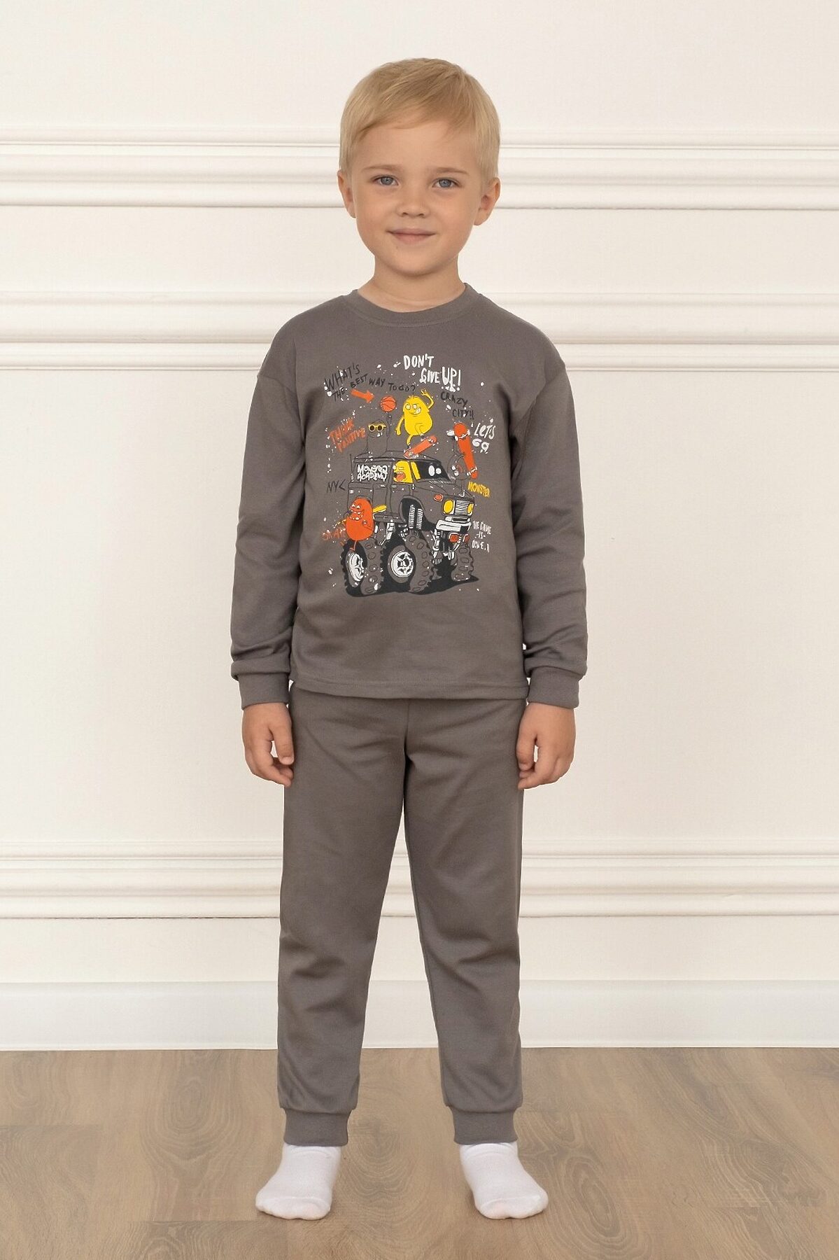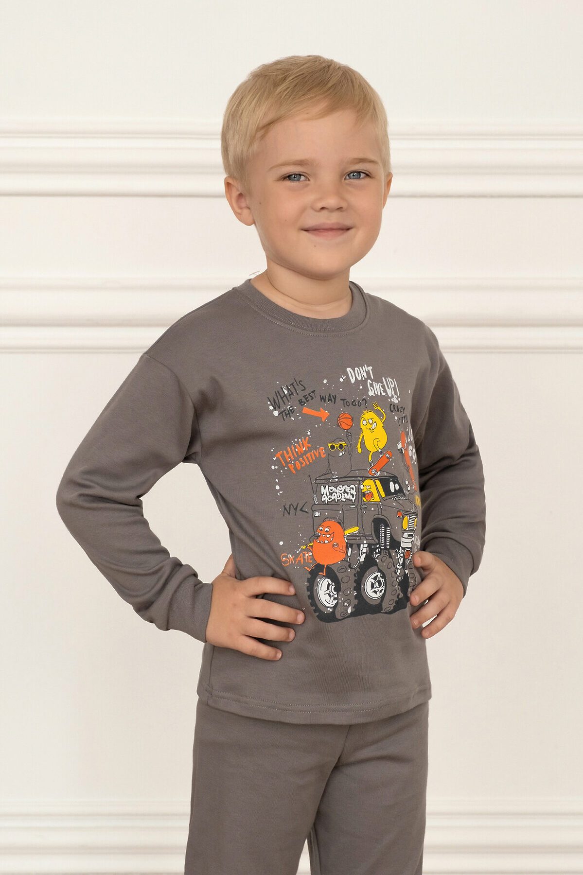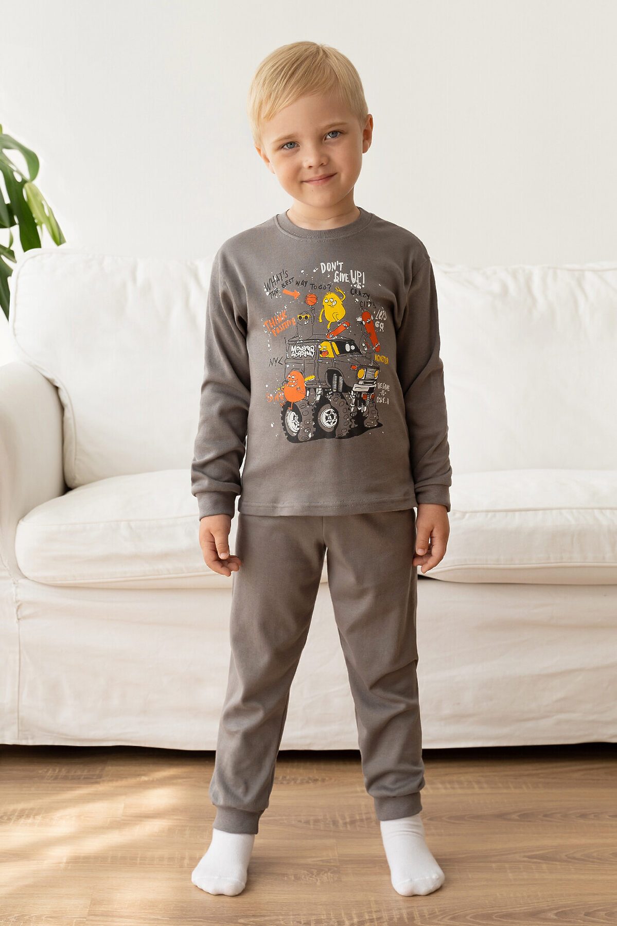 Детская пижама свободного кроя из свитшота и брючек на поясе с резинкой серого цвета. Комплект сшит из нежного хлопкового интерлока. На рукавах и штанинах мягкие манжеты, горловина обработана эластичной бейкой, в цвет пижамы или контрастного серого цвета. Спереди свитшота большой принт монстрики. В этой пижаме ничего не будет сковывать движения ребенка, ему будет комфортно спать. Хорошо подходит для дома и детского сада, а также для пижамных вечеринок. >