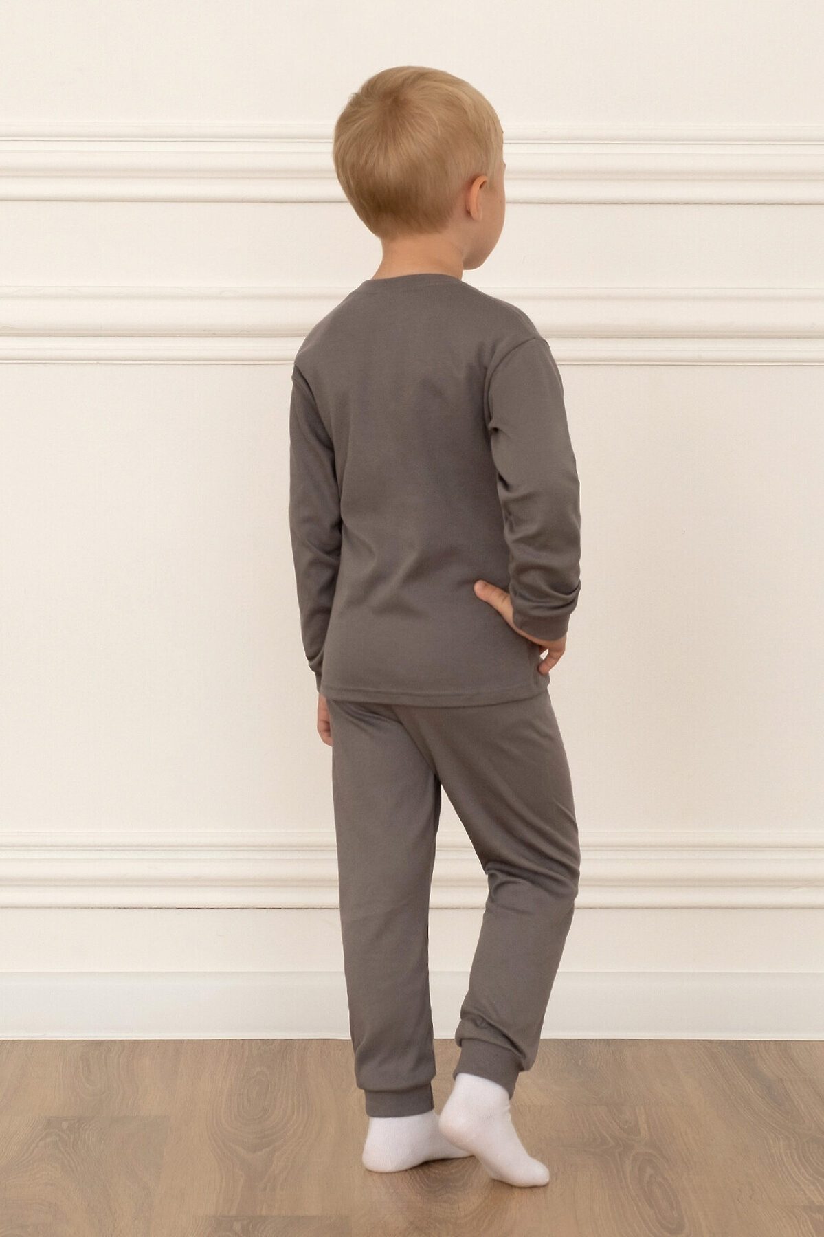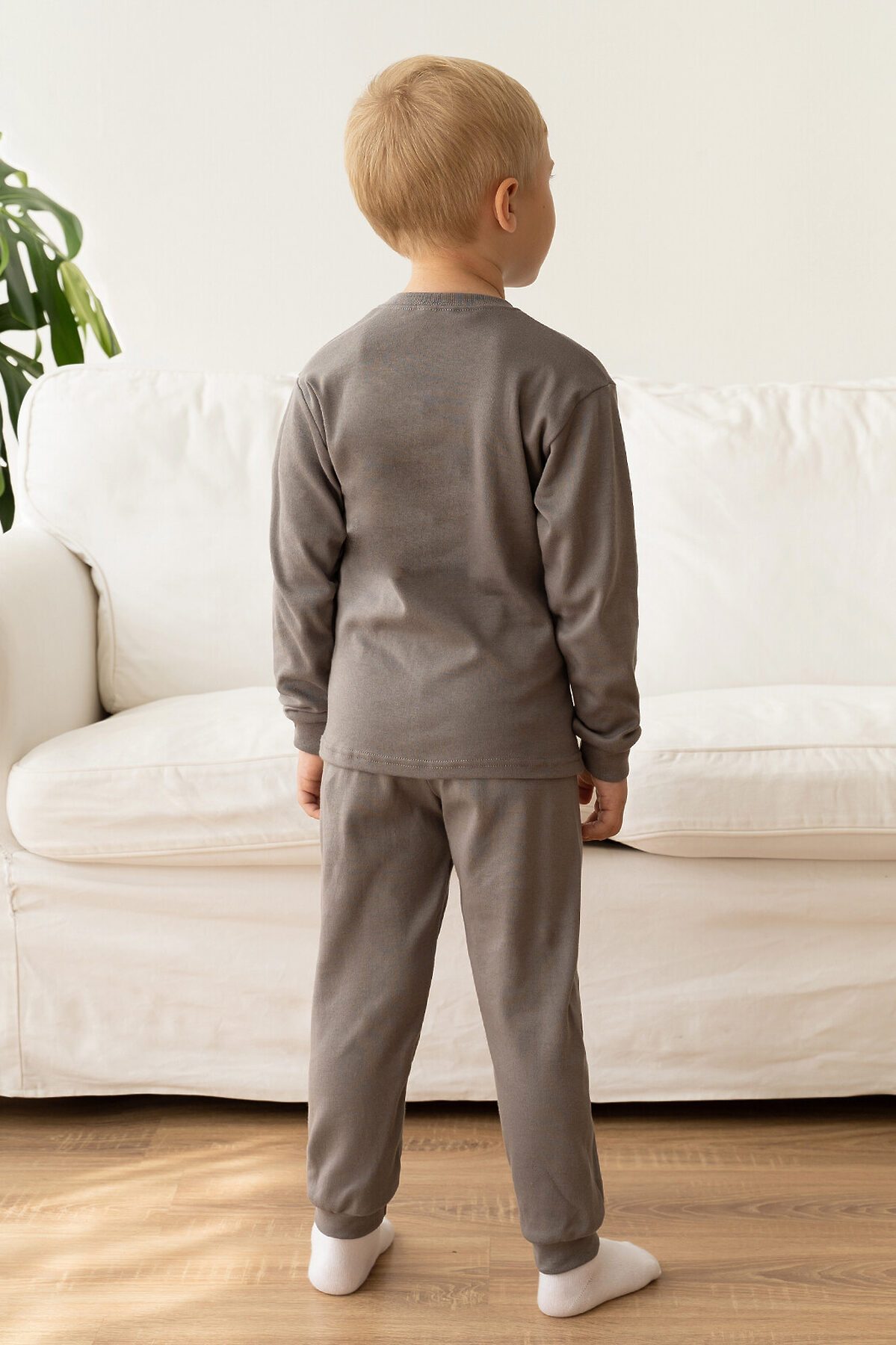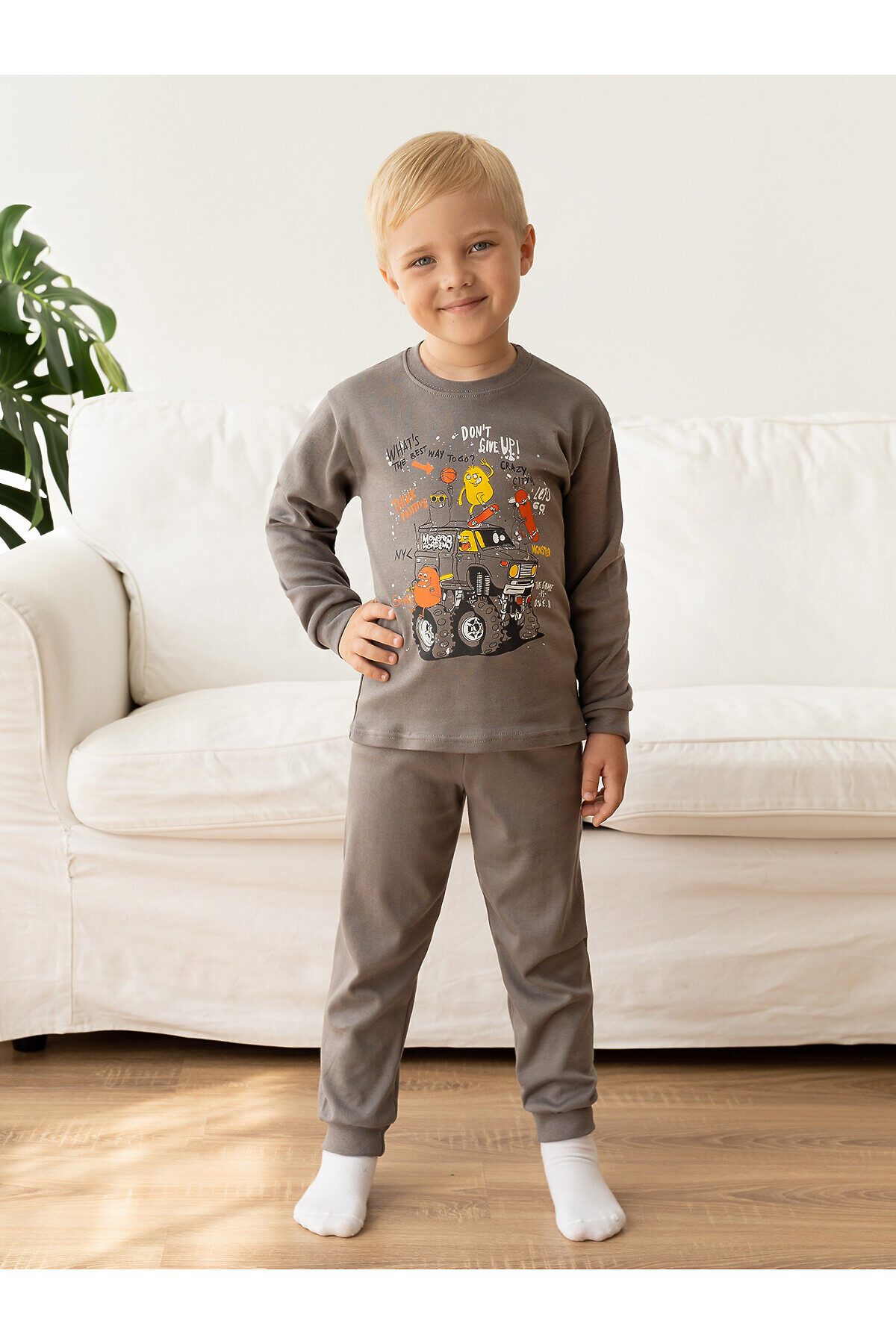 Детская пижама свободного кроя из свитшота и брючек на поясе с резинкой серого цвета. Комплект сшит из нежного хлопкового интерлока. На рукавах и штанинах мягкие манжеты, горловина обработана эластичной бейкой, в цвет пижамы или контрастного серого цвета. Спереди свитшота большой принт монстрики. В этой пижаме ничего не будет сковывать движения ребенка, ему будет комфортно спать. Хорошо подходит для дома и детского сада, а также для пижамных вечеринок. >