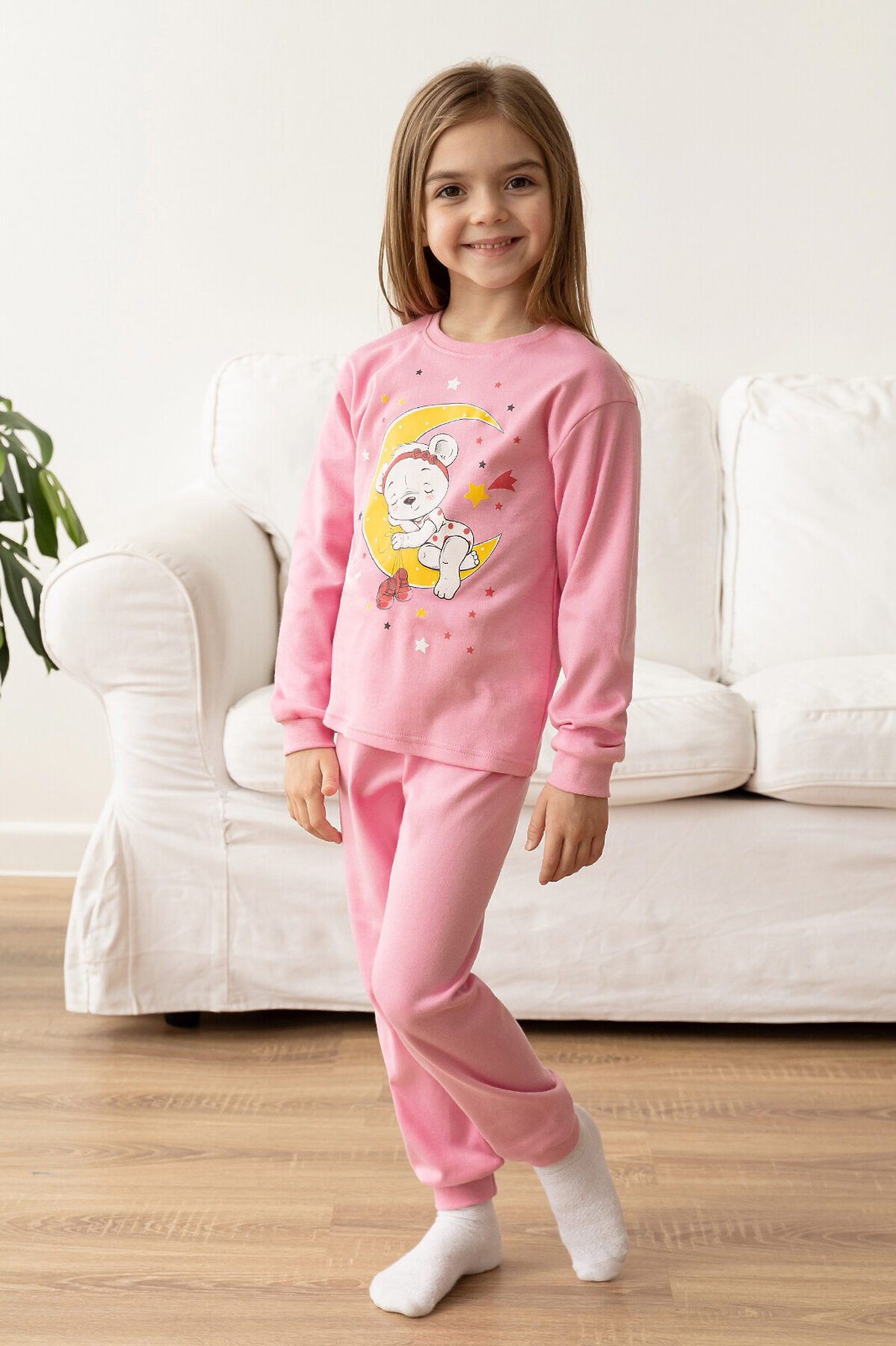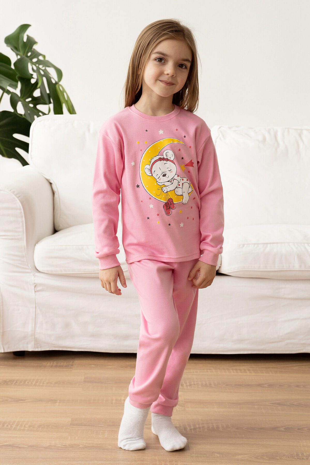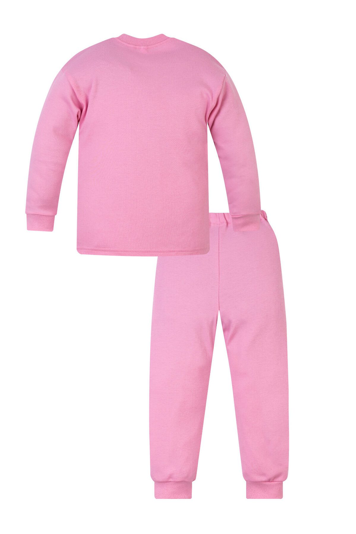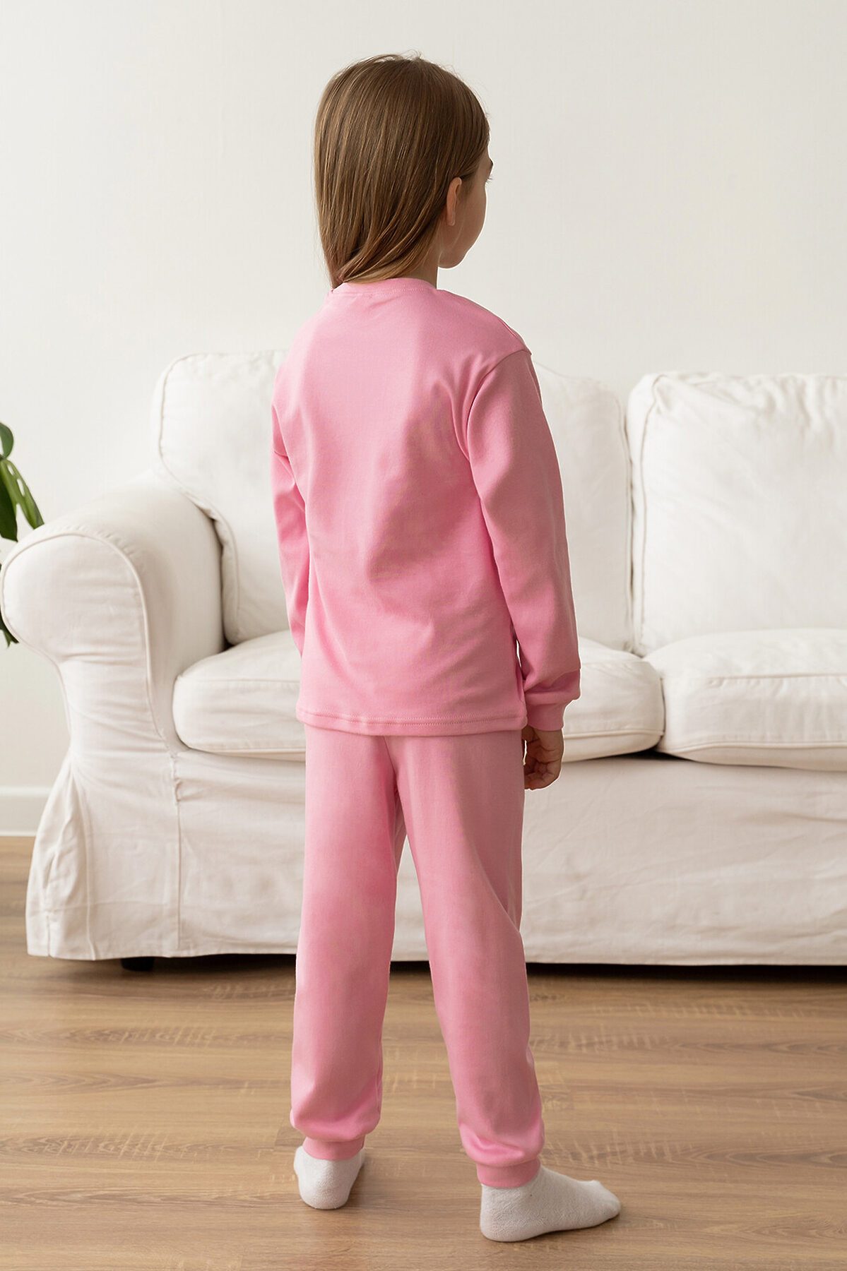Детская пижама свободного кроя для девочек розовая из свитшота и брючек на поясе с резинкой. Комплект сшит из нежного хлопкового интерлока. На рукавах и штанинах мягкие манжеты, горловина обработана эластичной бейкой, в цвет пижамы или контрастного серого цвета. Спереди свитшота большой принт. В этой пижаме ничего не будет сковывать движения ребенка, ему будет комфортно спать. Хорошо подходит для дома и детского сада, а также для пижамных вечеринок. >
