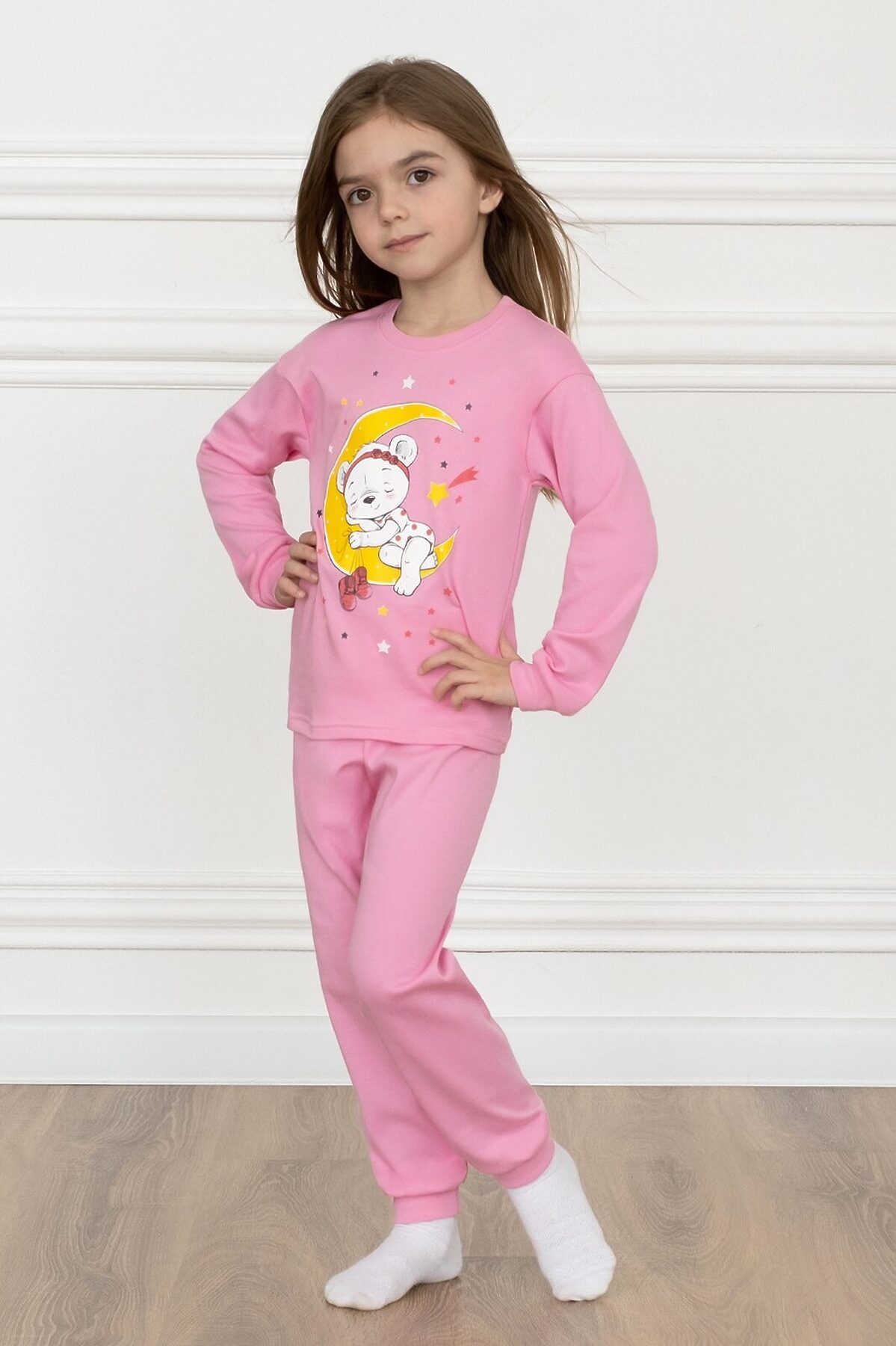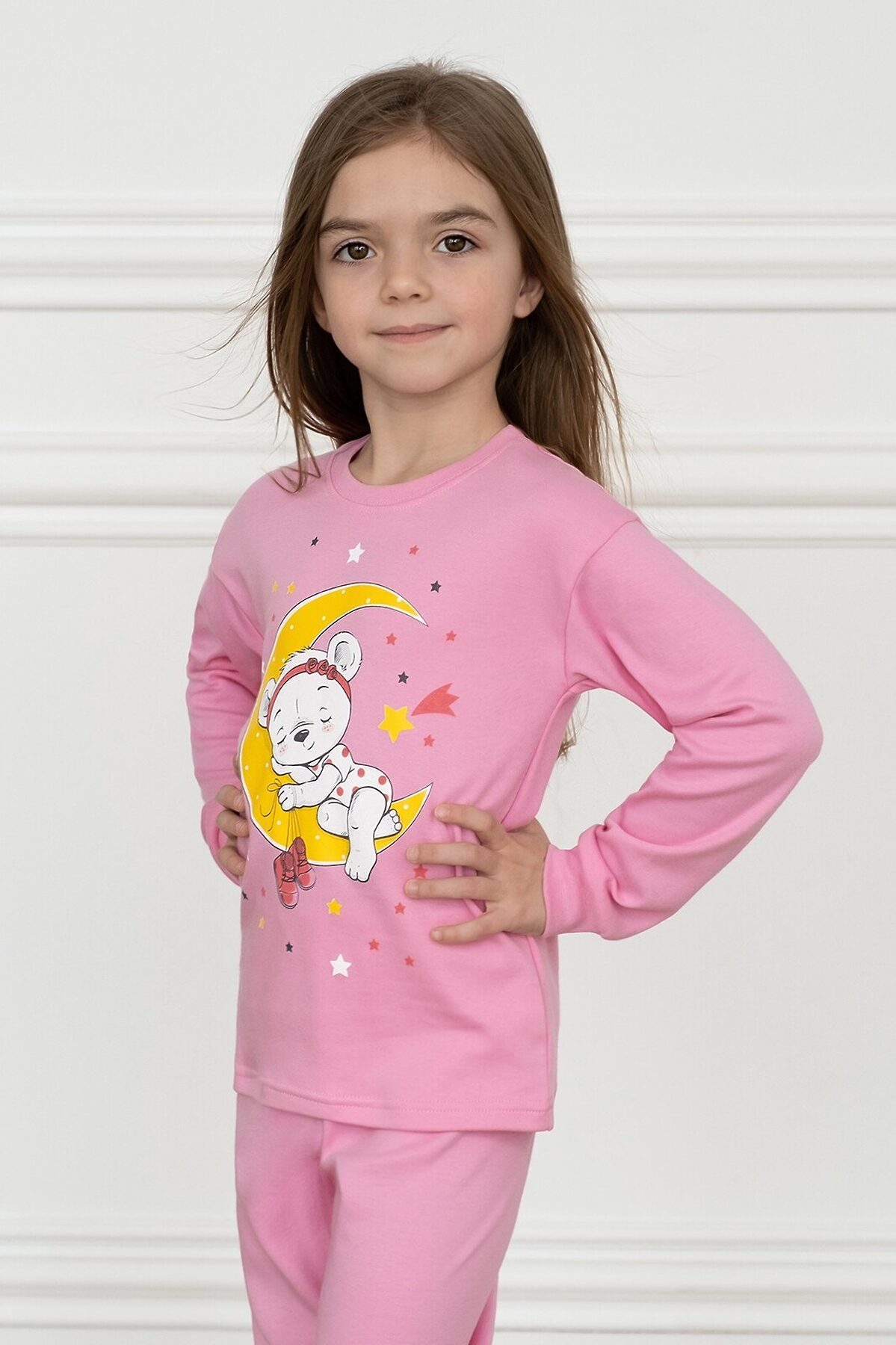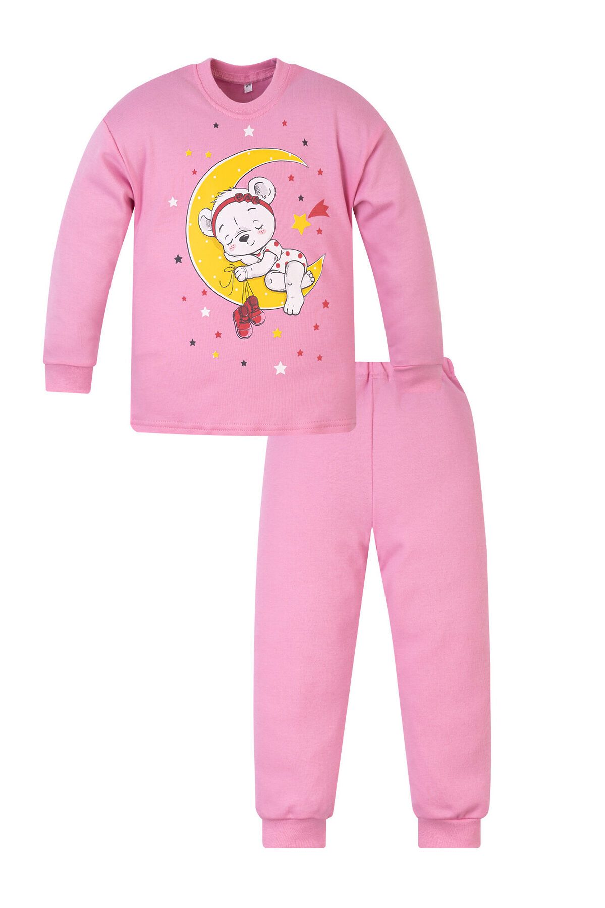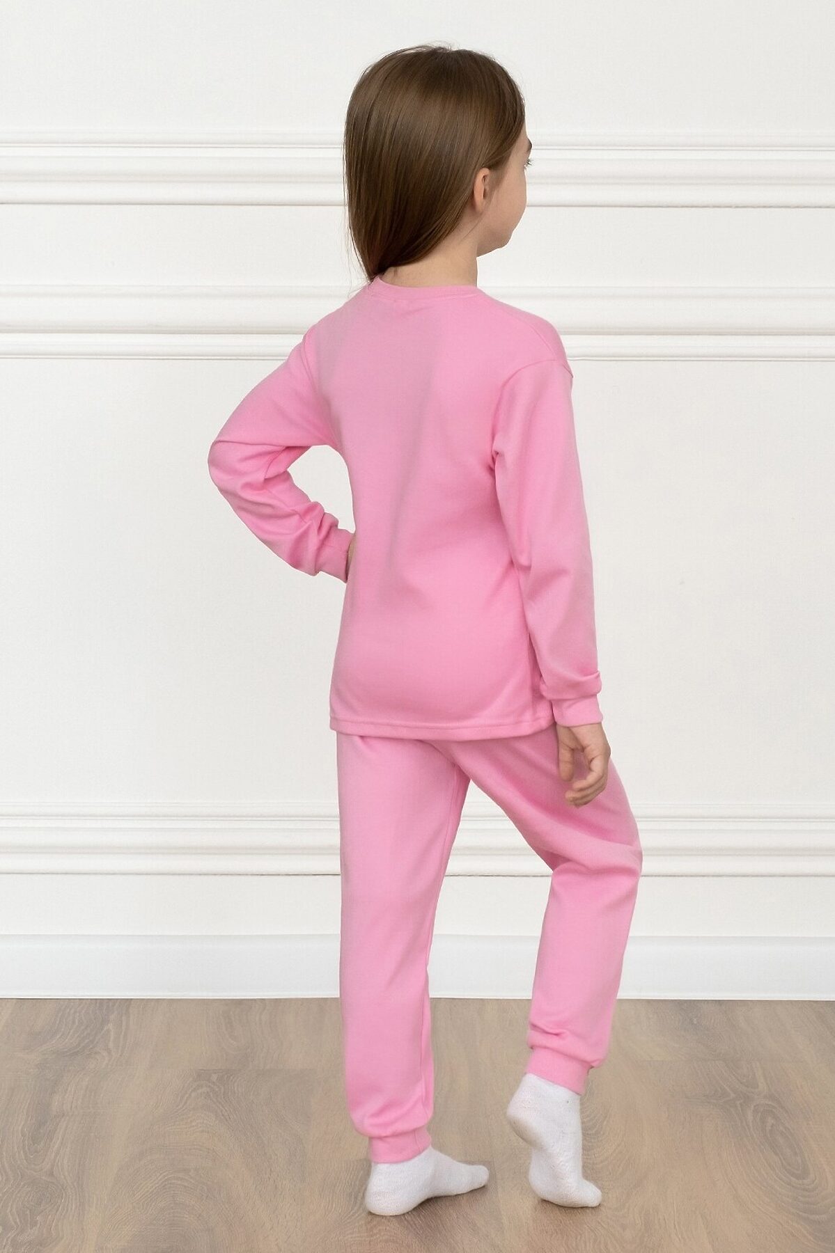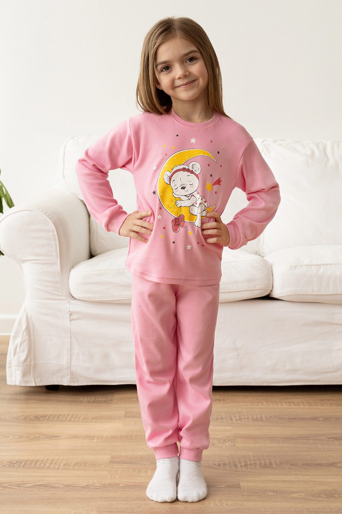 Детская пижама свободного кроя для девочек розовая из свитшота и брючек на поясе с резинкой. Комплект сшит из нежного хлопкового интерлока. На рукавах и штанинах мягкие манжеты, горловина обработана эластичной бейкой, в цвет пижамы или контрастного серого цвета. Спереди свитшота большой принт. В этой пижаме ничего не будет сковывать движения ребенка, ему будет комфортно спать. Хорошо подходит для дома и детского сада, а также для пижамных вечеринок. >