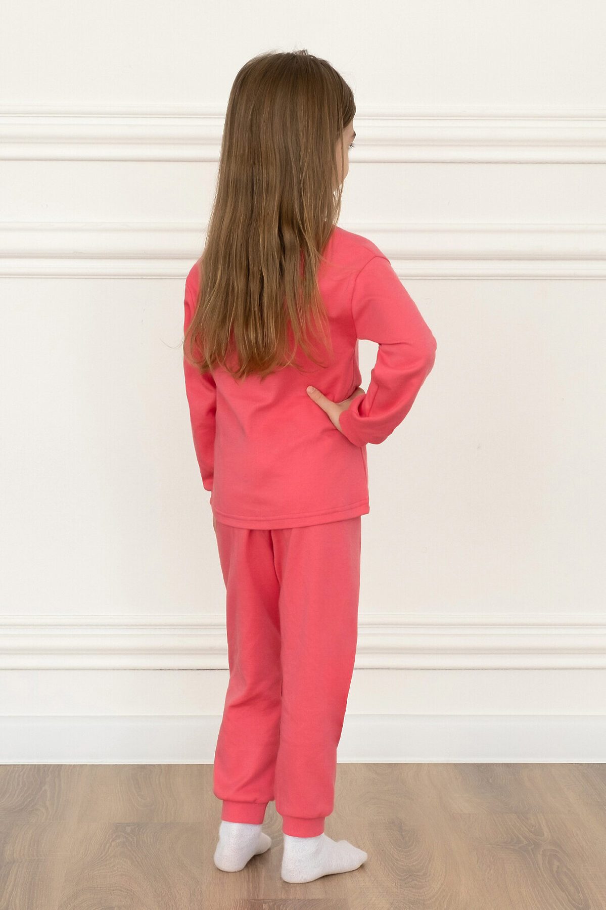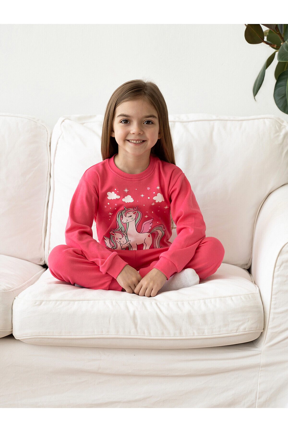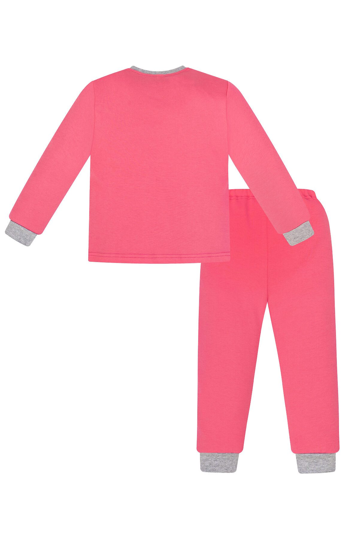 Назначение: детская пижама для мальчиков и девочек для сна, дома и детского сада. Посадка по фигуре: свободный крой. Свойства ткани: приятный к телу, мягкий, прочный трикотаж. Особенности модели: детская пижама. Двухслойные манжеты на рукавах и штанинах. Эластичная горловина у свитшота. Пояс брюк на резинке. Комплект сшит в однотонном цвете фуксия, спереди большой принт единроги. >
