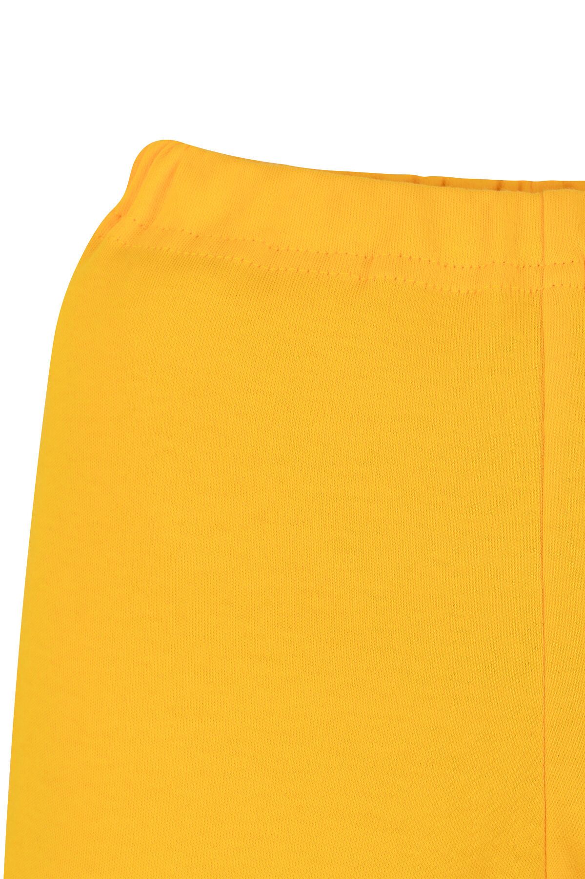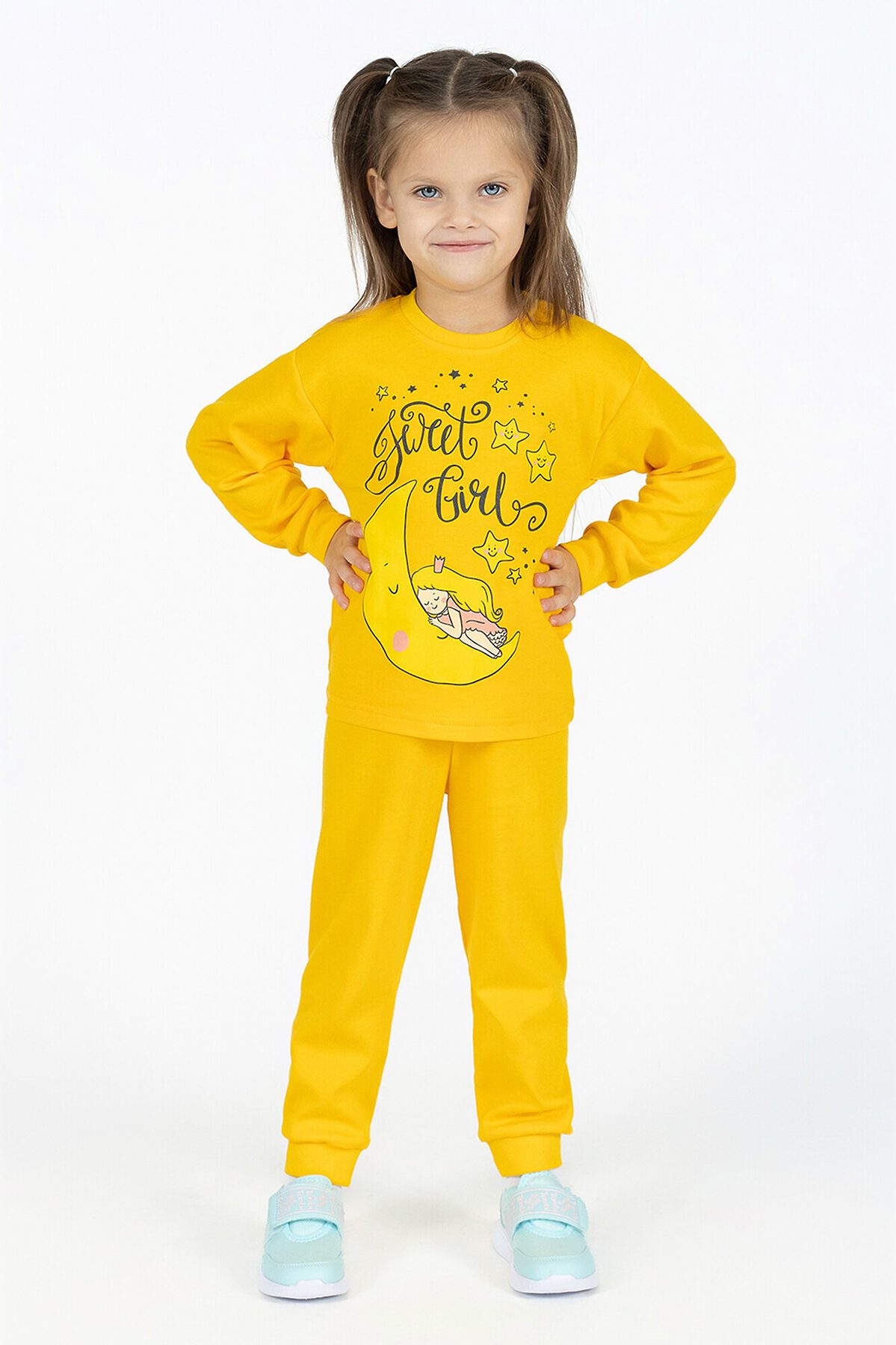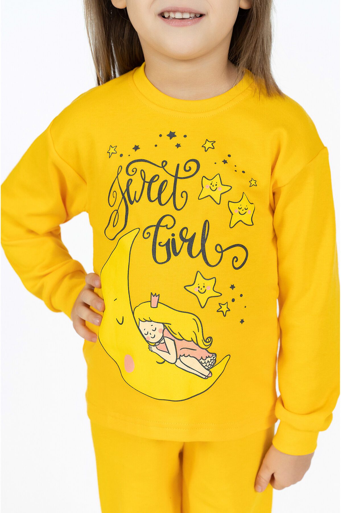 Детская пижама желтая для девочек свободного кроя из свитшота и брючек на поясе с резинкой. Комплект сшит из нежного хлопкового интерлока. На рукавах и штанинах мягкие манжеты, горловина обработана эластичной бейкой, в цвет пижамы или контрастного серого цвета. Спереди свитшота большой принт. В этой пижаме ничего не будет сковывать движения ребенка, ему будет комфортно спать. Хорошо подходит для дома и детского сада, а также для пижамных вечеринок. >