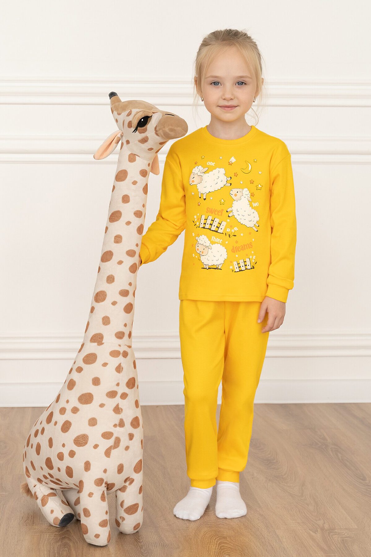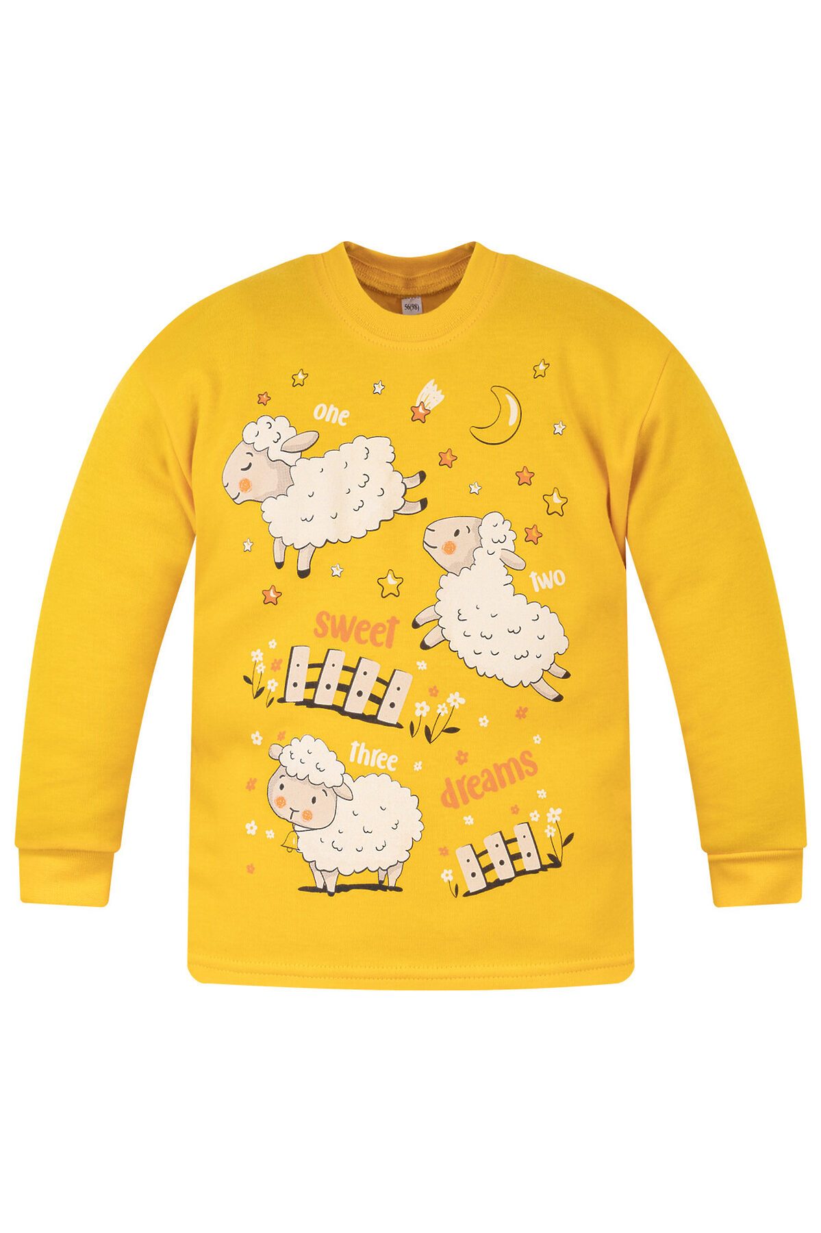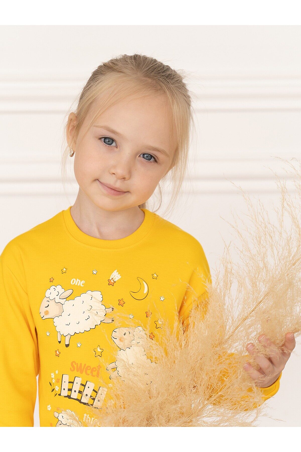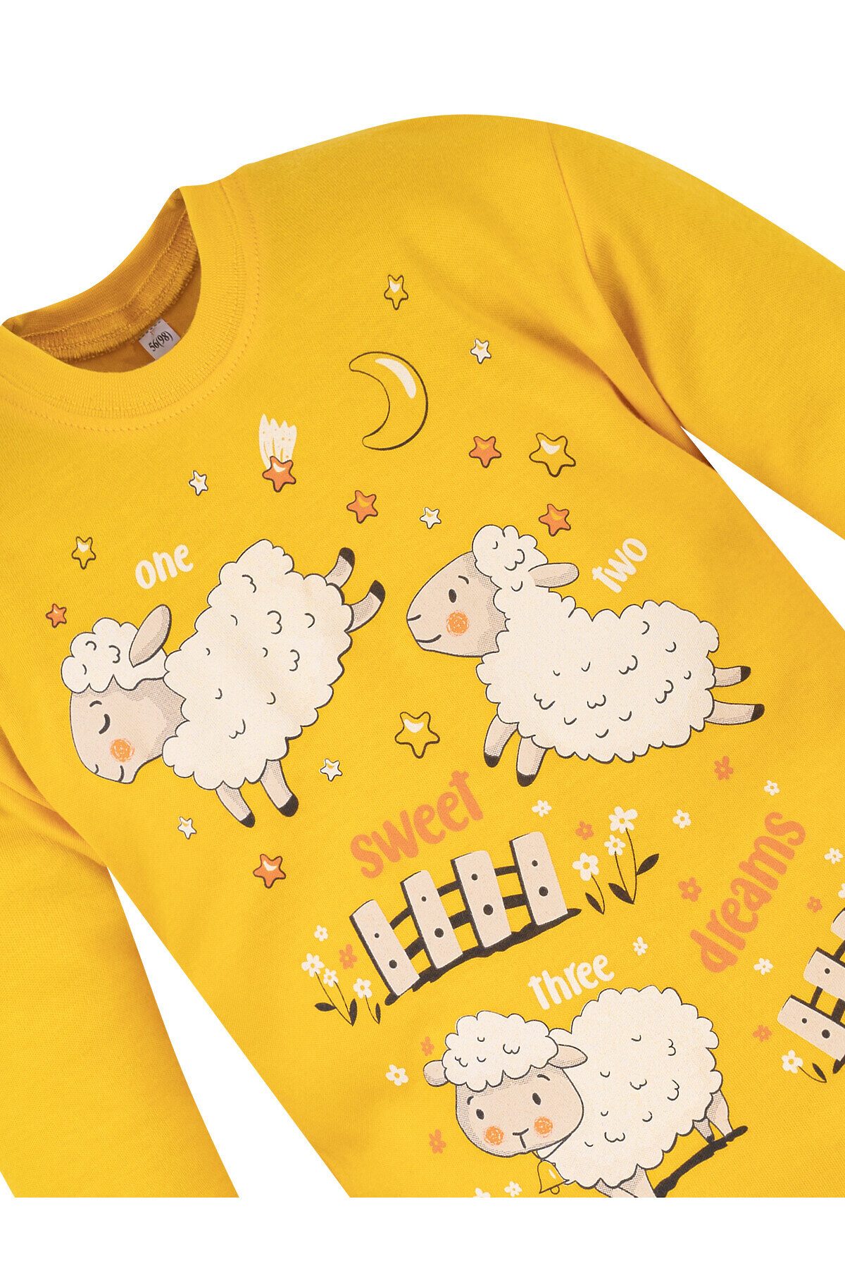 Детская пижама свободного кроя желтая из свитшота и брючек на поясе с резинкой. Комплект сшит из нежного хлопкового интерлока. На рукавах и штанинах мягкие манжеты, горловина обработана эластичной бейкой, в цвет пижамы или контрастного серого цвета. Спереди свитшота большой принт овечки. В этой пижаме ничего не будет сковывать движения ребенка, ему будет комфортно спать. Хорошо подходит для дома и детского сада, а также для пижамных вечеринок. >