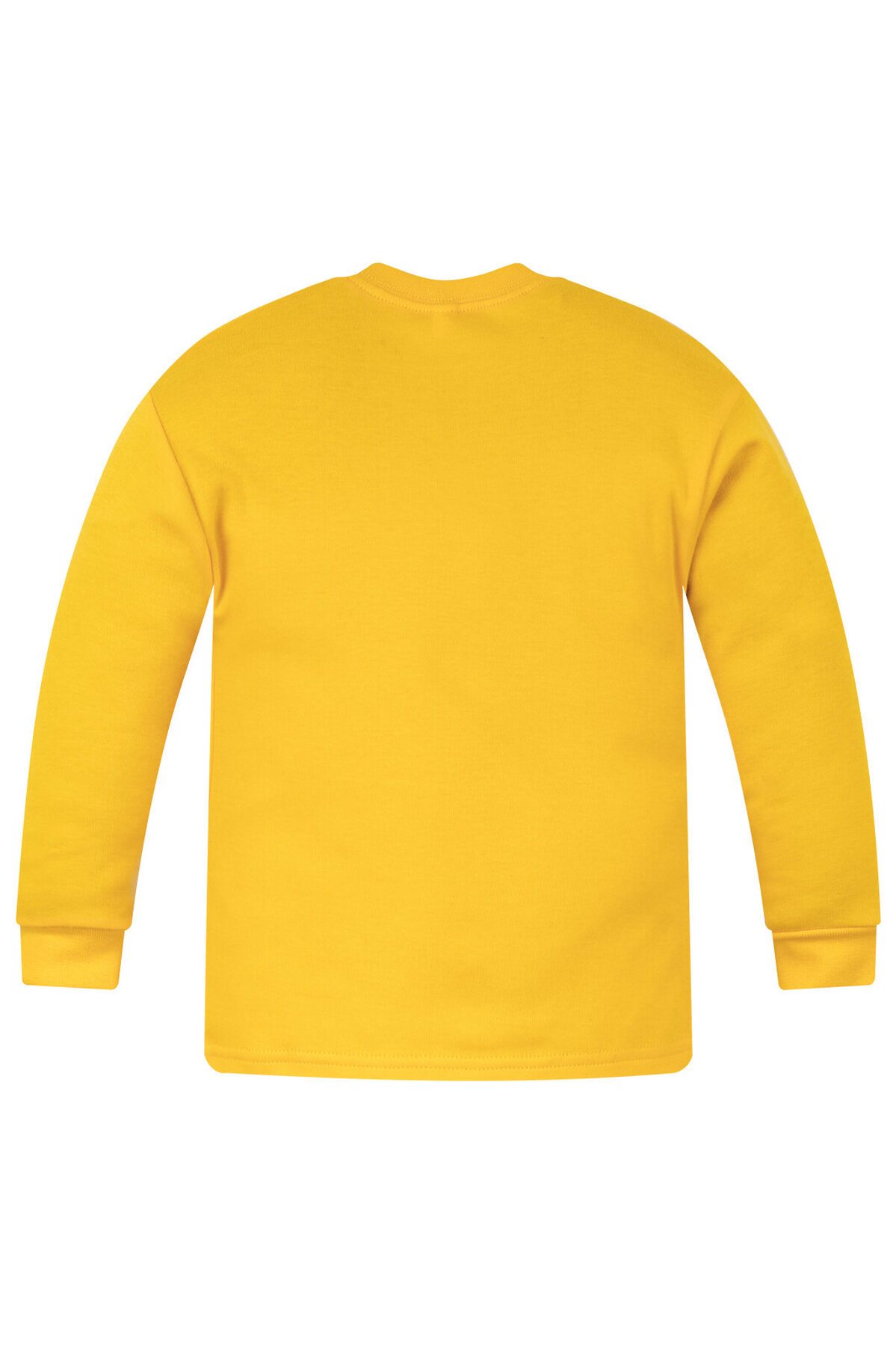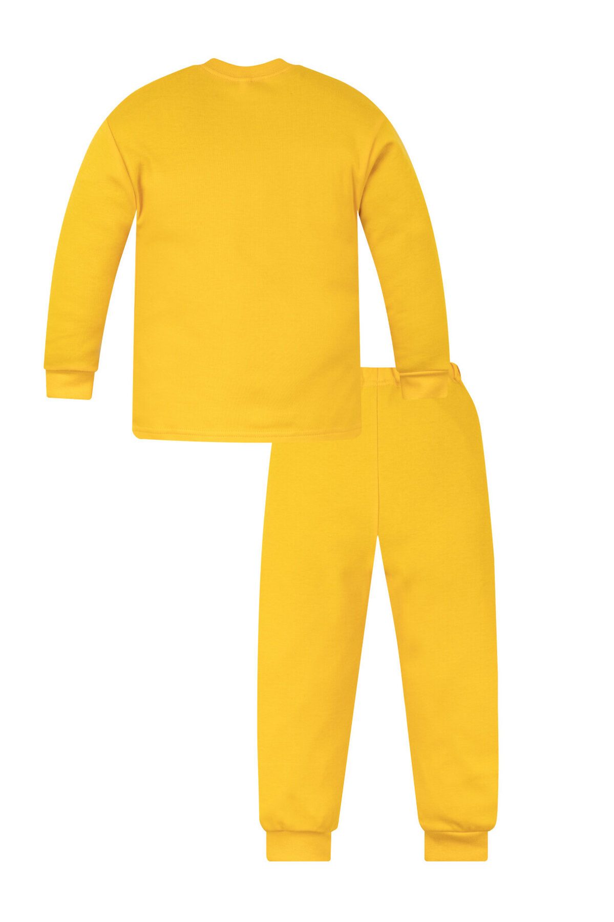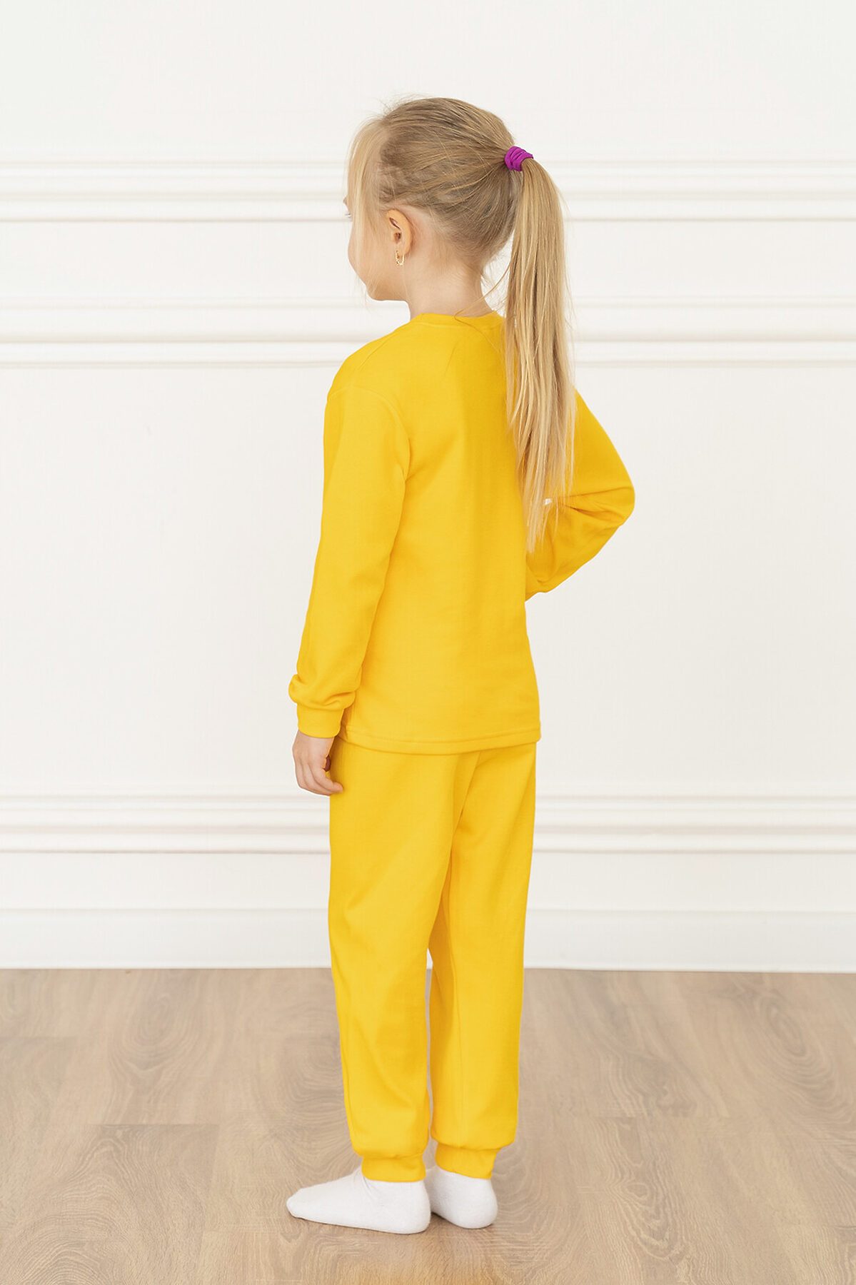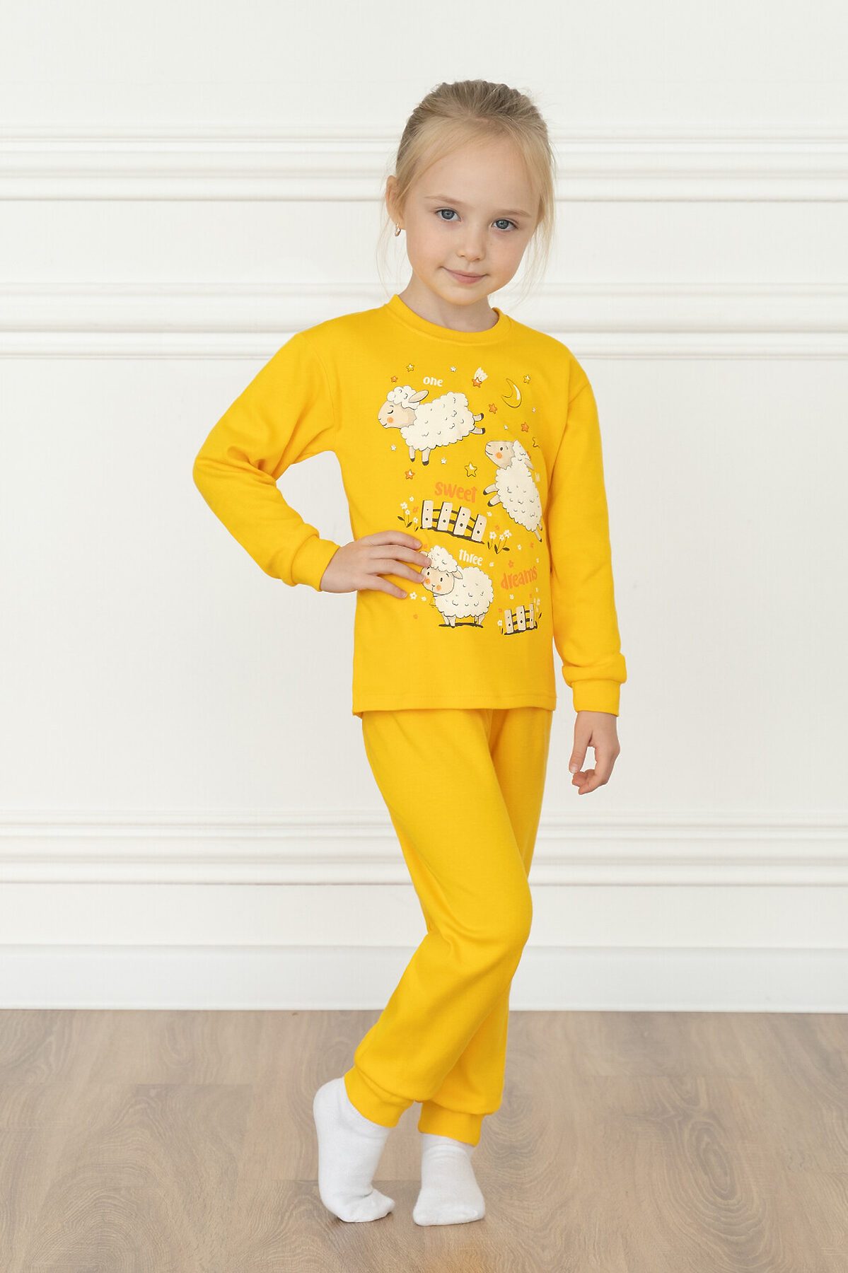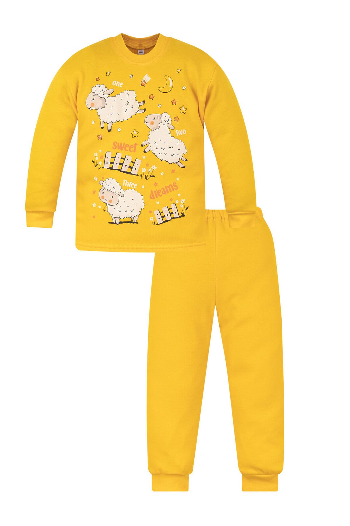 Детская пижама свободного кроя желтая из свитшота и брючек на поясе с резинкой. Комплект сшит из нежного хлопкового интерлока. На рукавах и штанинах мягкие манжеты, горловина обработана эластичной бейкой, в цвет пижамы или контрастного серого цвета. Спереди свитшота большой принт овечки. В этой пижаме ничего не будет сковывать движения ребенка, ему будет комфортно спать. Хорошо подходит для дома и детского сада, а также для пижамных вечеринок. >