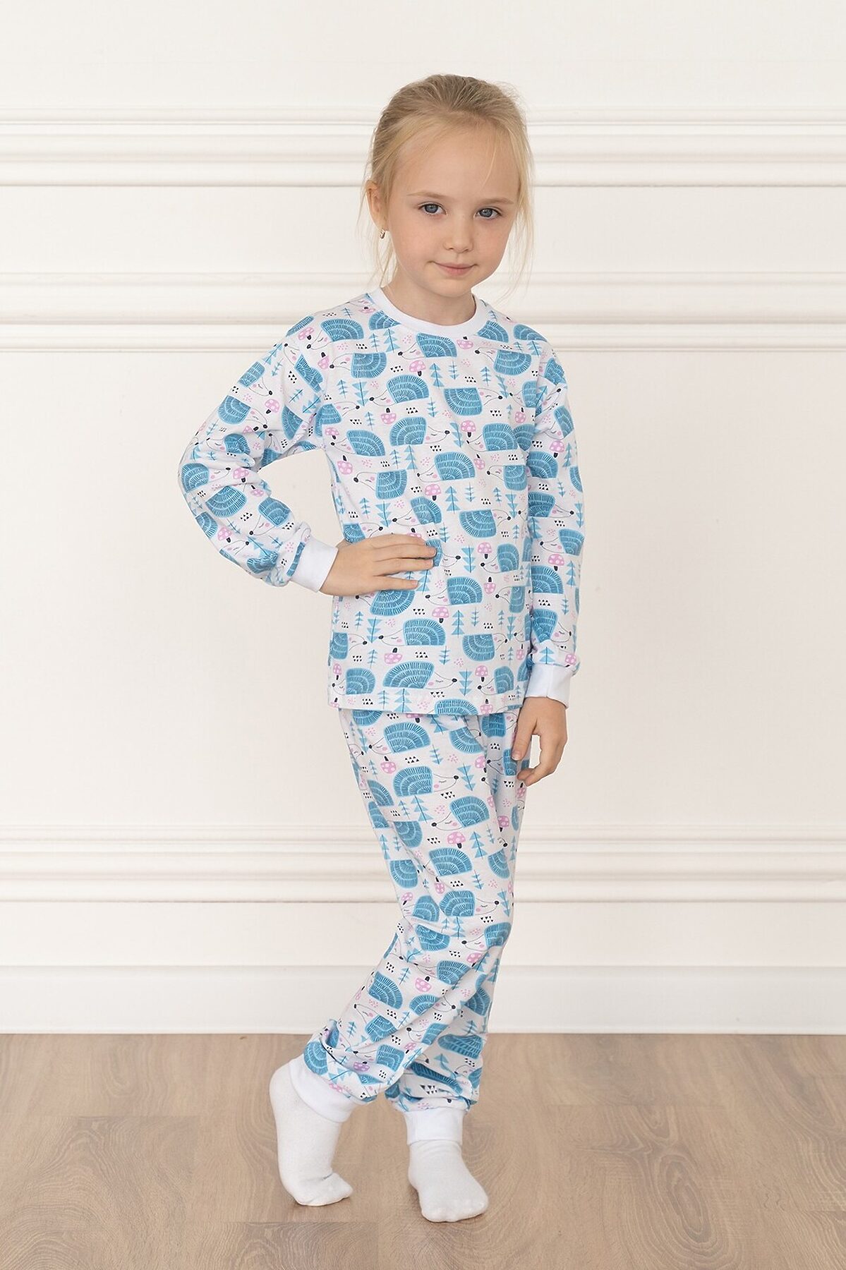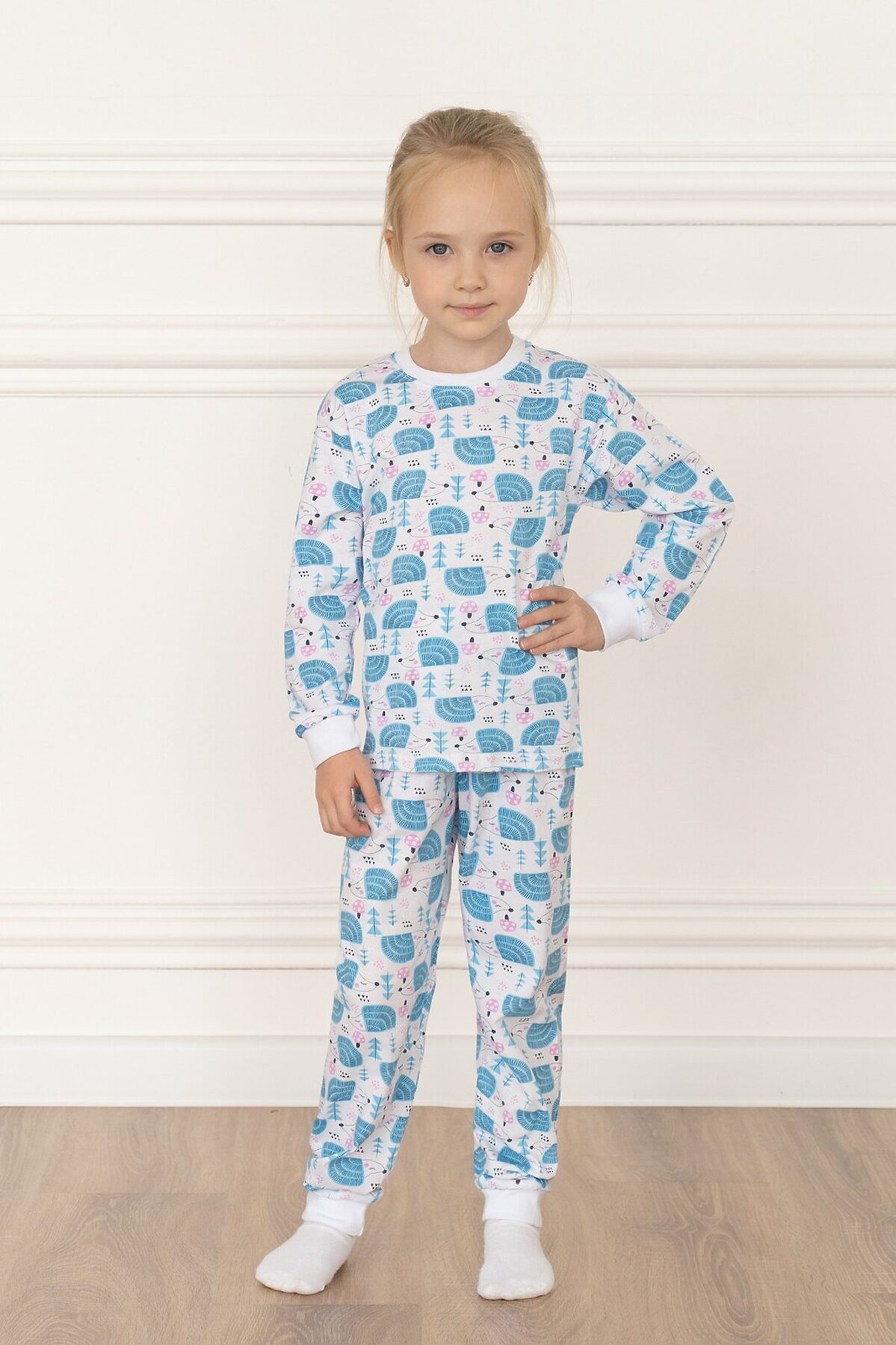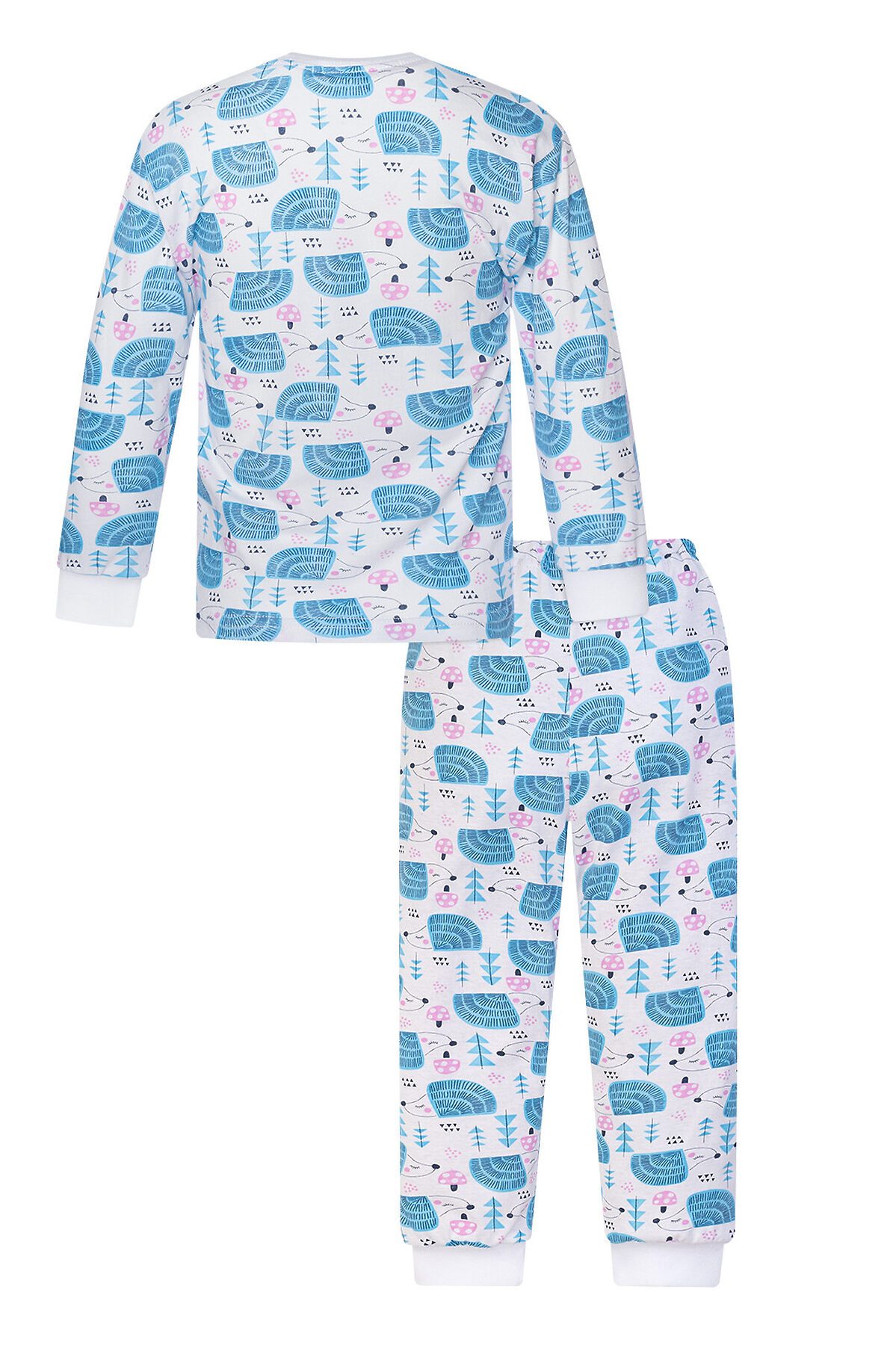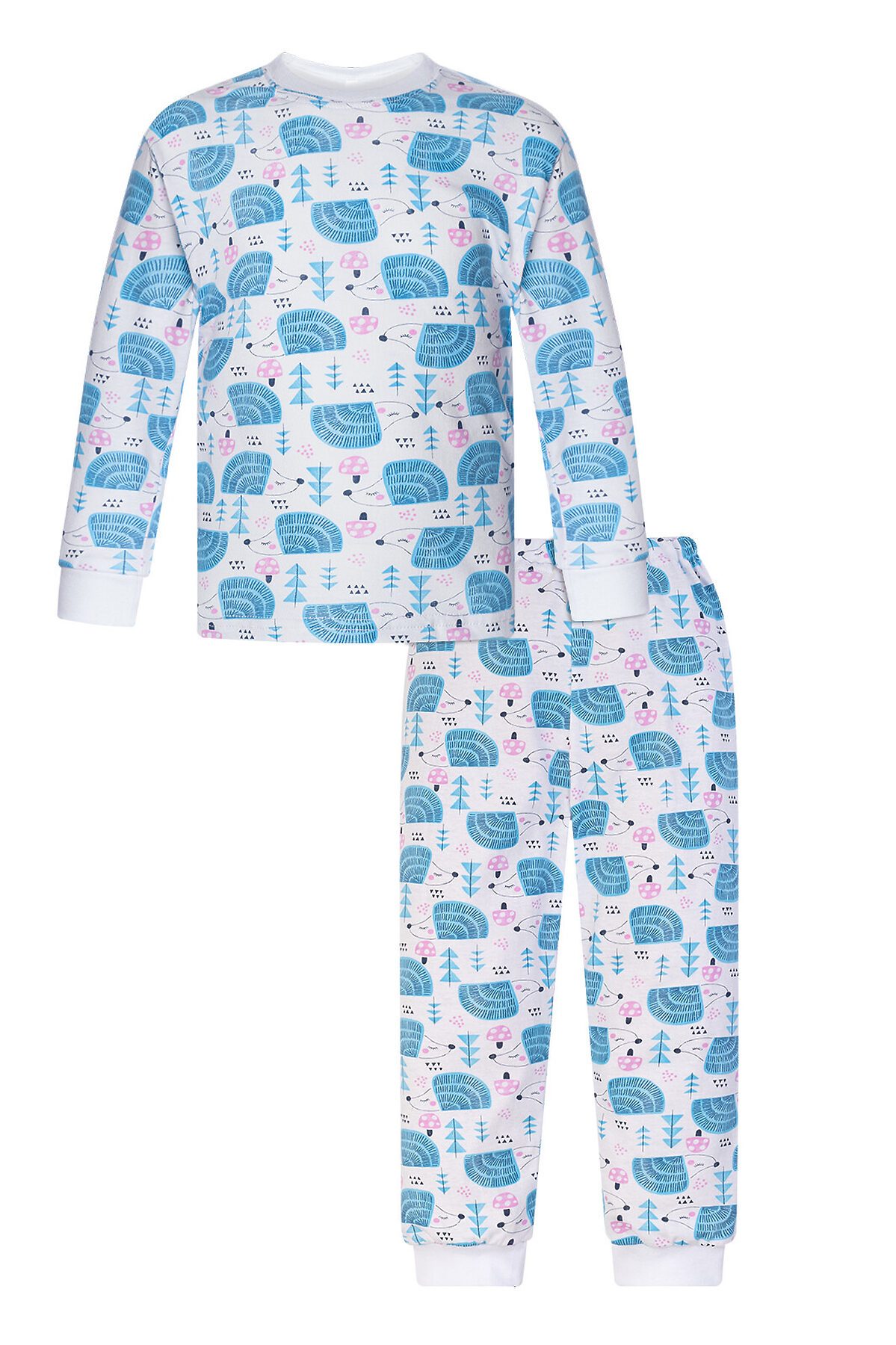 Легкая детская пижама из хлопковой дышащей кулирки белого цвета. Универсальный узор бирюзовые ежики подойдет мальчикам и девочкам. Комплект из свитшота с длинными рукавами и брючек на поясе с резинкой. Для лучшей посадки по низу штанин и рукавов манжеты. >