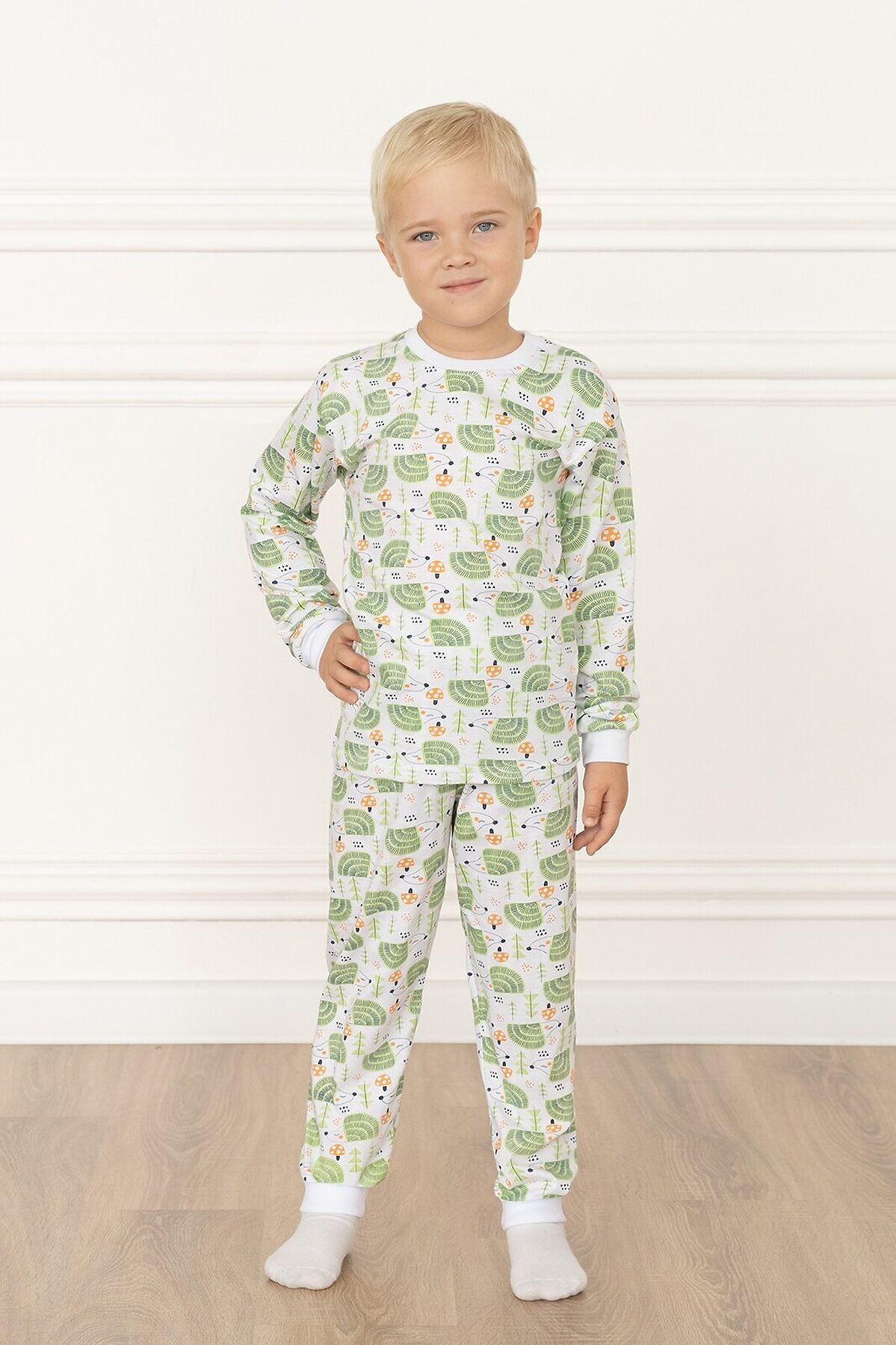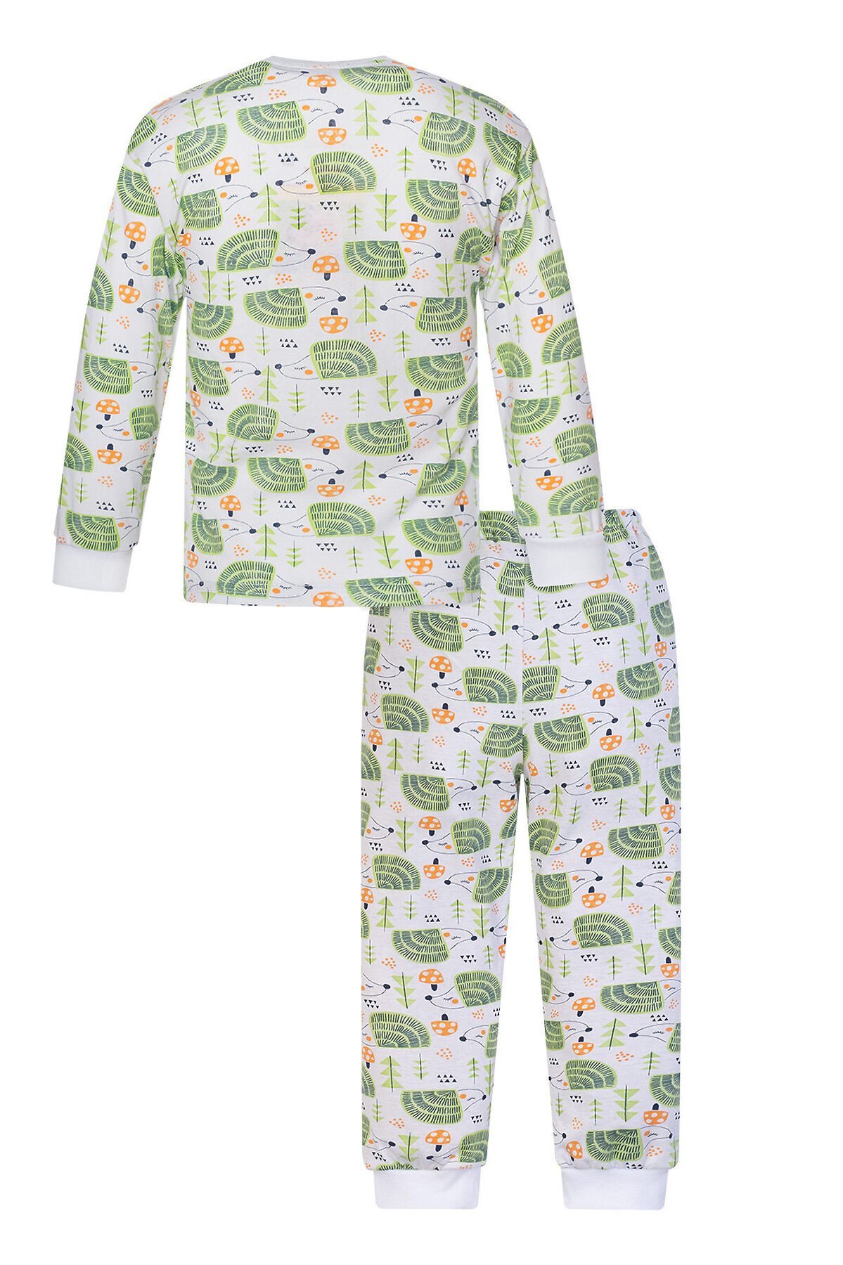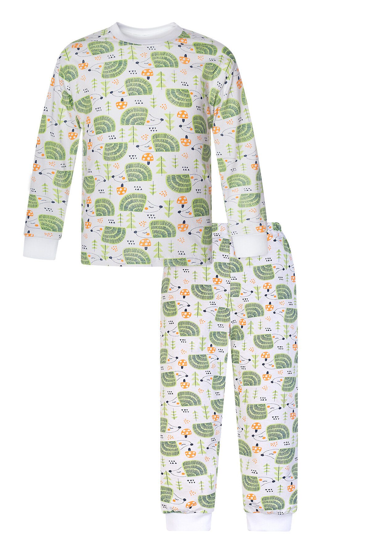 Легкая детская пижама из хлопковой дышащей кулирки белого цвета. Универсальный узор салатовые ежики подойдет мальчикам и девочкам. Комплект из свитшота с длинными рукавами и брючек на поясе с резинкой. Для лучшей посадки по низу штанин и рукавов манжеты. >