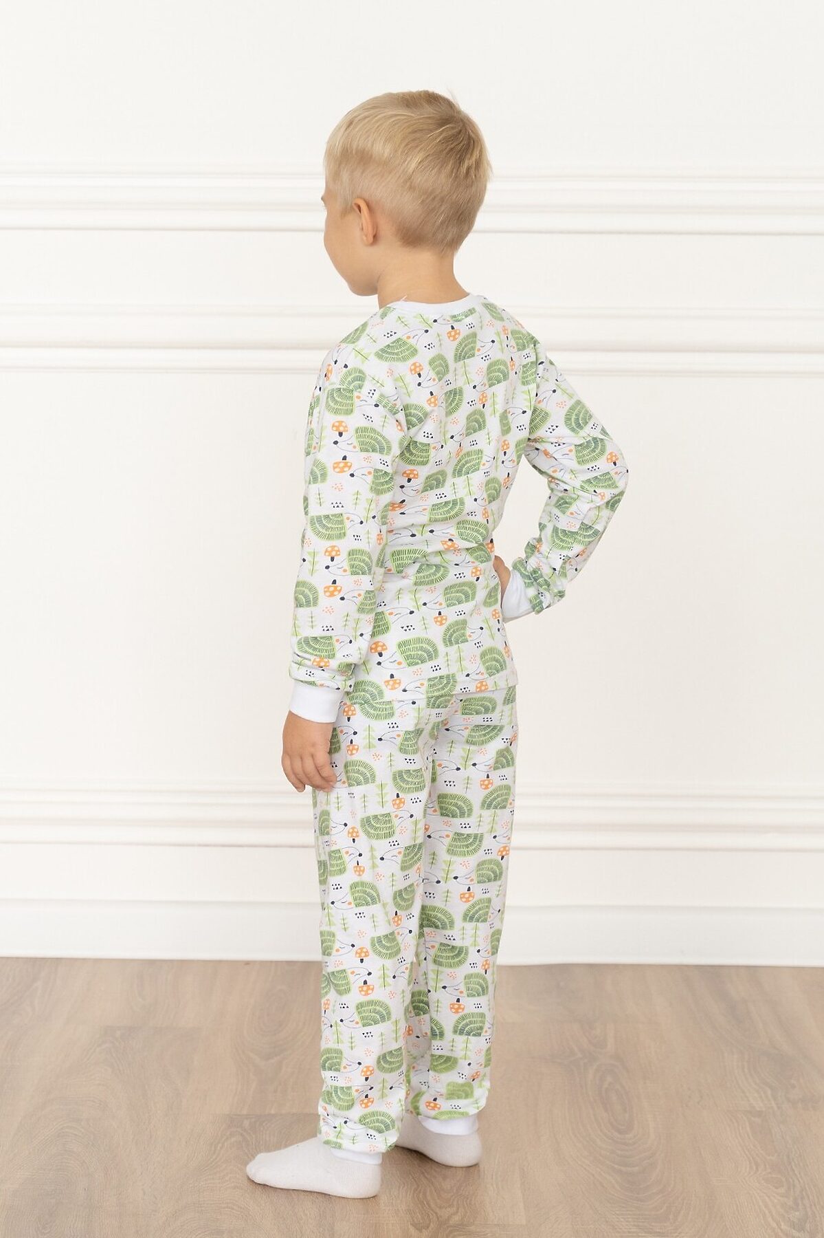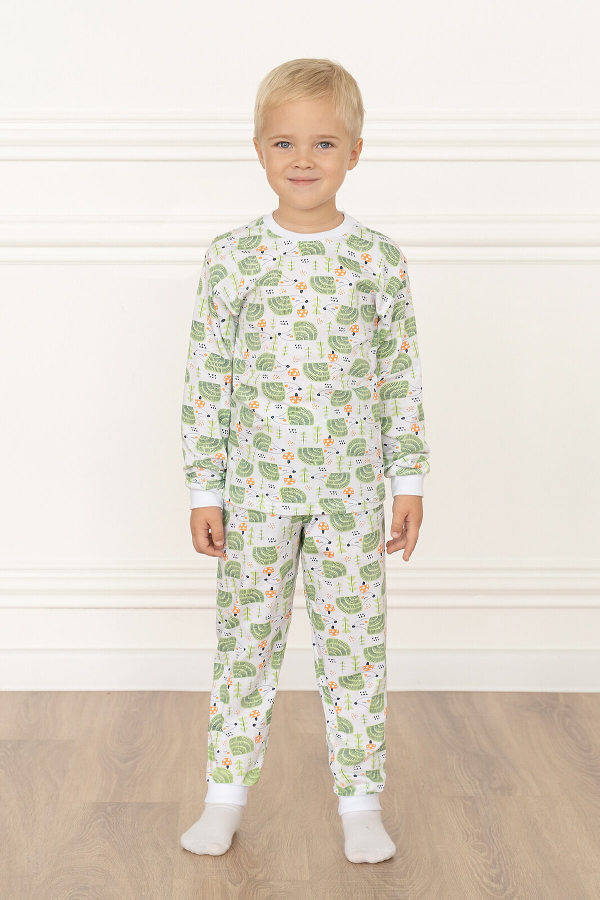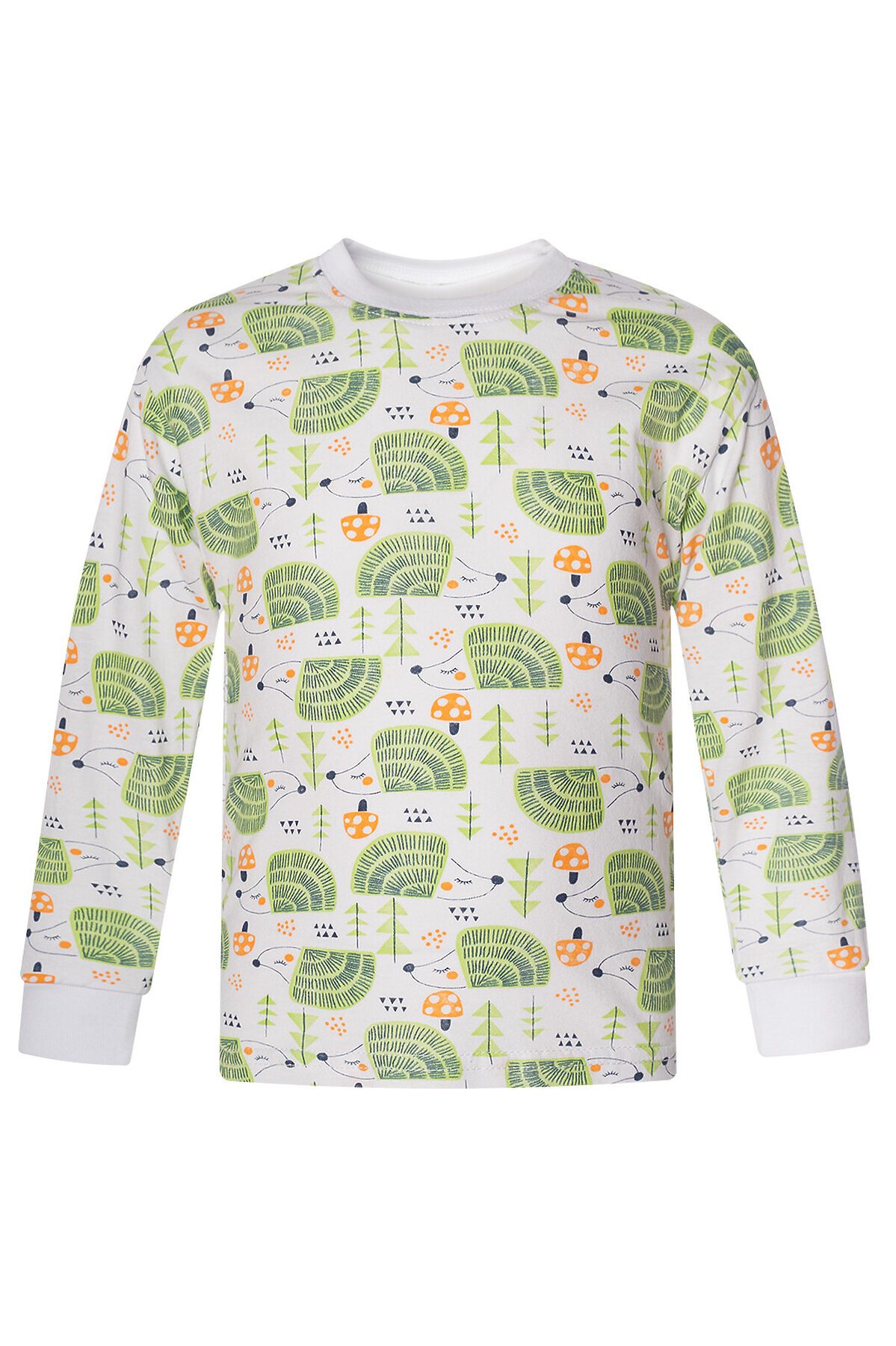 Легкая детская пижама из хлопковой дышащей кулирки белого цвета. Универсальный узор салатовые ежики подойдет мальчикам и девочкам. Комплект из свитшота с длинными рукавами и брючек на поясе с резинкой. Для лучшей посадки по низу штанин и рукавов манжеты. >
