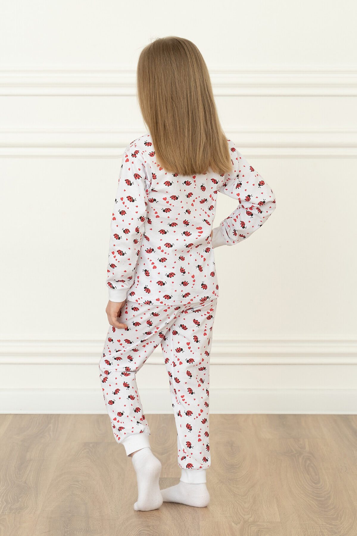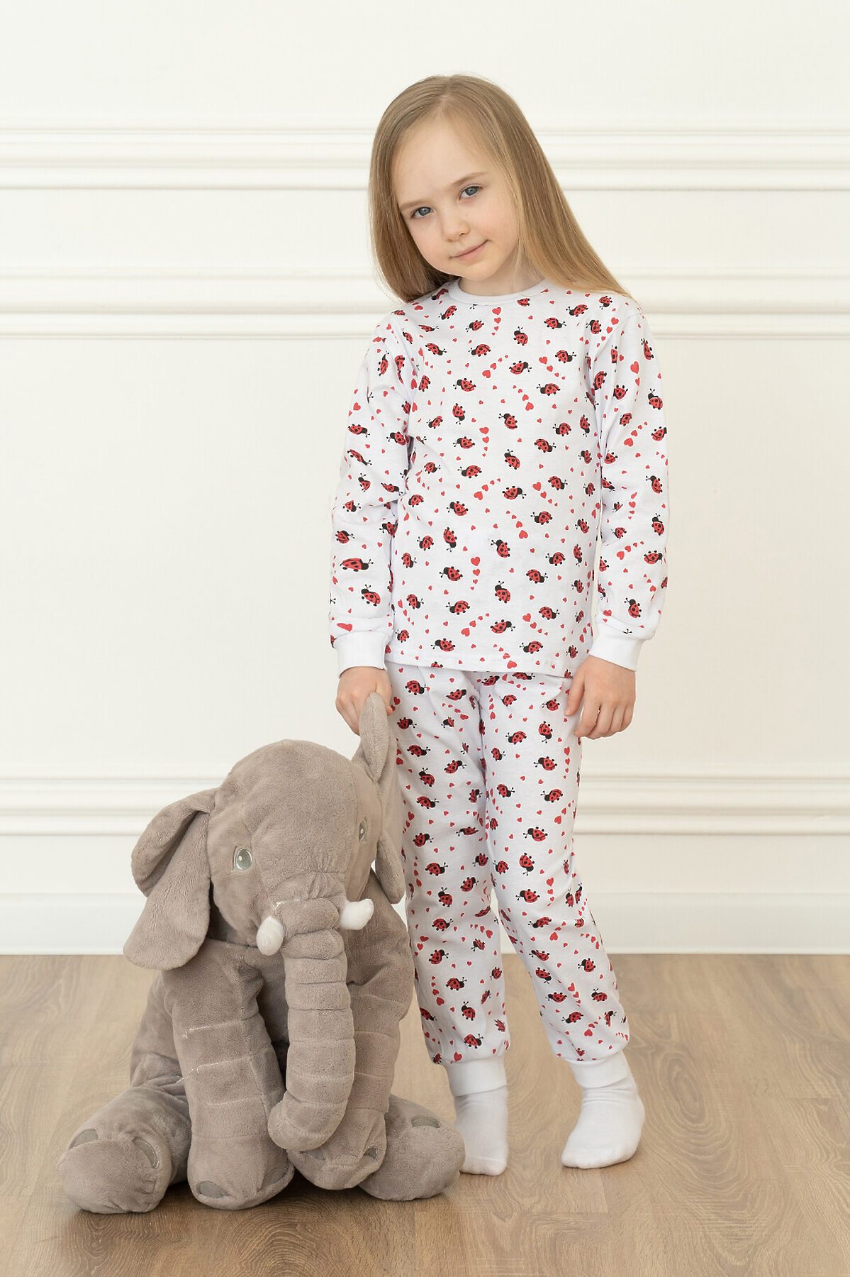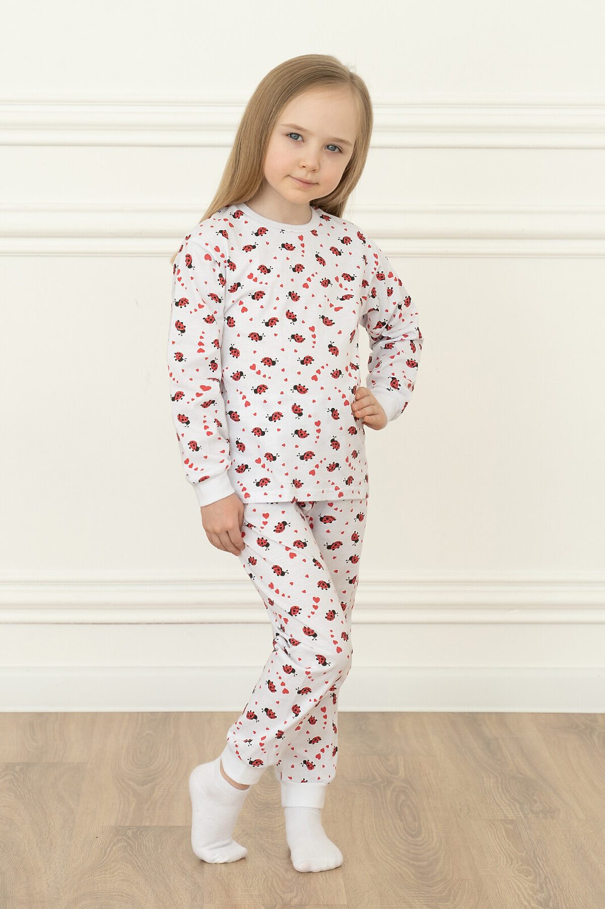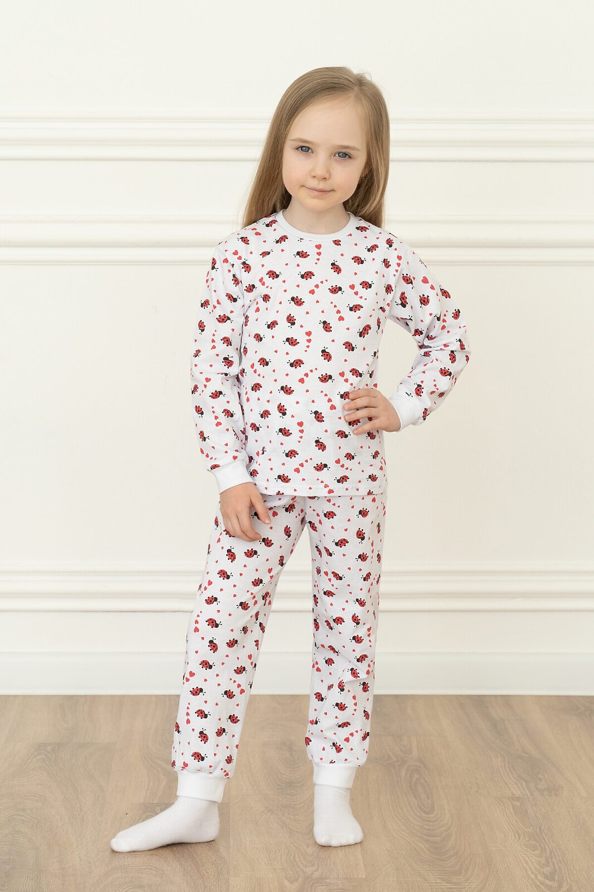 Легкая детская пижама из хлопковой дышащей кулирки белого цвета. Универсальный узор божьи коровки подойдет мальчикам и девочкам. Комплект из свитшота с длинными рукавами и брючек на поясе с резинкой. Для лучшей посадки по низу штанин и рукавов манжеты. >