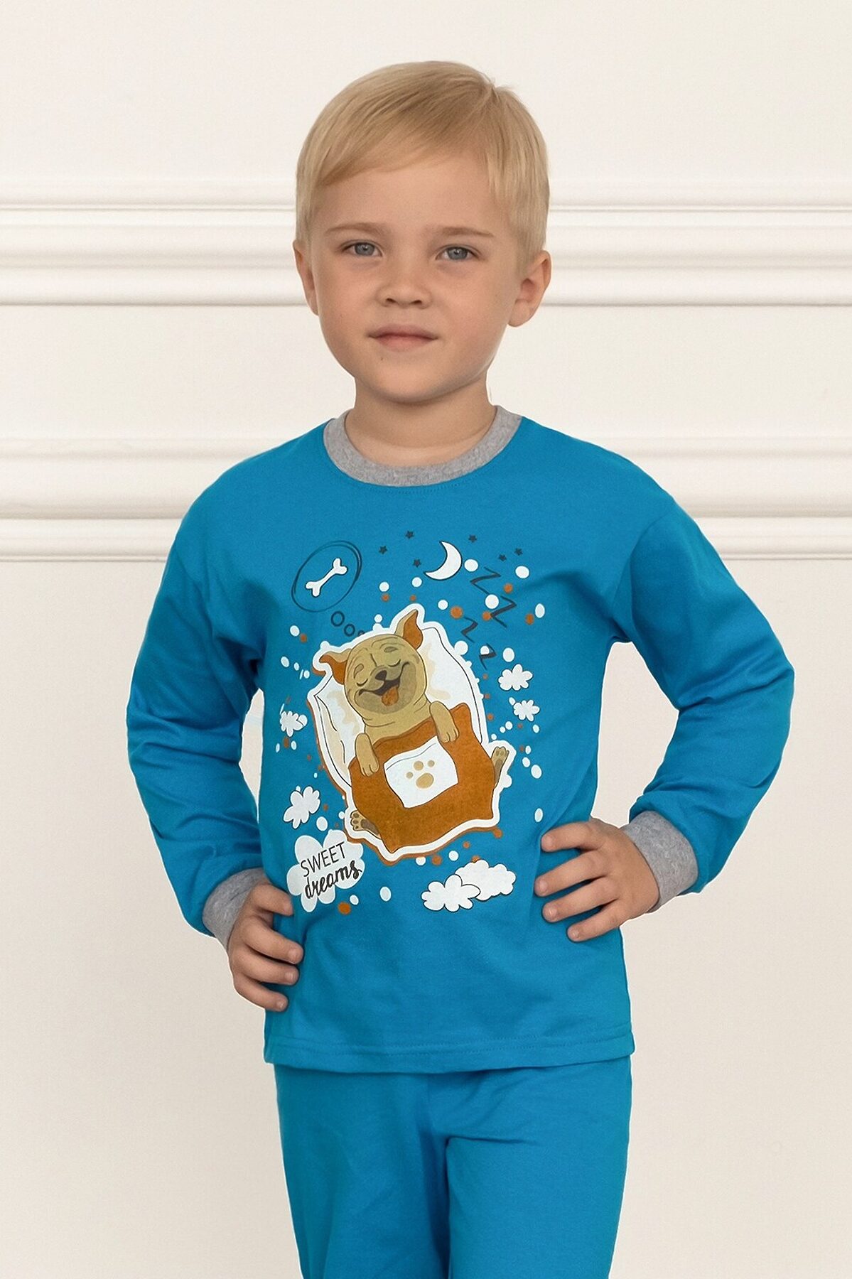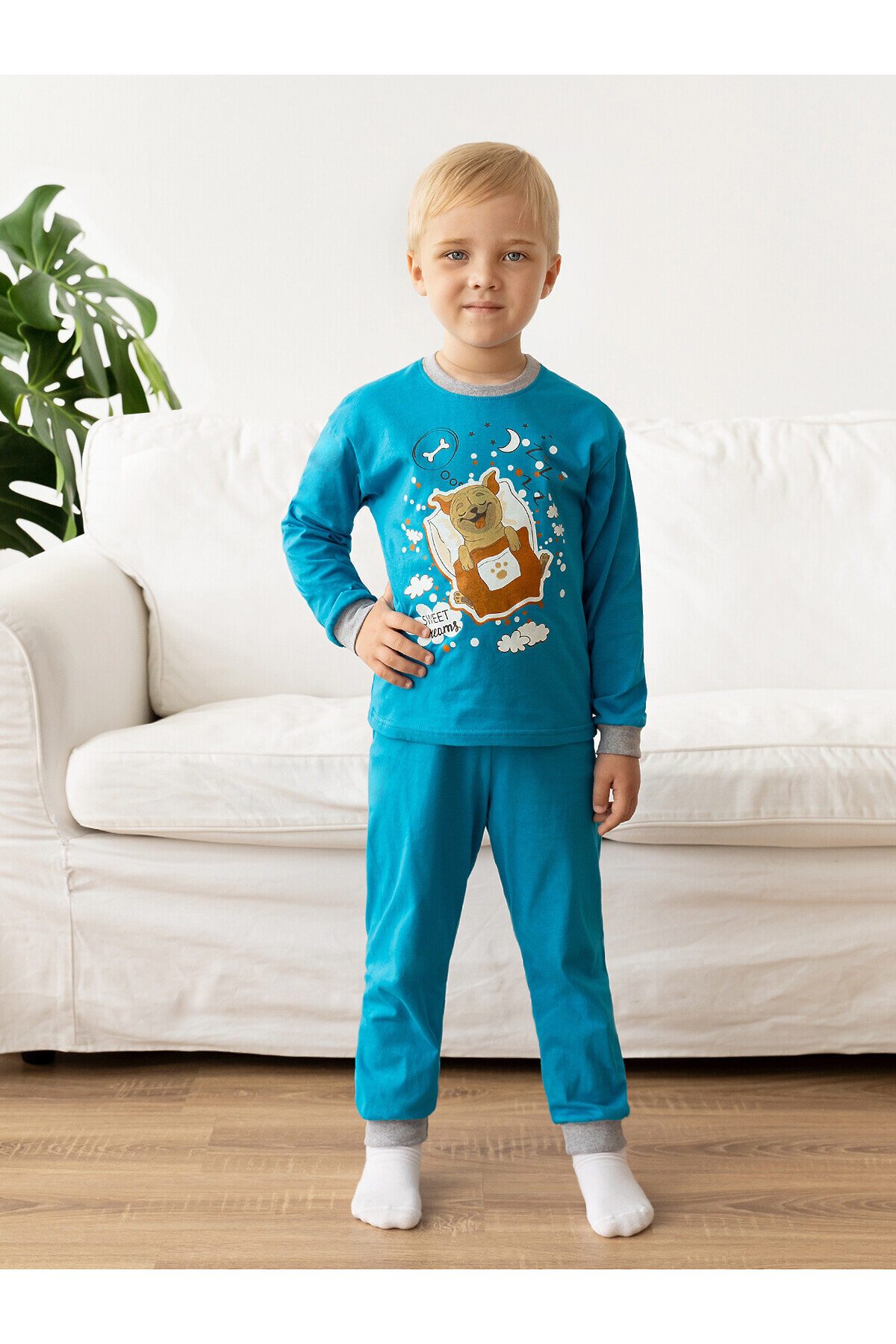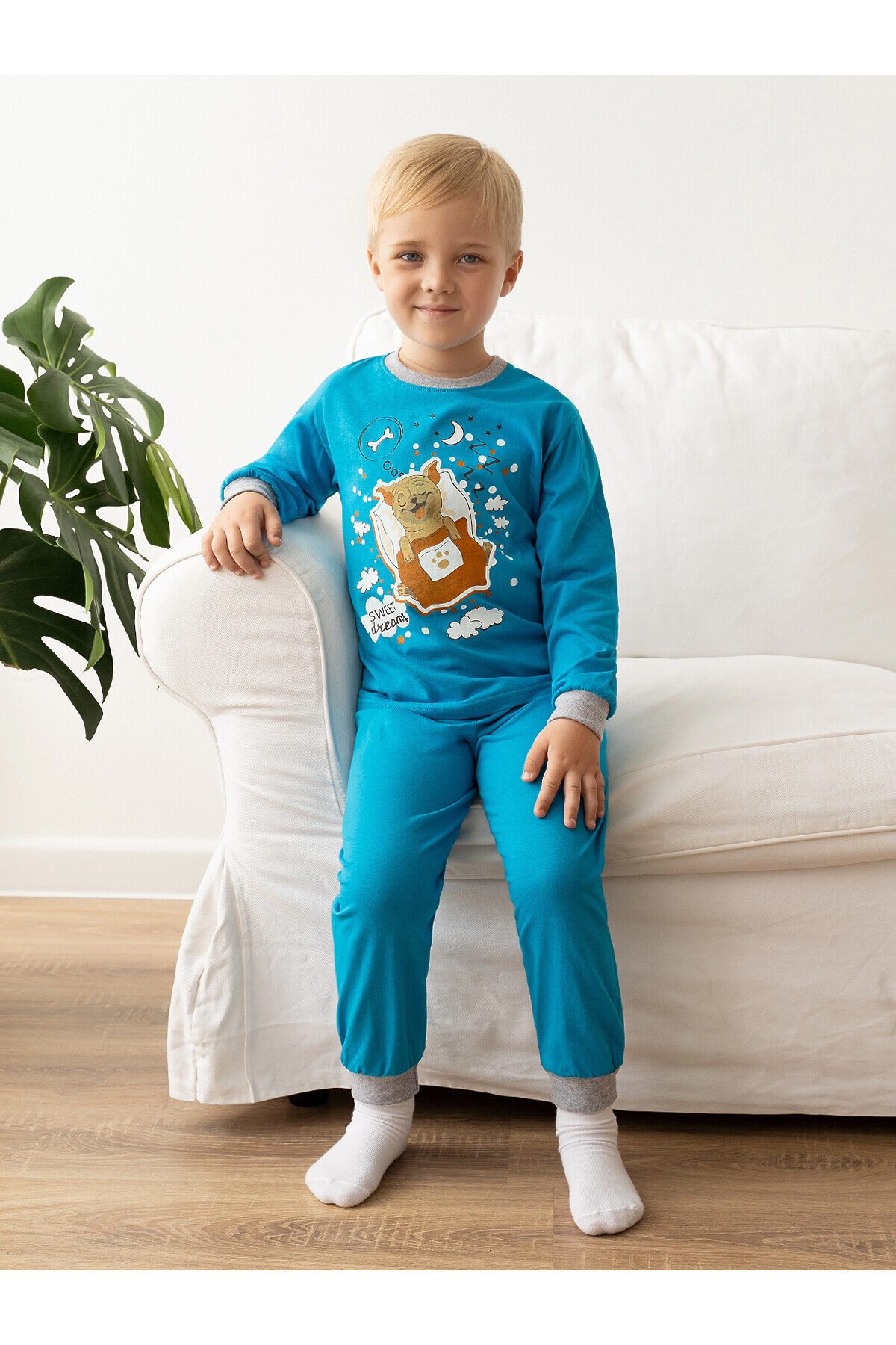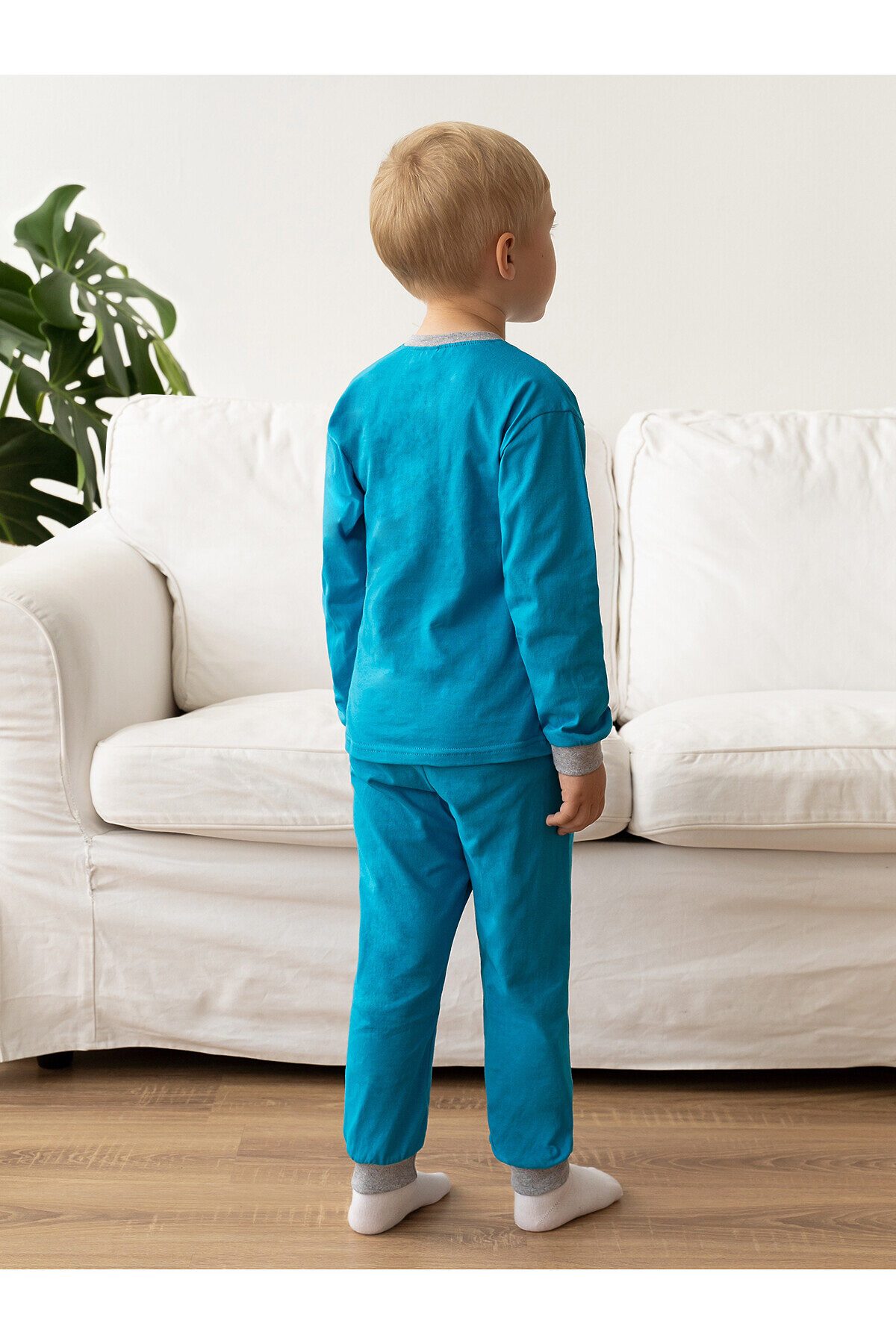 Детская трикотажная пижама однотонная из хлопковой кулирки. Этот комплект свободного кроя из свитшота и брючек на поясе. Манжеты из мягкой эластичной рибаны серого цвета. Горловина эластичная, обработана такой же рибаной. На свитшоте красивый большой принт. >
