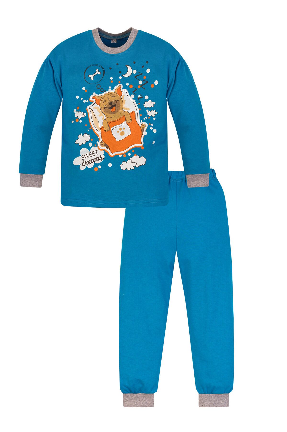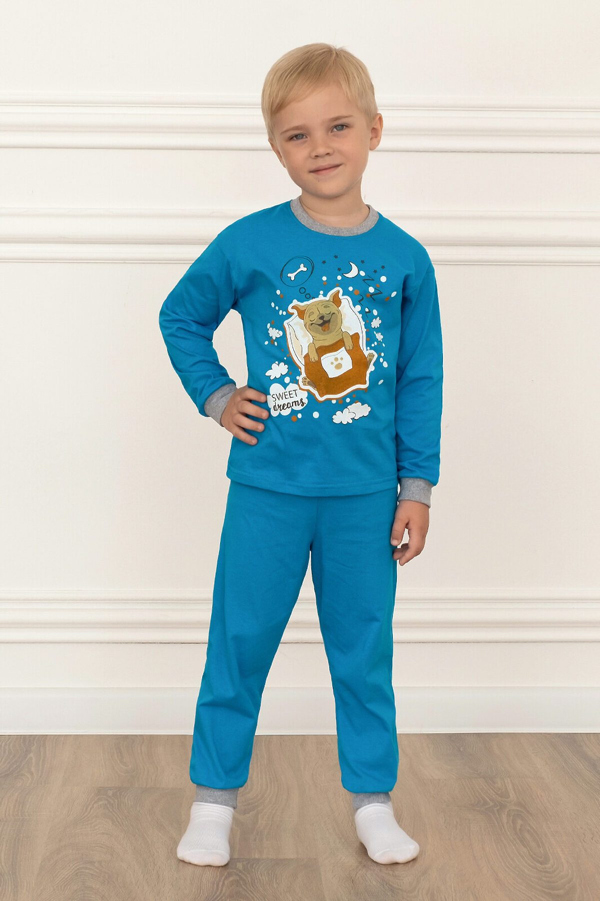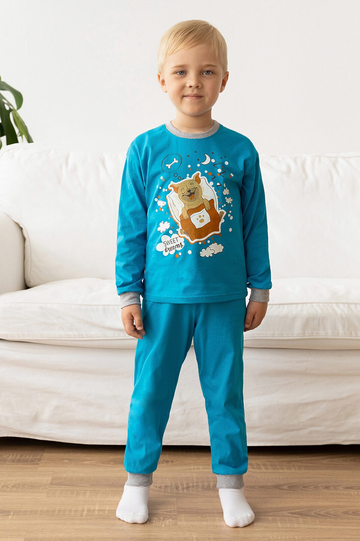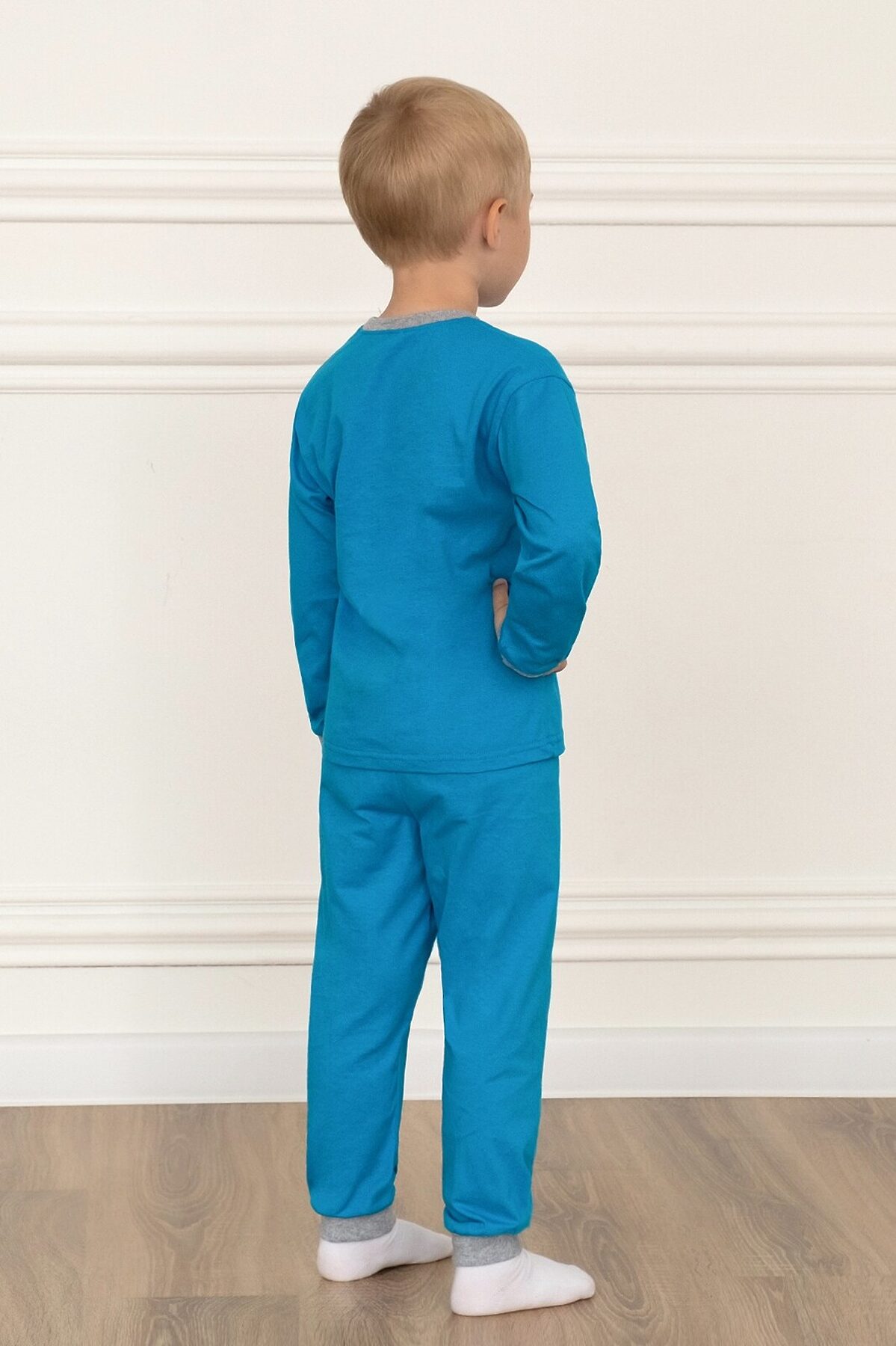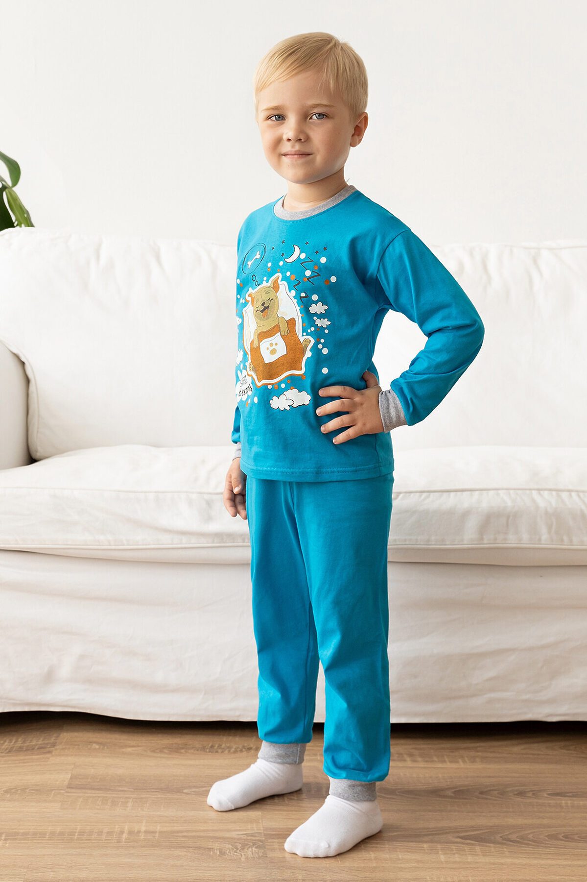 Детская трикотажная пижама однотонная из хлопковой кулирки. Этот комплект свободного кроя из свитшота и брючек на поясе. Манжеты из мягкой эластичной рибаны серого цвета. Горловина эластичная, обработана такой же рибаной. На свитшоте красивый большой принт. >
