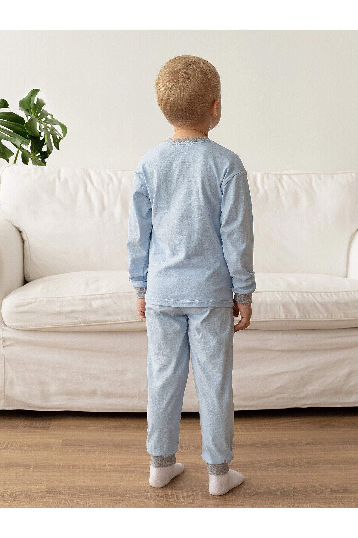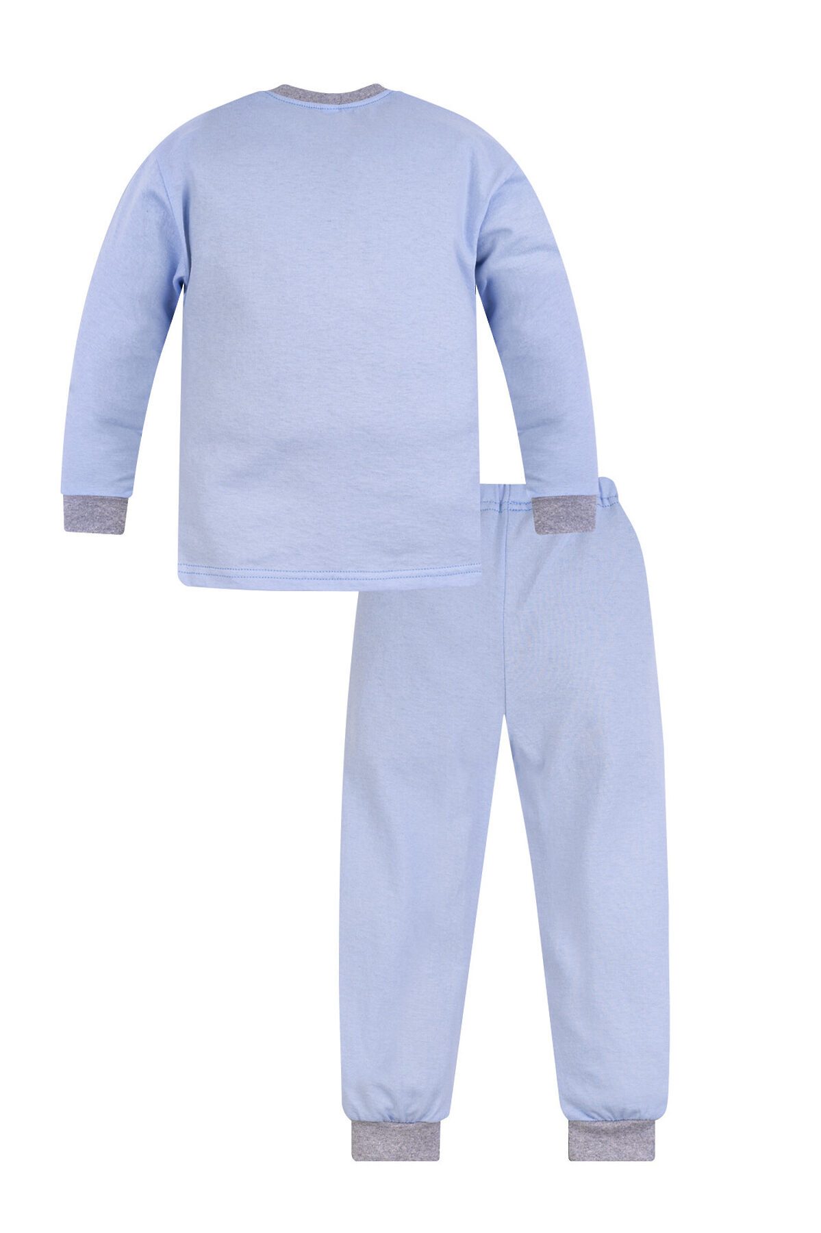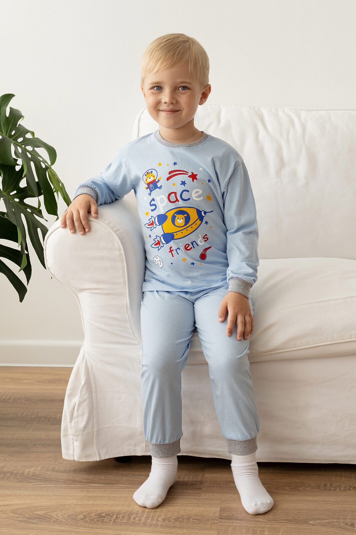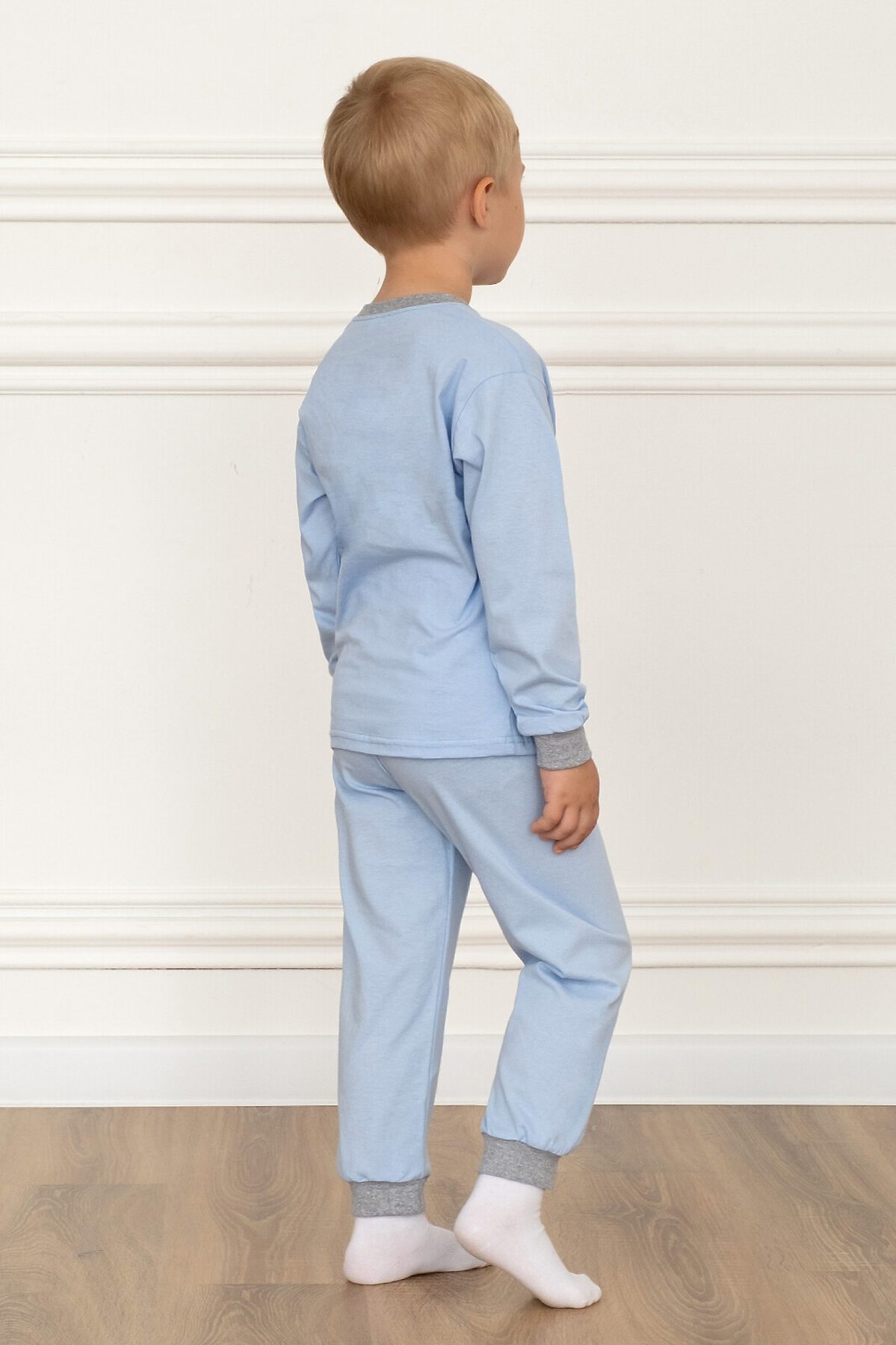 Детская трикотажная пижама однотонная из хлопковой кулирки. Этот комплект свободного кроя из свитшота и брючек на поясе. Манжеты из мягкой эластичной рибаны серого цвета. Горловина эластичная, обработана такой же рибаной. На свитшоте красивый большой принт. >