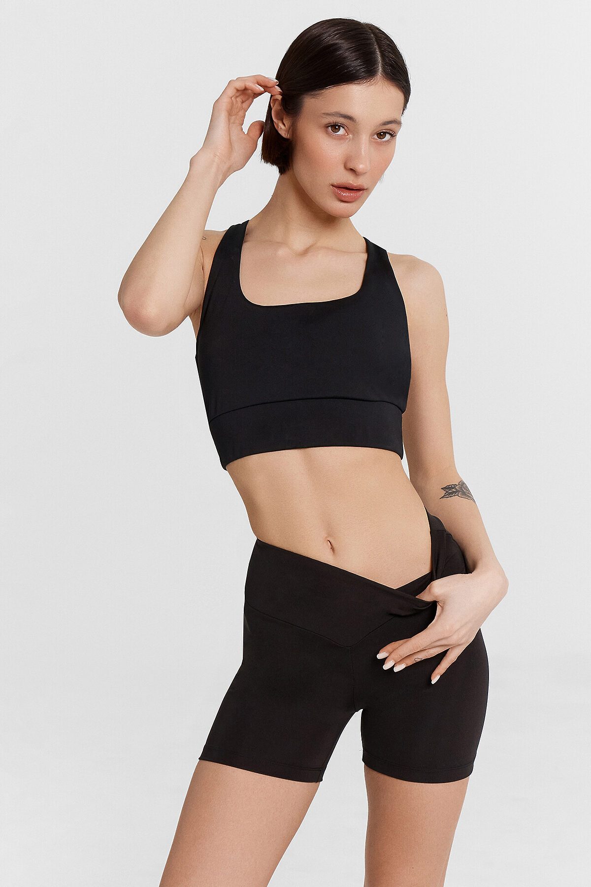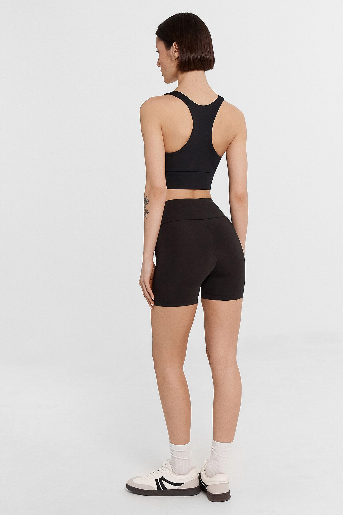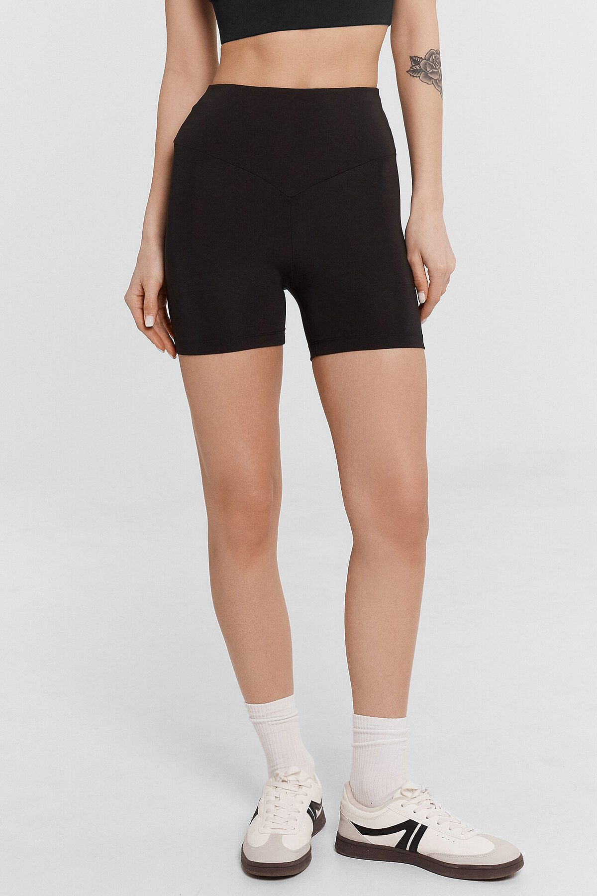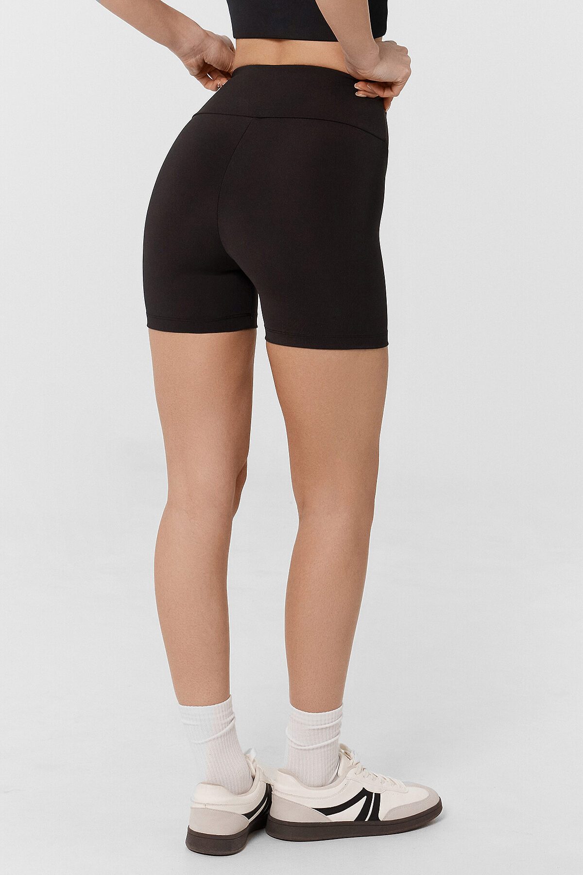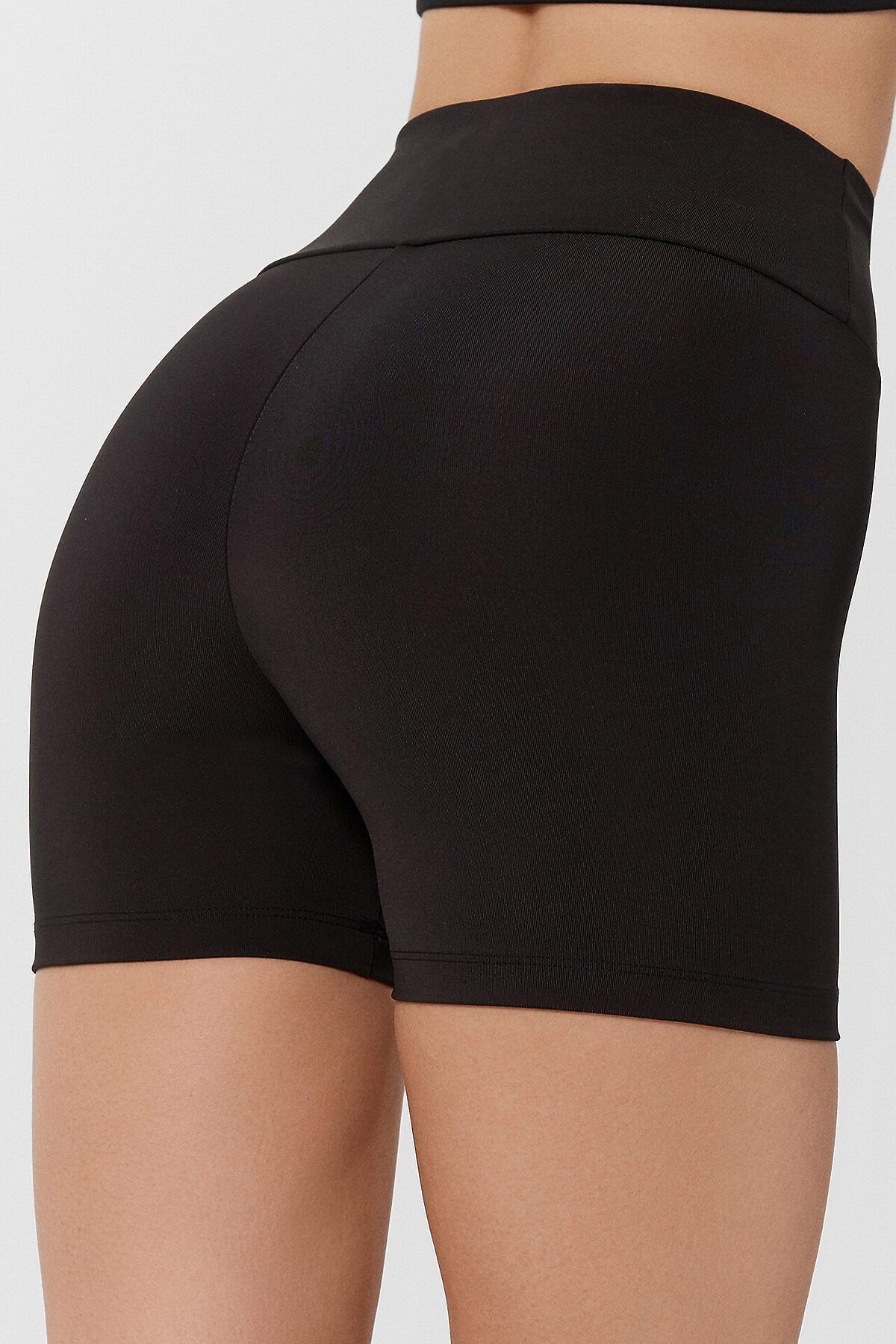 Шорты женские изготовлены из трикотажного полотна иентерлок. Шорты облегающего силуэта, с высокой линией талии. Пояс отрезной широкий фигурный, с эластичной тесьмой внутри. Шорты без бокового шва. Нижний срез обработан швом вподгибку.