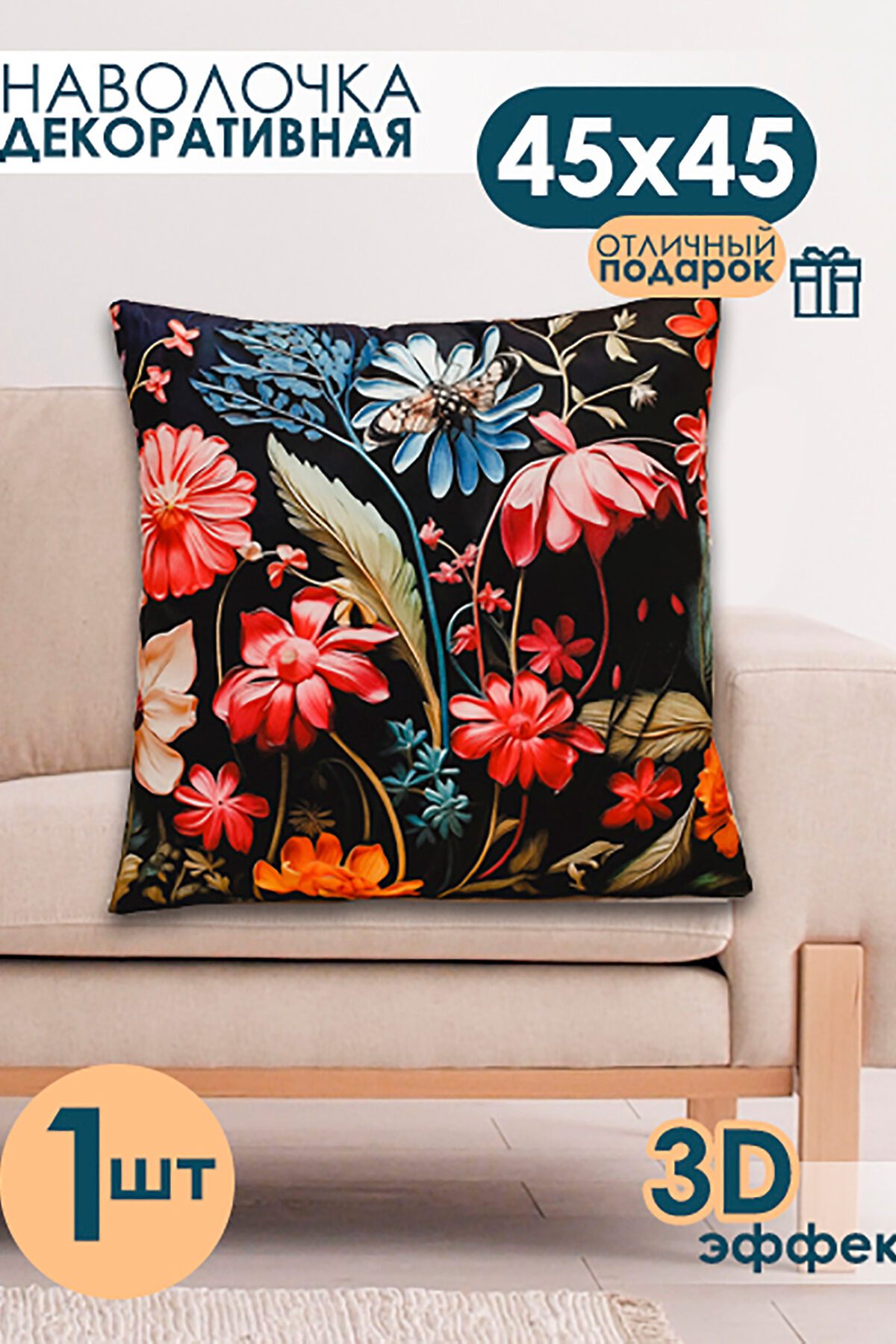 Наволочка 4545 см выполнена из качественного полиэстера. Лицевая сторона украшена выразительным 3D рисунком, который придаёт интерьеру глубину и динамику, а обратная сторона однотонная, что облегчает сочетание с другими элементами декора. Ткань мягкая, гладкая и очень приятная на ощупь, дарит тактильный комфорт при прикосновении и выглядит элегантно вблизи. Полиэстер обеспечивает износостойкость, устойчивость к выцветанию и простоту ухода наволочка легко стирается, быстро сохнет и сохраняет форму даже после многократных стирок. Потайная молния аккуратно спрятана в шве и не нарушает целостности узора, позволяя быстро снять чехол для стирки и при этом сохранять аккуратный внешний вид. Изделие мало мнётся и долговечно, поэтому прекрасно подходит для повседневного использования в спальне, гостиной или детской, а также станет стильным и практичным подарком. Сочетание визуальной выразительности 3D эффекта и нежной гладкой ткани делает эту наволочку универсальным элементом, который добавит уюта и современности любому интерьеру.