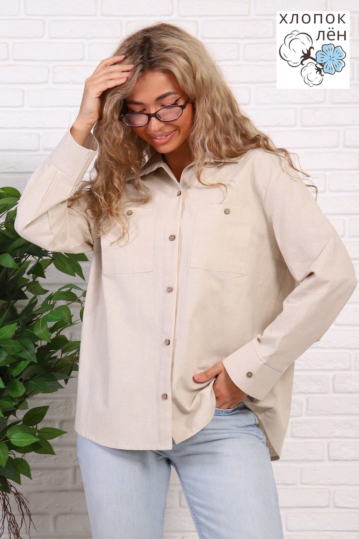 Рубашка женская офисная, свободного силуэта, длинный рукав. Из 100% натуральной ткани (хлопок 70% и лён 30%). Рубашка очень комфортная: рукава не сковывают движения; удобная длина, прикрывающая зону бедер; два нагрудных кармана, дышащая ткань. Трендовый силуэт и акцентные кокосовые пуговицы создают стиль этой рубашки. Сочетается и с денимом и с классической одеждой.