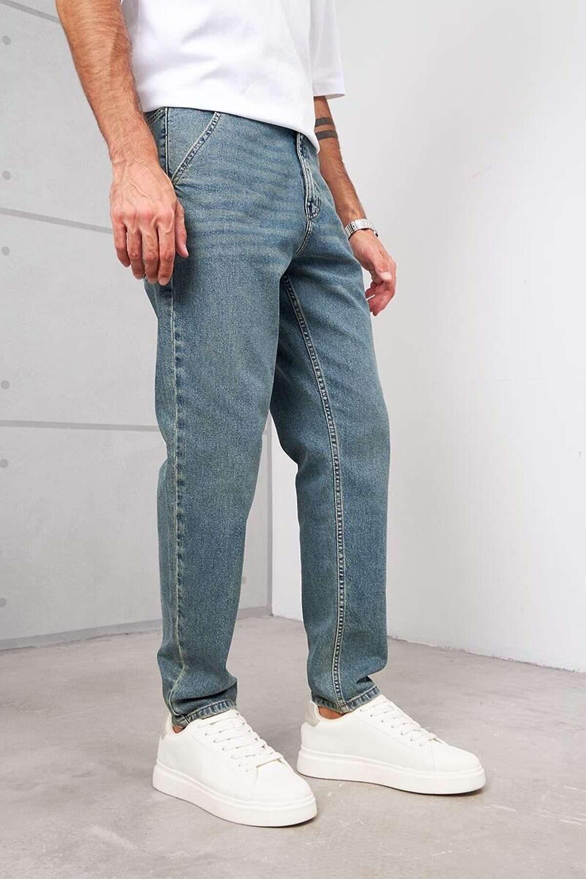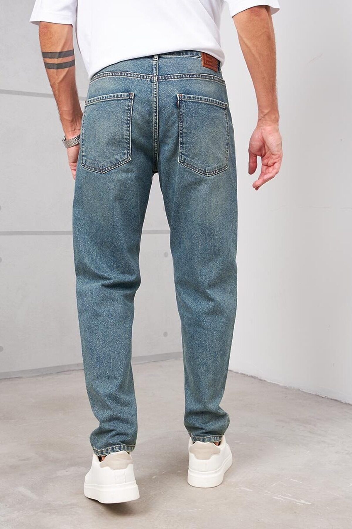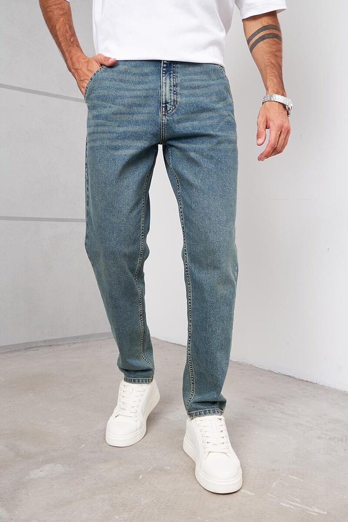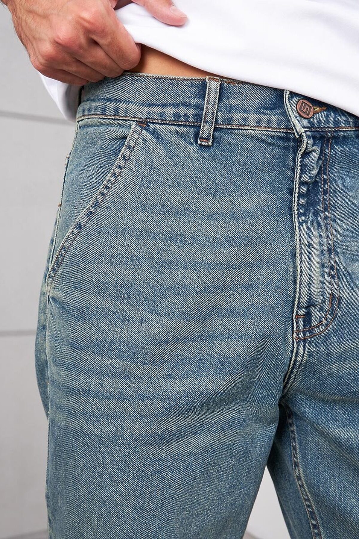 Мужские комфортные модные джинсы "Бананы" с пятью карманами. Для удобства боковые карманы джинсов сделаны косыми, т. е. карманы "хулиганы". Высокая талия, свободные по бедрам и бедру и узкие внизу. Застежка на молнии. Выполнены из классической ткани denim, Классическая средняя стирка "stone wash". Джинсы дополнительно чуть-чуть подкрашены в желтый цвет для получения эффекта "GET DIRTY", т. е. эффекта запачканных джинсов.