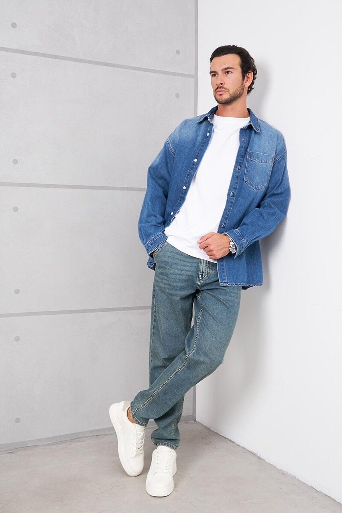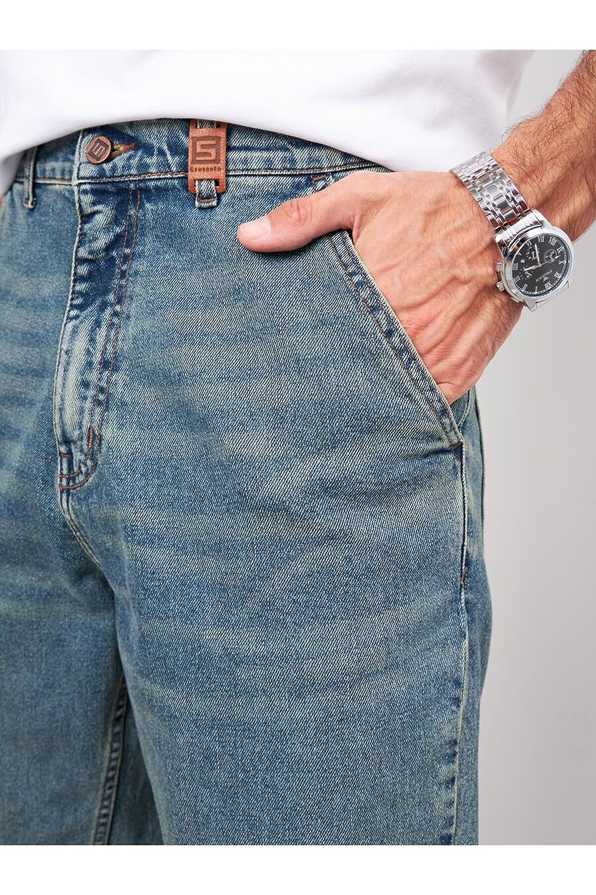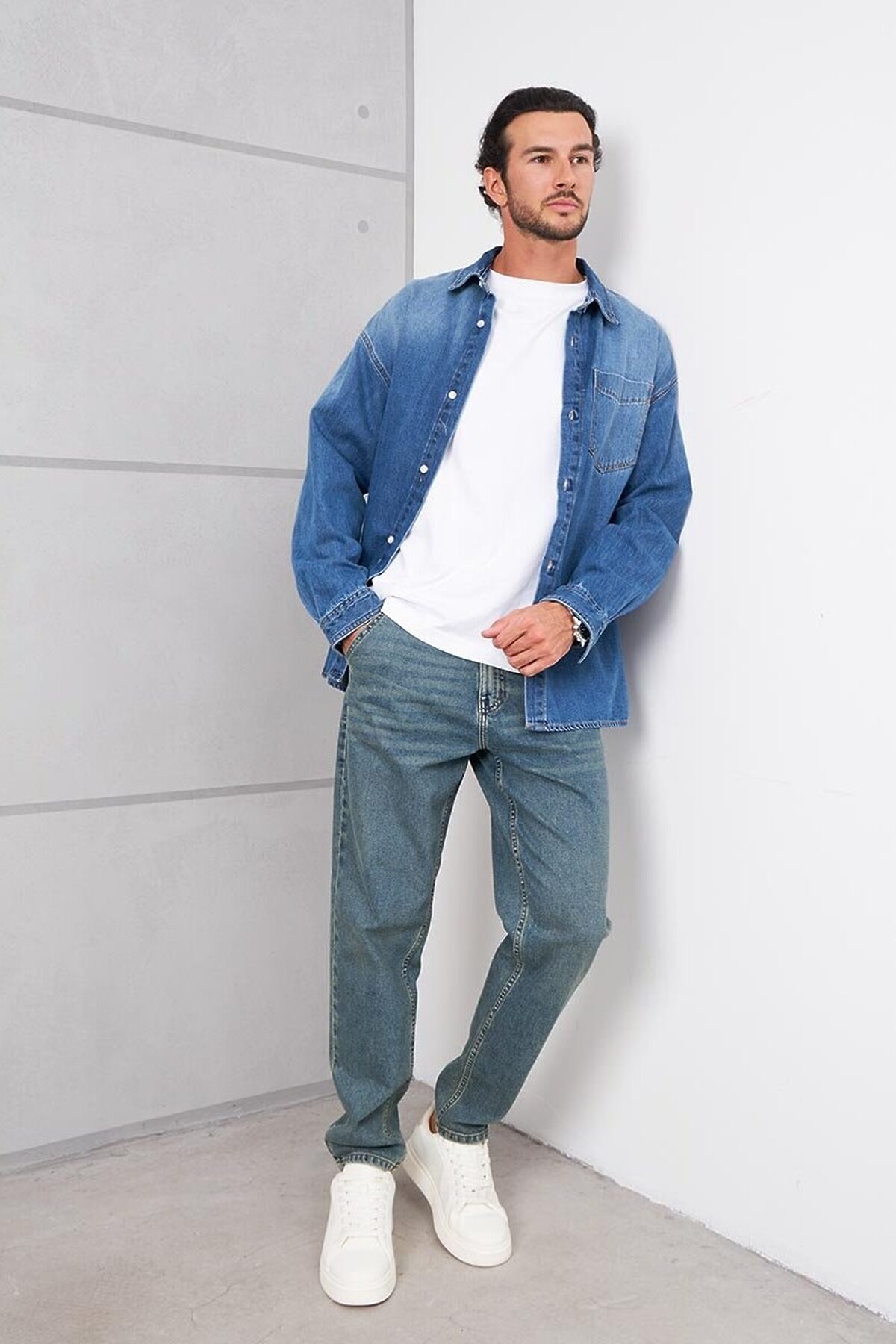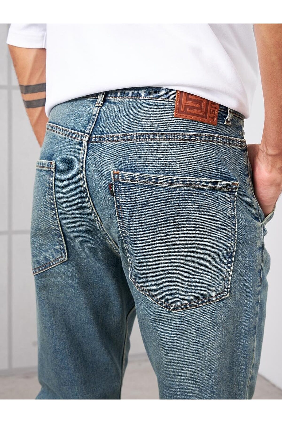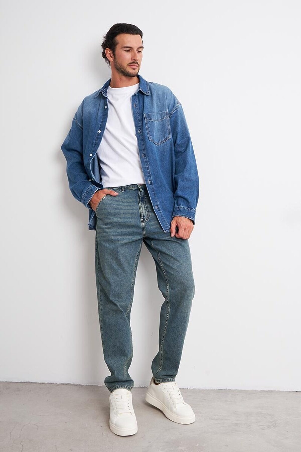 Мужские комфортные модные джинсы "Бананы" с пятью карманами. Для удобства боковые карманы джинсов сделаны косыми, т. е. карманы "хулиганы". Высокая талия, свободные по бедрам и бедру и узкие внизу. Застежка на молнии. Выполнены из классической ткани denim, Классическая средняя стирка "stone wash". Джинсы дополнительно чуть-чуть подкрашены в желтый цвет для получения эффекта "GET DIRTY", т. е. эффекта запачканных джинсов.