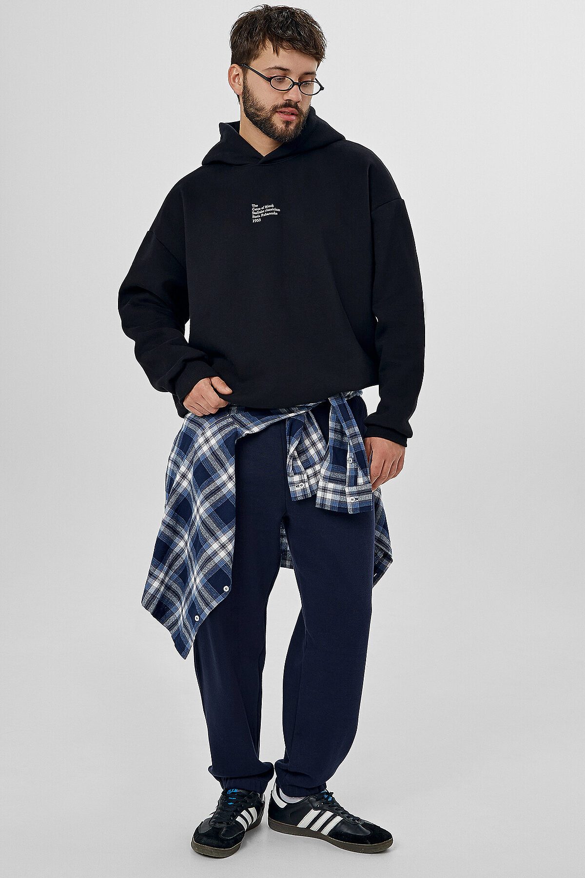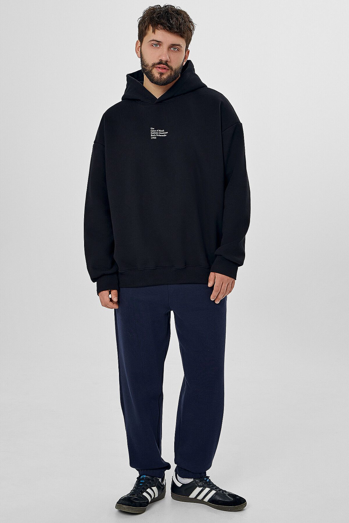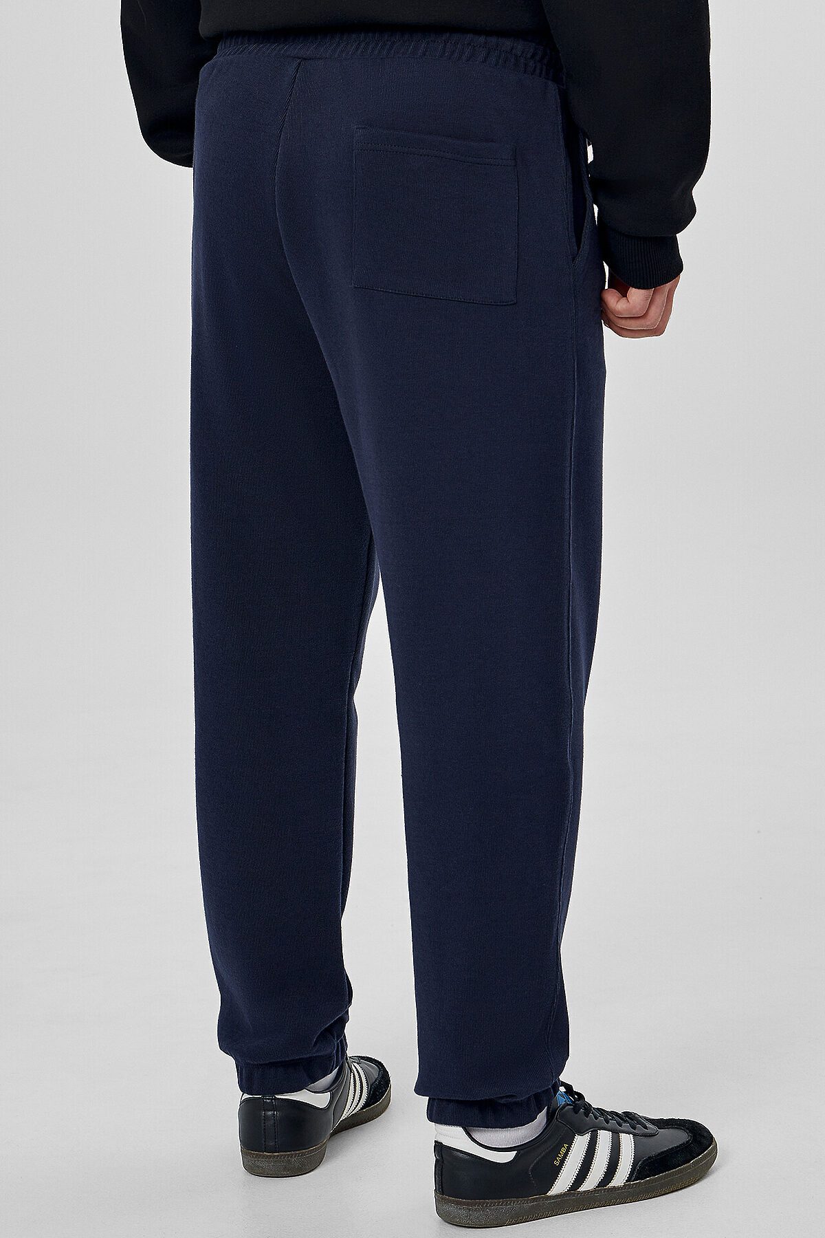 Джогеры прямые, зауженные к низу. Пояс отрезной с эластичной тесьмой внутри. С внутренней стороны пояса пробиты петли и втянут шнур с эглетами (8EКXWCp-1). В боковых швах обработаны карманы - хулиганы, подкладка карман из кулирки. На задней правой половинке накладной карман, по заданию. Нижние срезы брюк обработаны швом вподгибку с эластичной тесьмой внутри.