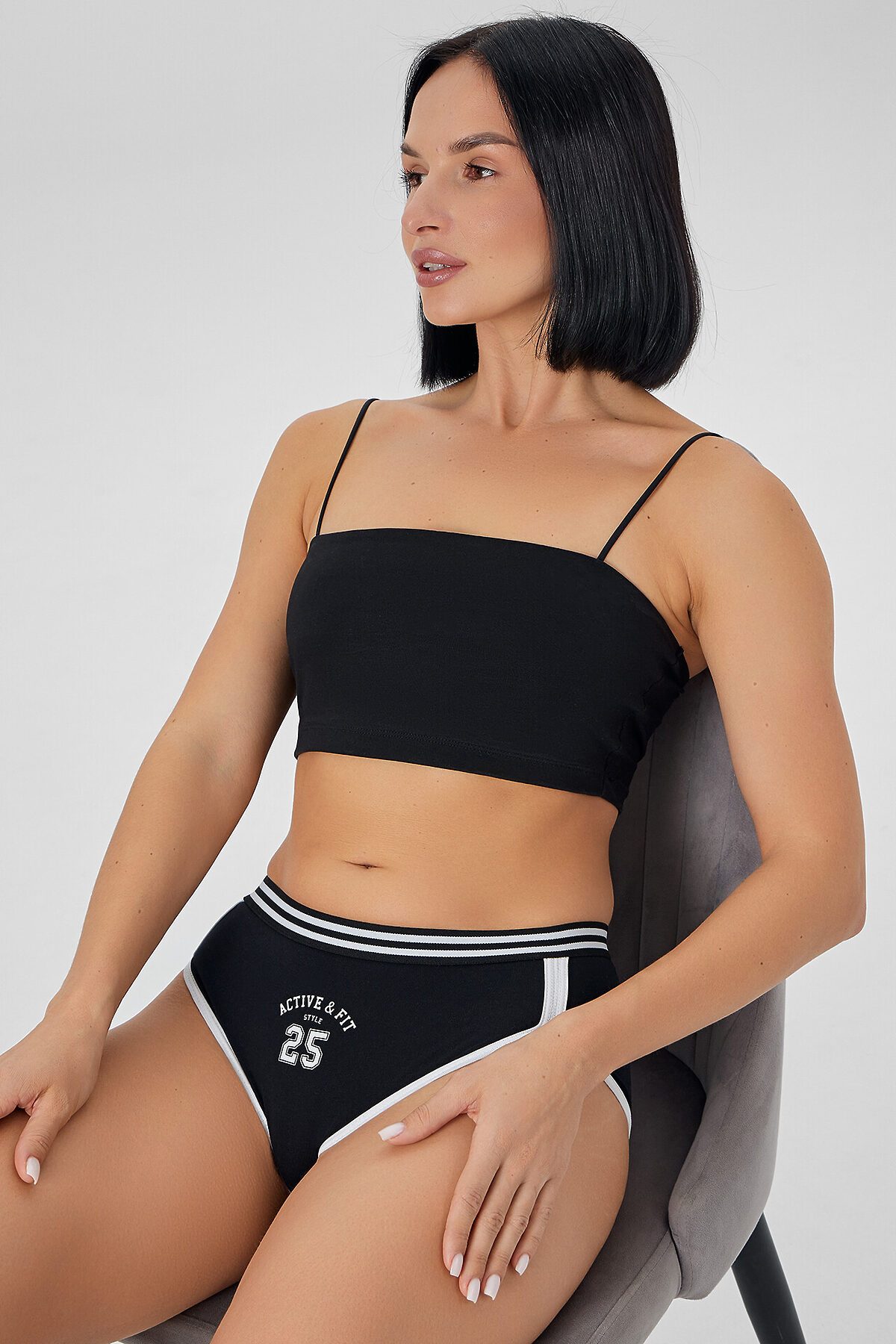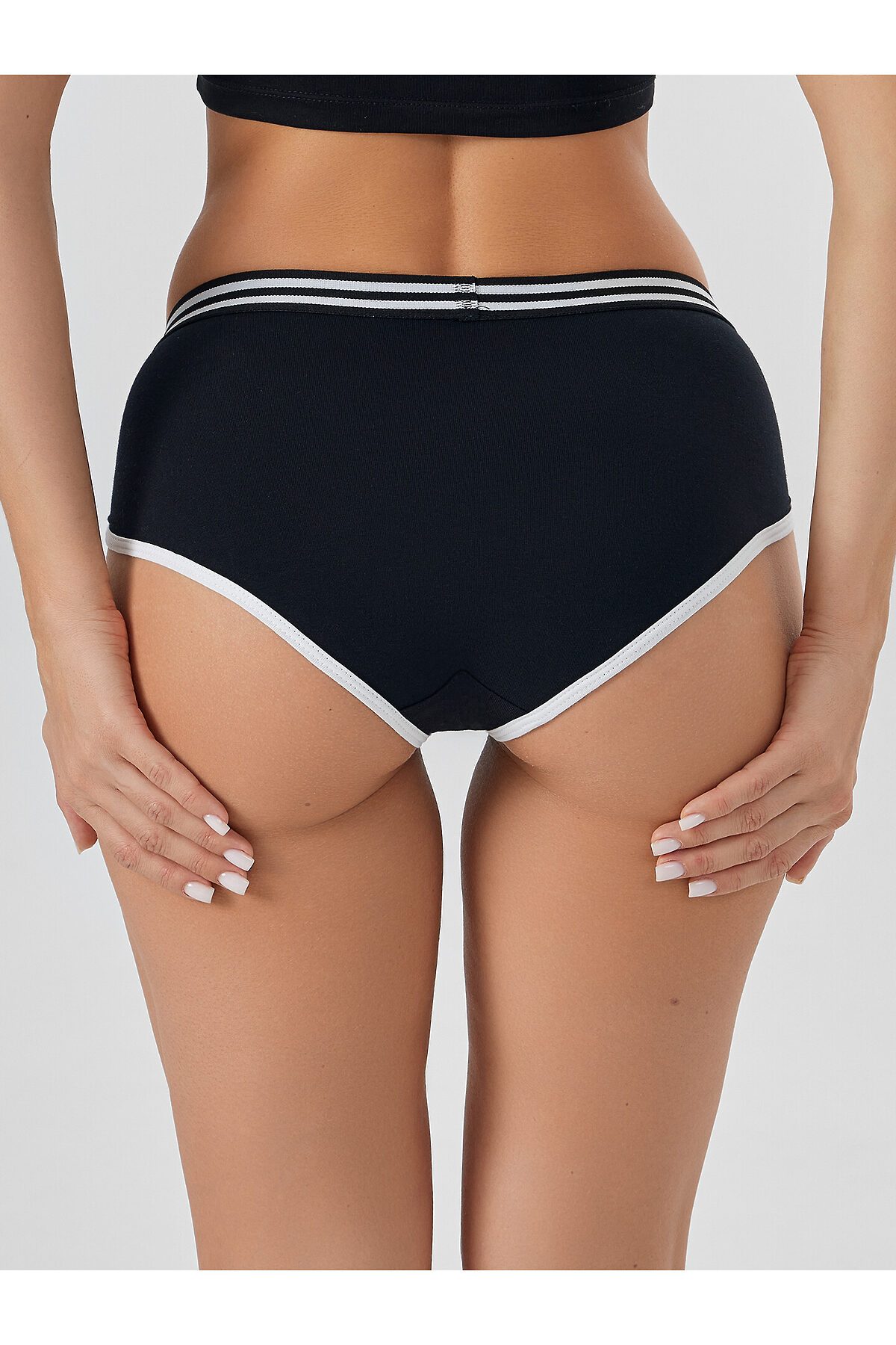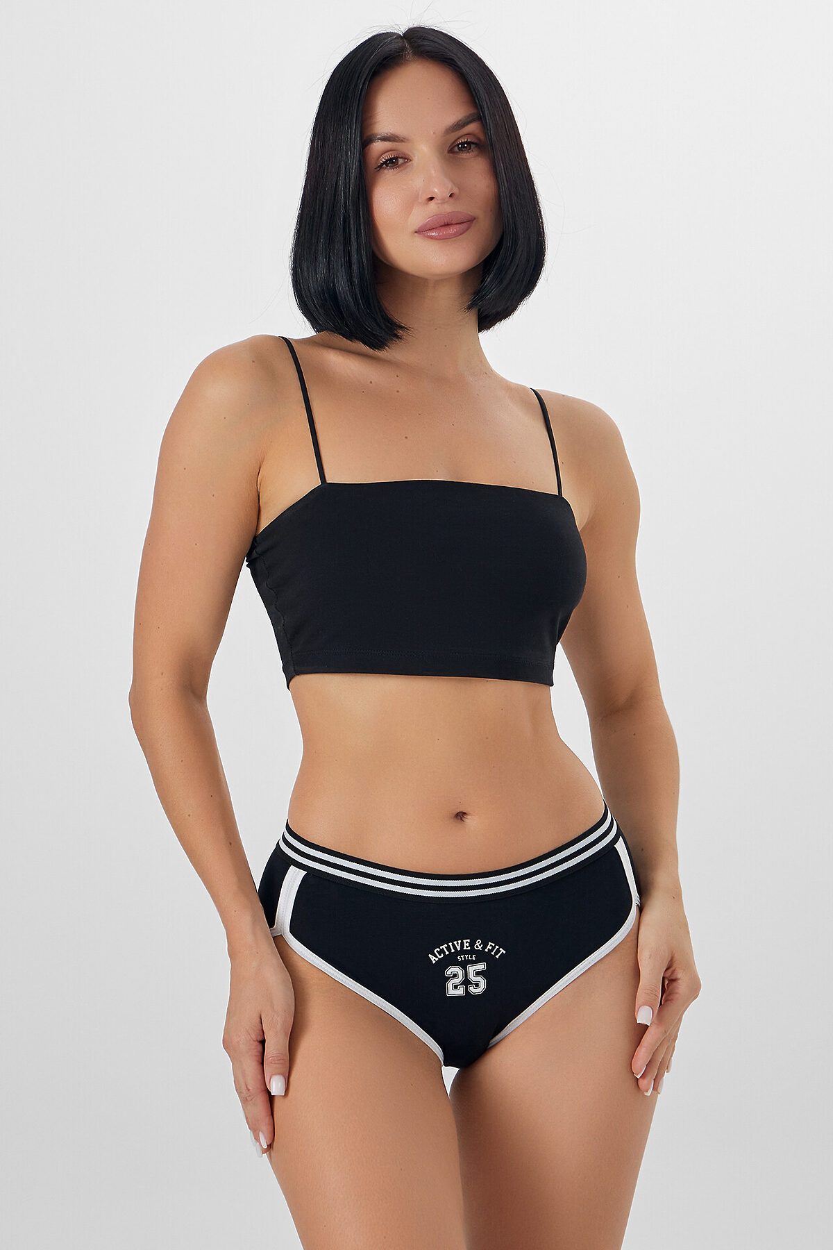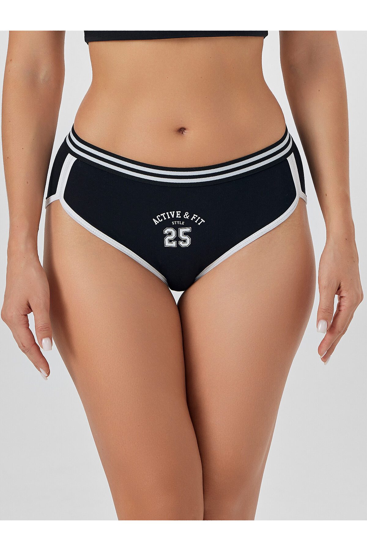 Трусы женские слипы со средней посадкой из кулирки. Передняя деталь цельная, окантована по ножкам переда и спинки бейкой из основного полотна на плоскошовной машине. Нижняя ластовица отлетная по переднему срезу, выполнена из основного полотна. По талии тесьма эл 25мм (жаккард JT19-25, УЗБ Sedat MF D-1) настрочена на плоскошовной машине.