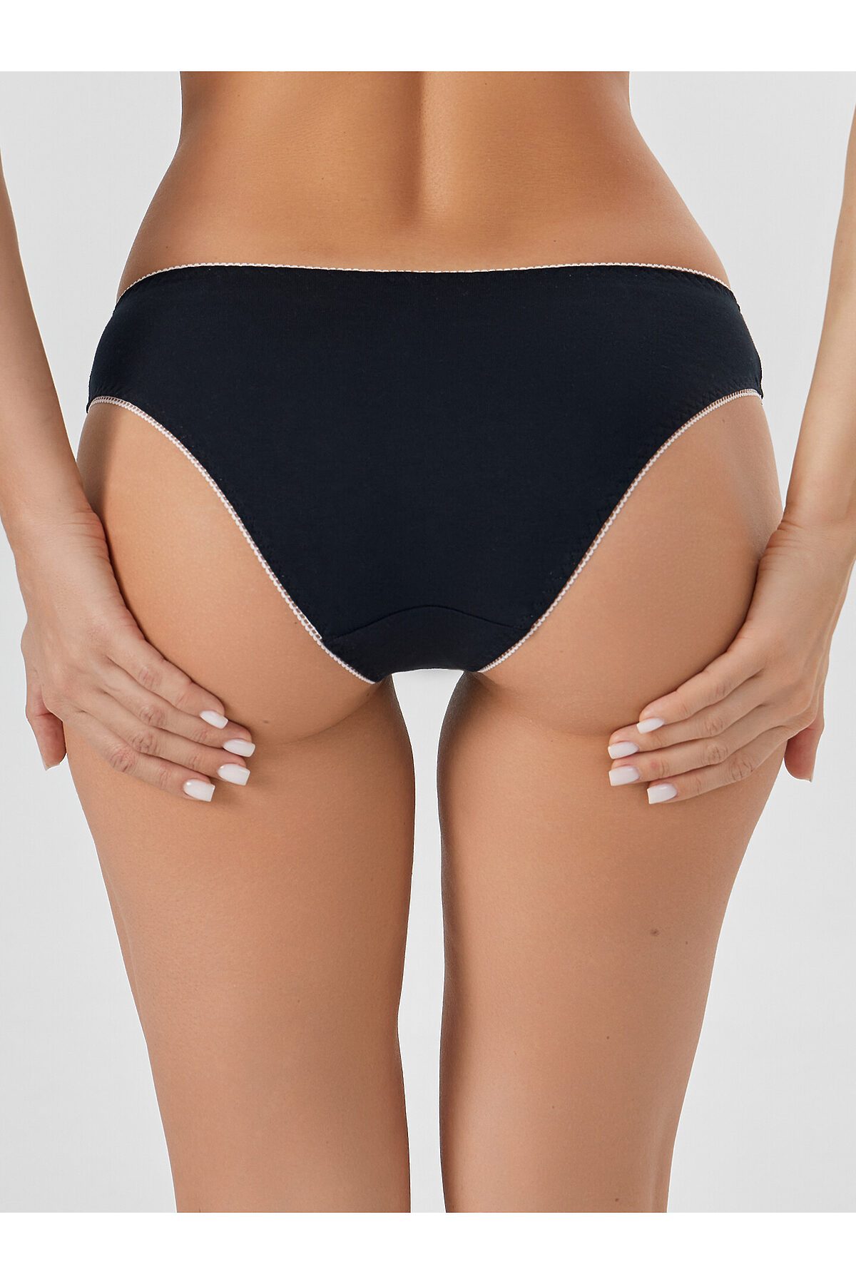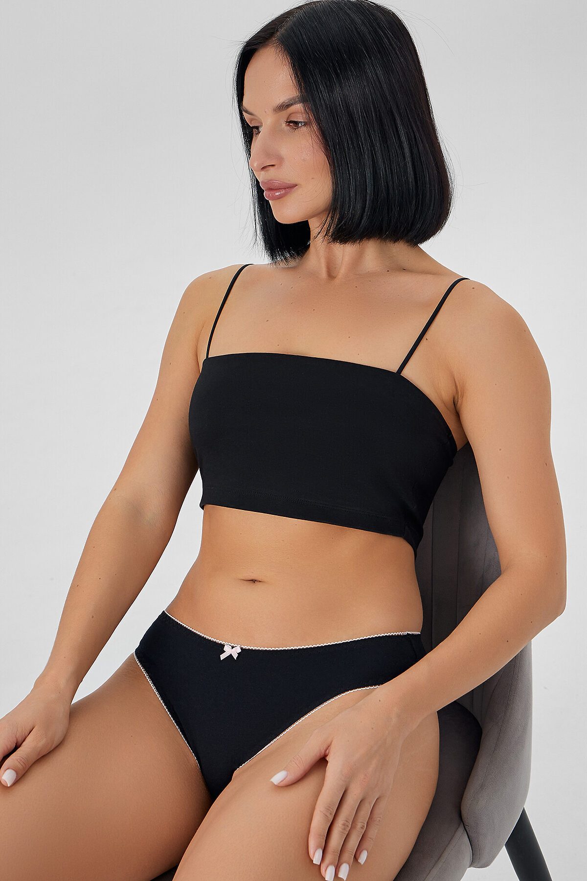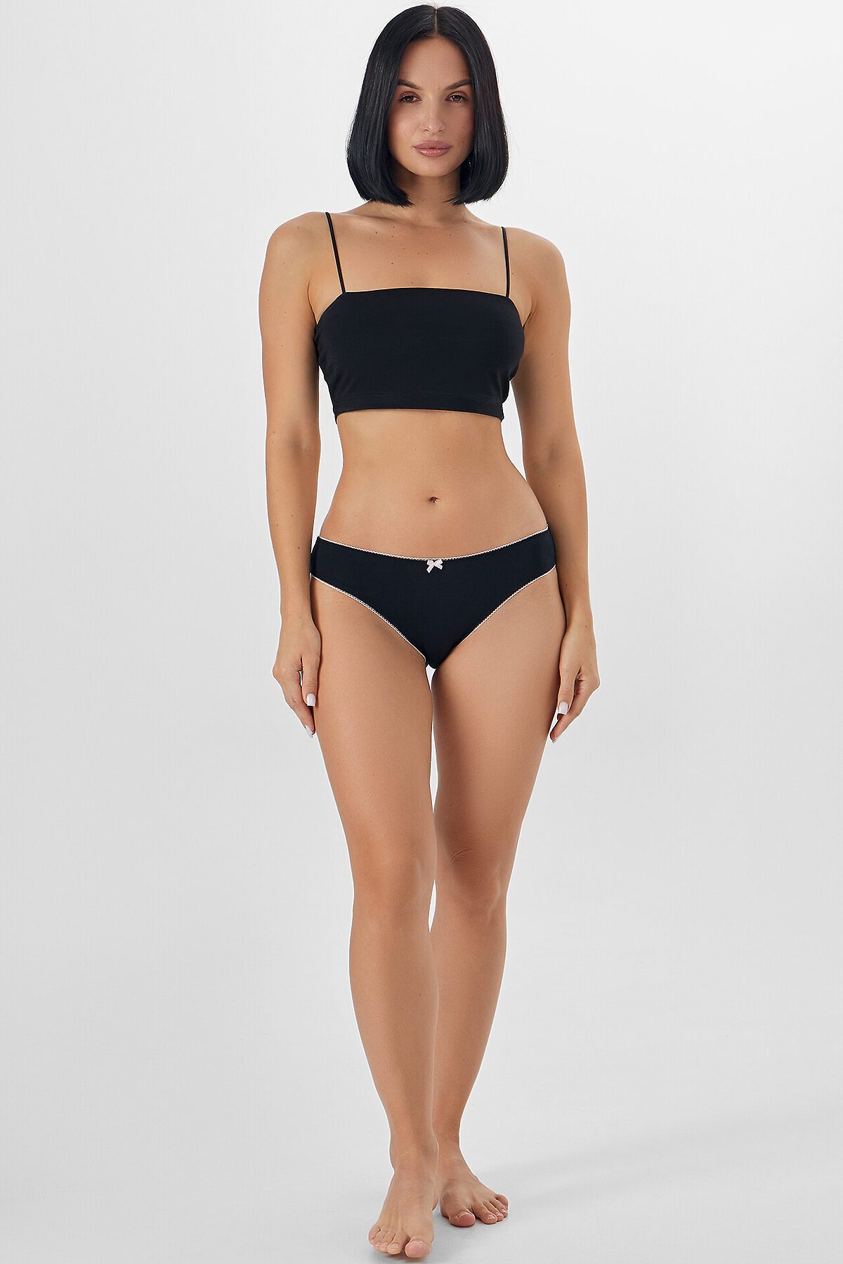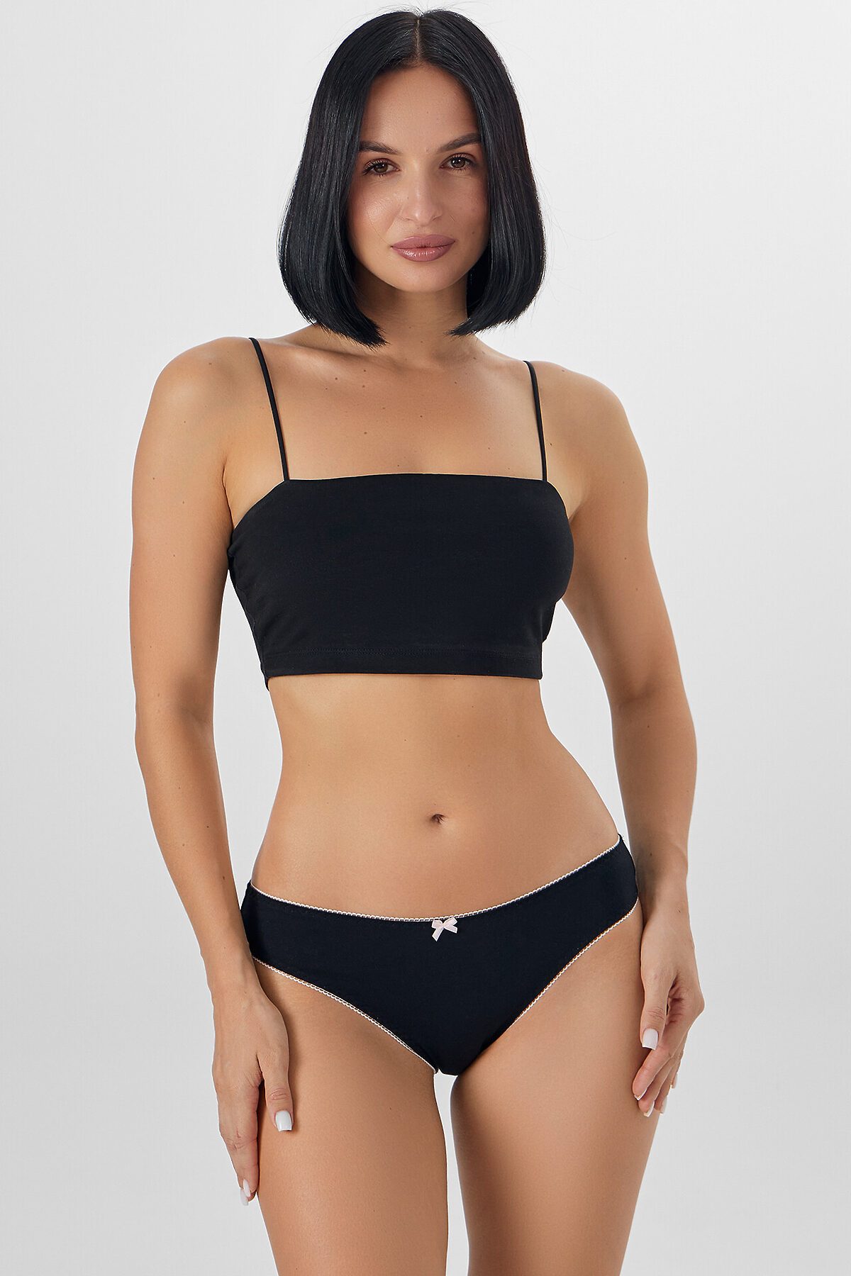 Трусы женские слипы со средней посадкой из кулирного полотна. Подкладка ластовицы из основного полотна, отлетная по переднему краю. Передняя и задняя детали цельные. Верхний срез и нижние срезы обработаны эл тесьмой 10 мм (с зубом KTE5-10, артикул с зубом Е2699 ) на 4-укольном зигзаге. По заданию! декор в виде бантика или розочки по центру передней детали.