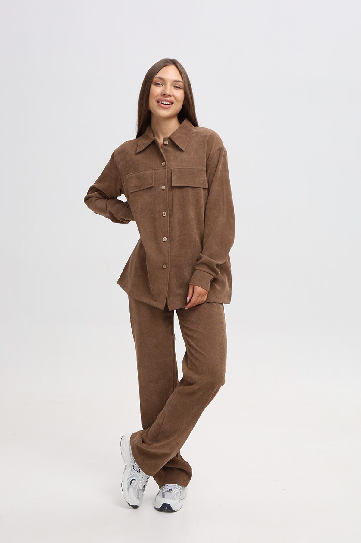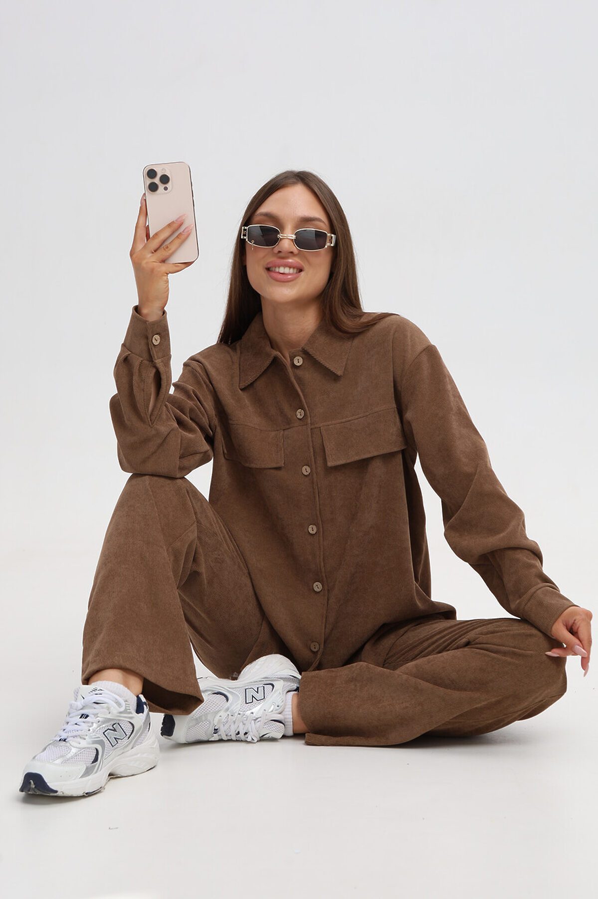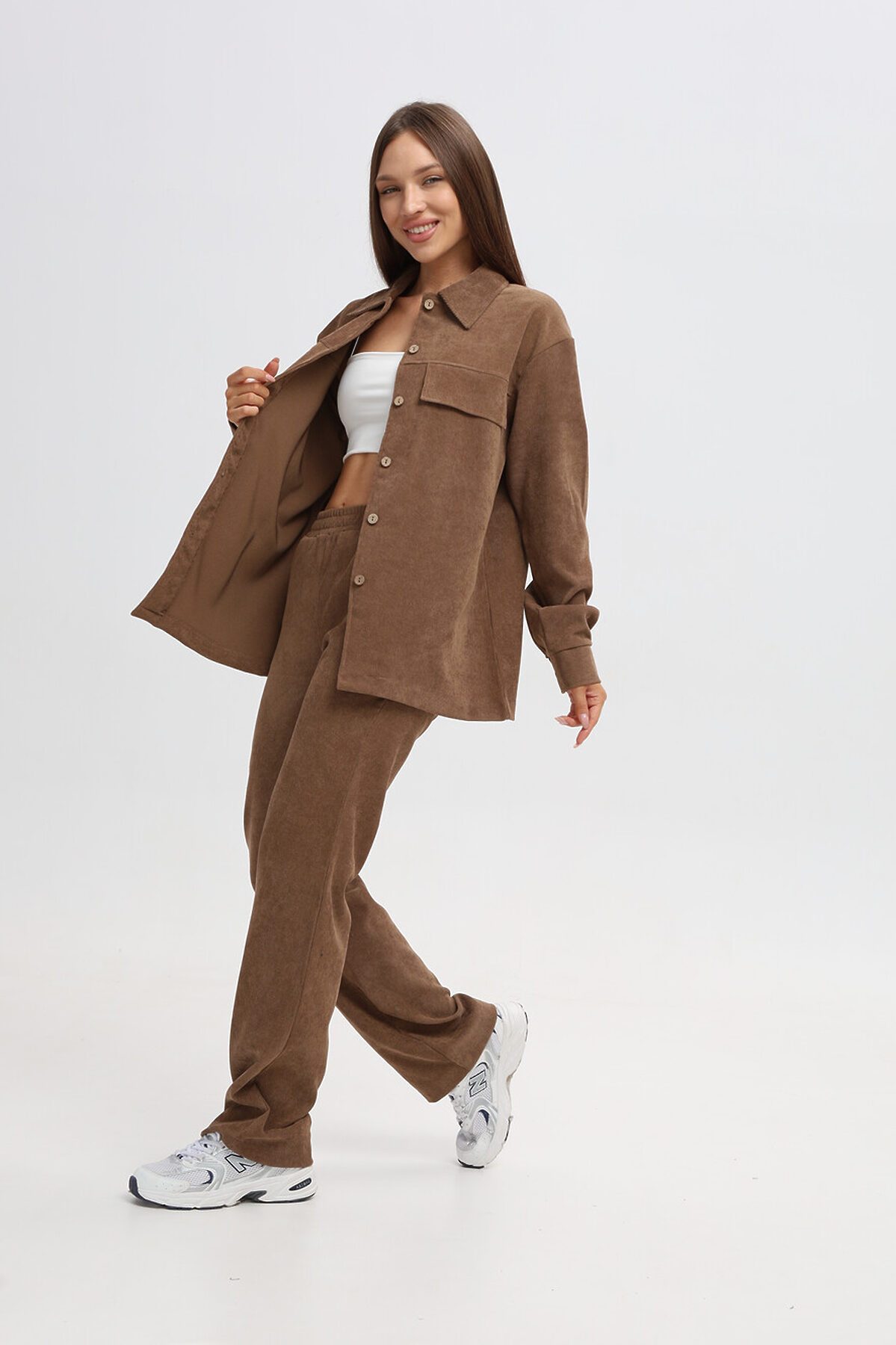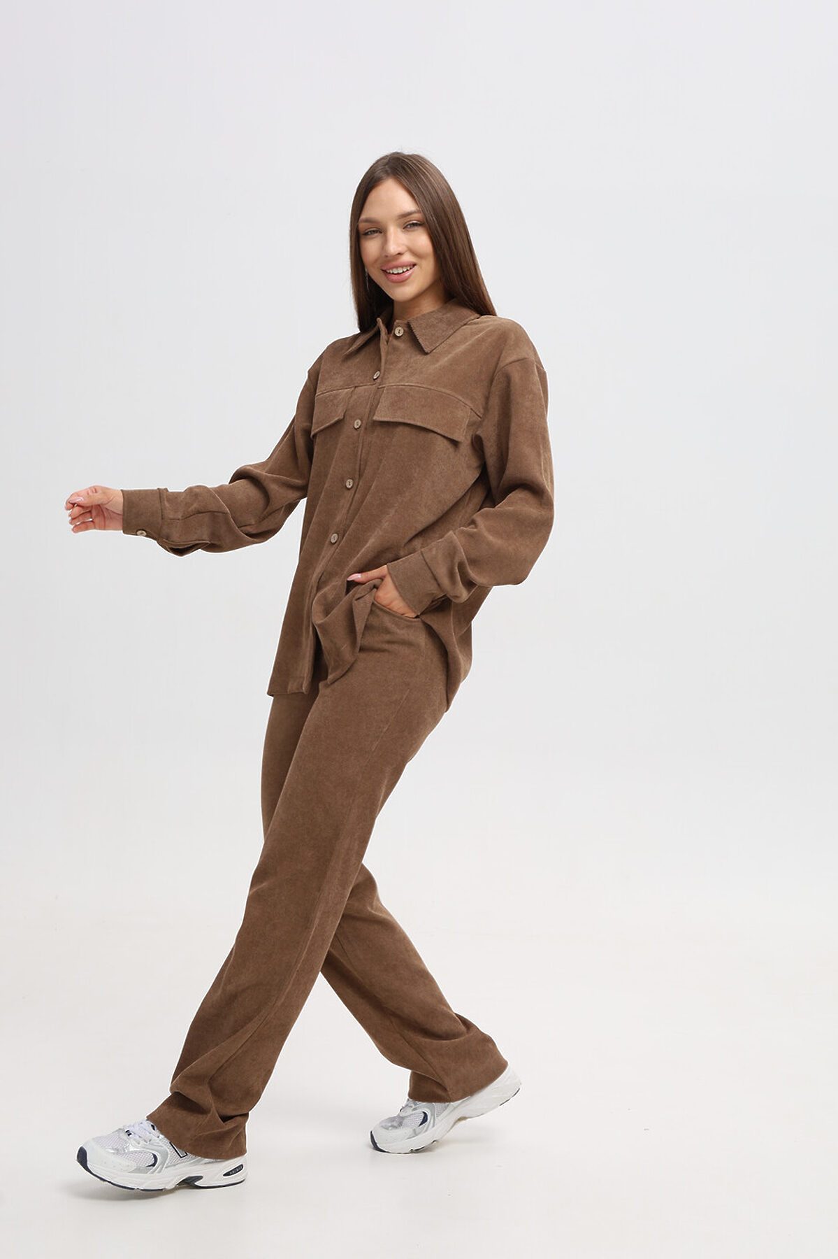 Спортивный женский костюм выполнен из мягкого вельветового материала, который придает ему модный и элегантный вид. Костюм для женщин состоит из рубашки оверсайз и брюк прямого кроя, создающих гармоничный и современный образ. Однотонный оттенок делает его универсальным для разных случаев от повседневных прогулок до офисного или делового стиля. Рубашка свободного фасона с длинными рукавами украшена классическим воротником и застегивается на пуговицы. Вельвет обладает приятной текстурой, которая сохраняет комфорт даже при длительном ношении. Брюки имеют удобные карманы, прямой силуэт, что делает их подходящими для девушек и женщин разных возрастов. Эластичный пояс обеспечивает удобную посадку, а продуманная длина визуально вытягивает силуэт. Удобная и трендовая одежда в современном стиле, которая дополнит базовые и спортивные образы или молодежный лук в стиле casual (кэжуал). Нарядный костюм отлично подойдет как для осенних прохладных дней, так и для создания стильных летних образов. Женский костюм-двойка отличается универсальностью благодаря сочетанию комфорта и модного дизайна. Он может использоваться как спортивный наряд для активного отдыха или домашний вариант для уюта в холодное время года. Актуальный oversize крой подчеркивает современные тенденции в мире моды.