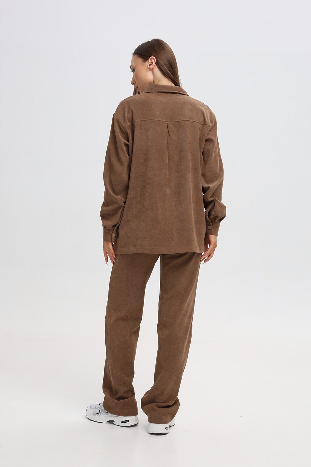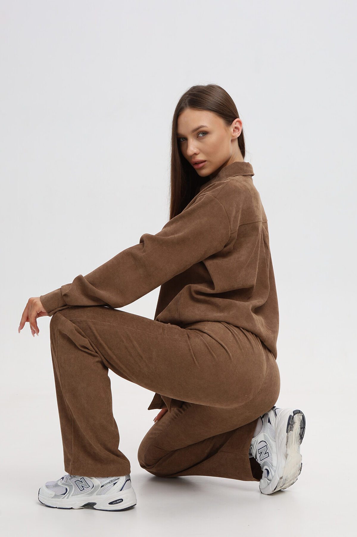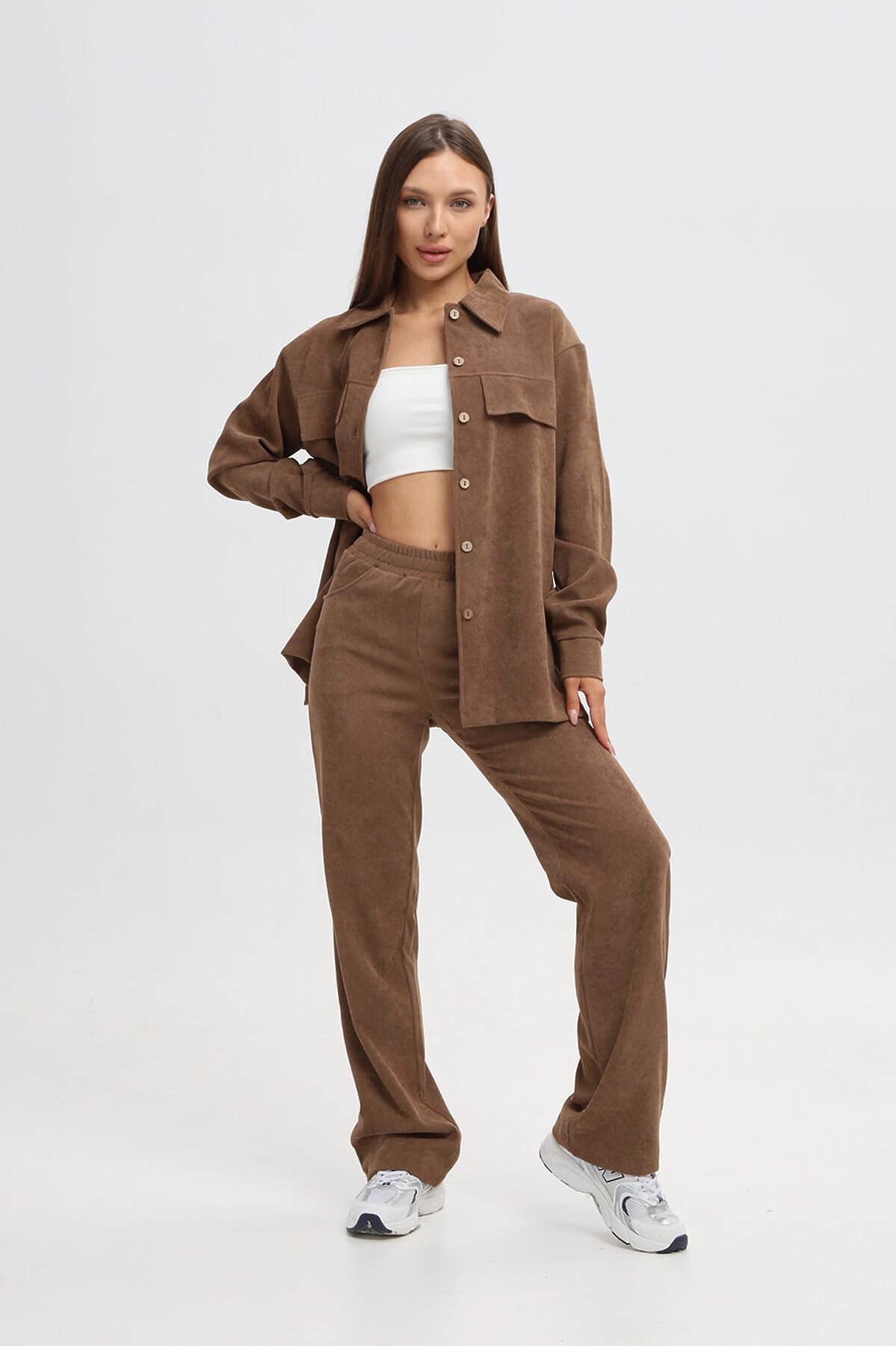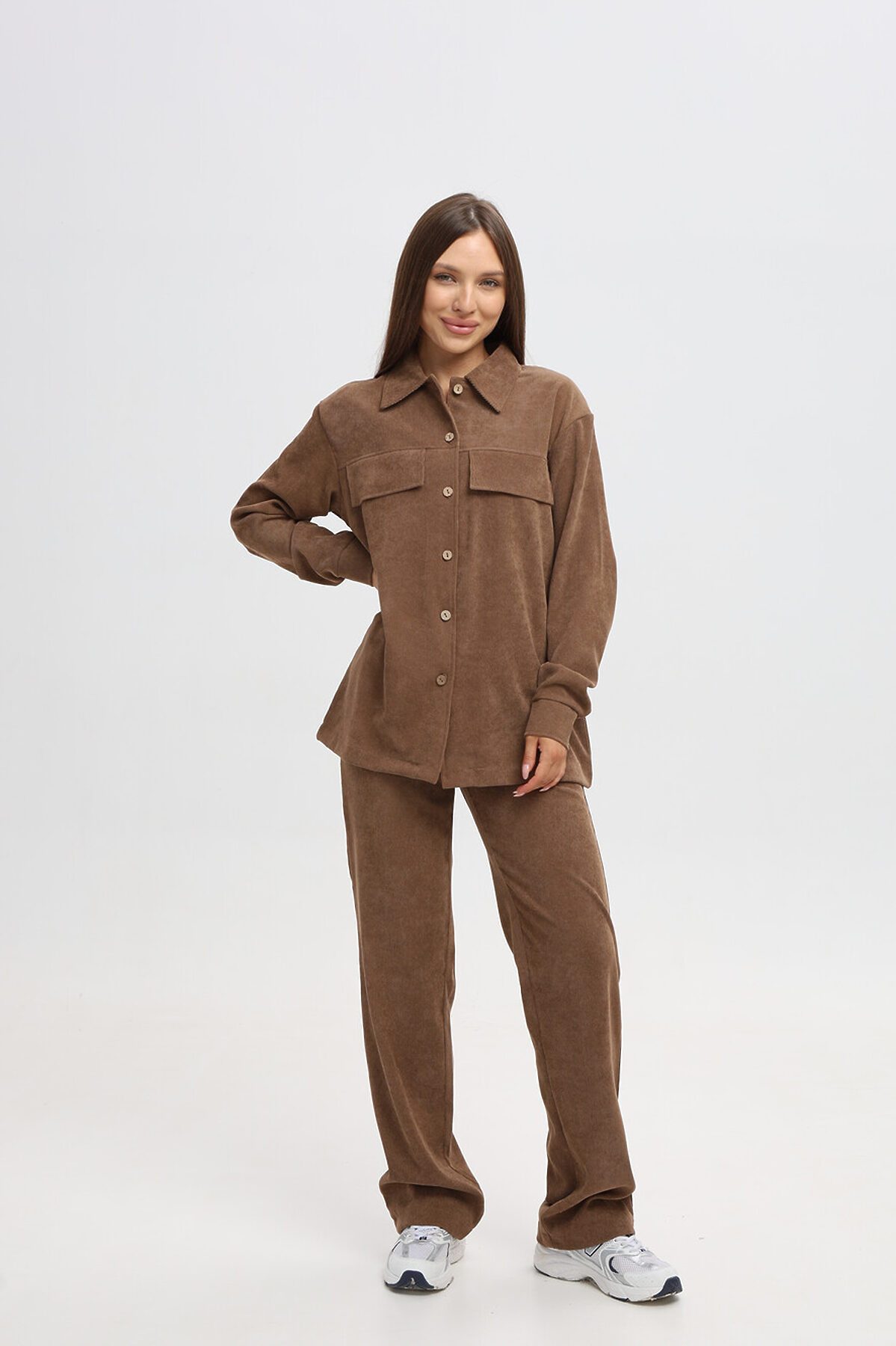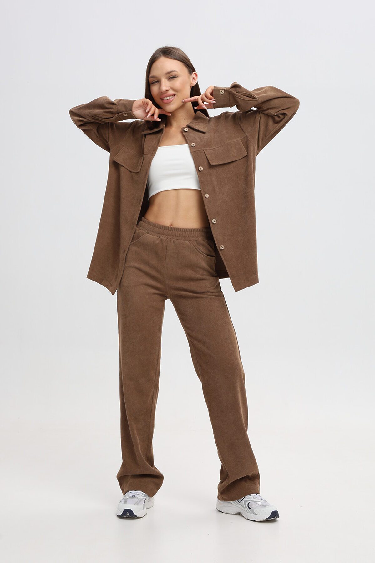 Спортивный женский костюм выполнен из мягкого вельветового материала, который придает ему модный и элегантный вид. Костюм для женщин состоит из рубашки оверсайз и брюк прямого кроя, создающих гармоничный и современный образ. Однотонный оттенок делает его универсальным для разных случаев от повседневных прогулок до офисного или делового стиля. Рубашка свободного фасона с длинными рукавами украшена классическим воротником и застегивается на пуговицы. Вельвет обладает приятной текстурой, которая сохраняет комфорт даже при длительном ношении. Брюки имеют удобные карманы, прямой силуэт, что делает их подходящими для девушек и женщин разных возрастов. Эластичный пояс обеспечивает удобную посадку, а продуманная длина визуально вытягивает силуэт. Удобная и трендовая одежда в современном стиле, которая дополнит базовые и спортивные образы или молодежный лук в стиле casual (кэжуал). Нарядный костюм отлично подойдет как для осенних прохладных дней, так и для создания стильных летних образов. Женский костюм-двойка отличается универсальностью благодаря сочетанию комфорта и модного дизайна. Он может использоваться как спортивный наряд для активного отдыха или домашний вариант для уюта в холодное время года. Актуальный oversize крой подчеркивает современные тенденции в мире моды.