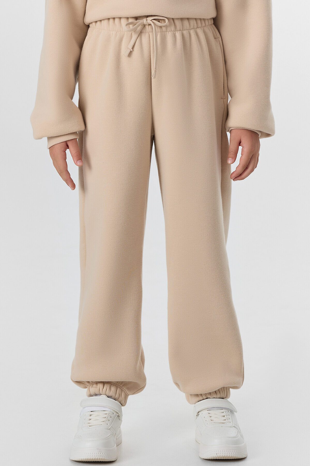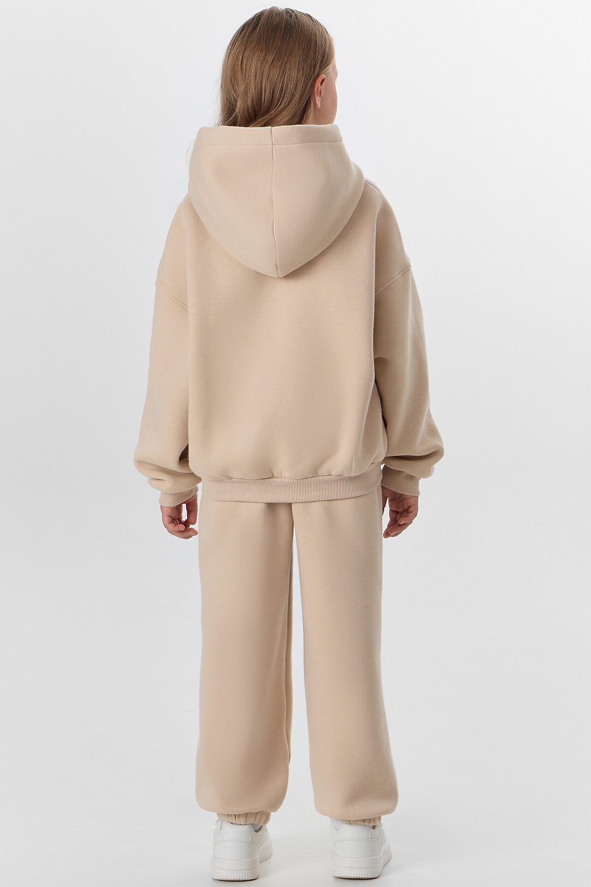 Худи для девочек, свободного силуэта (оверсайз), с капюшоном. Горловина округлой формы. Капюшон со средним швом, на подкладке из основного полотна. Плечо спущено, рукав втачной длинный. Боковые швы перенесены вперед. По низу рукава отрезная манжета из рибаны. Брюки- джогеры прямого силуэта с карманами в боковых швах. Пояс цельнокроеный с внутренней эластичной тесьмой 40RV. С внешней стороны пояса пробиты петли и втянут шнур 8PXС-2. Низ изделия обработан швом в подгибку, внутрь застрочена эластичная тесьма 30RV.