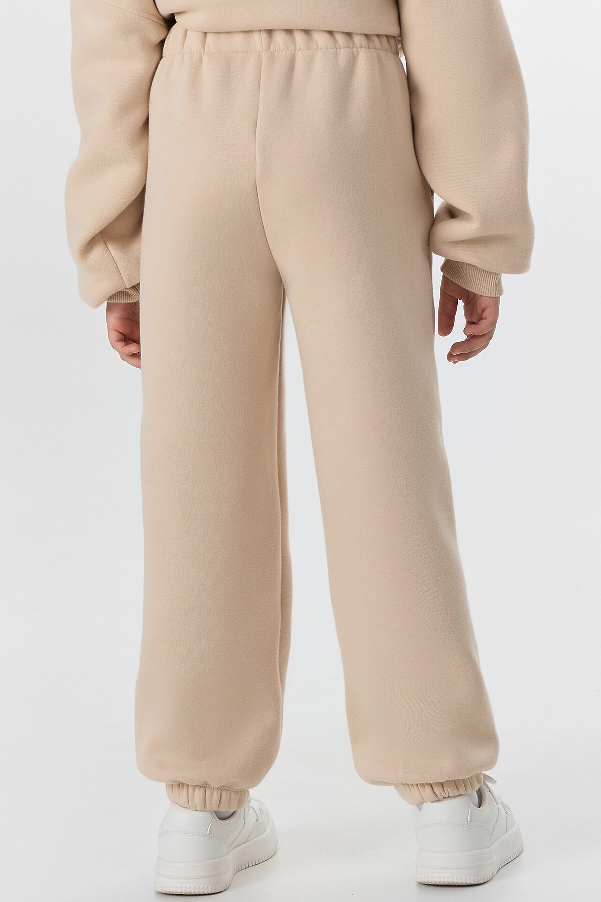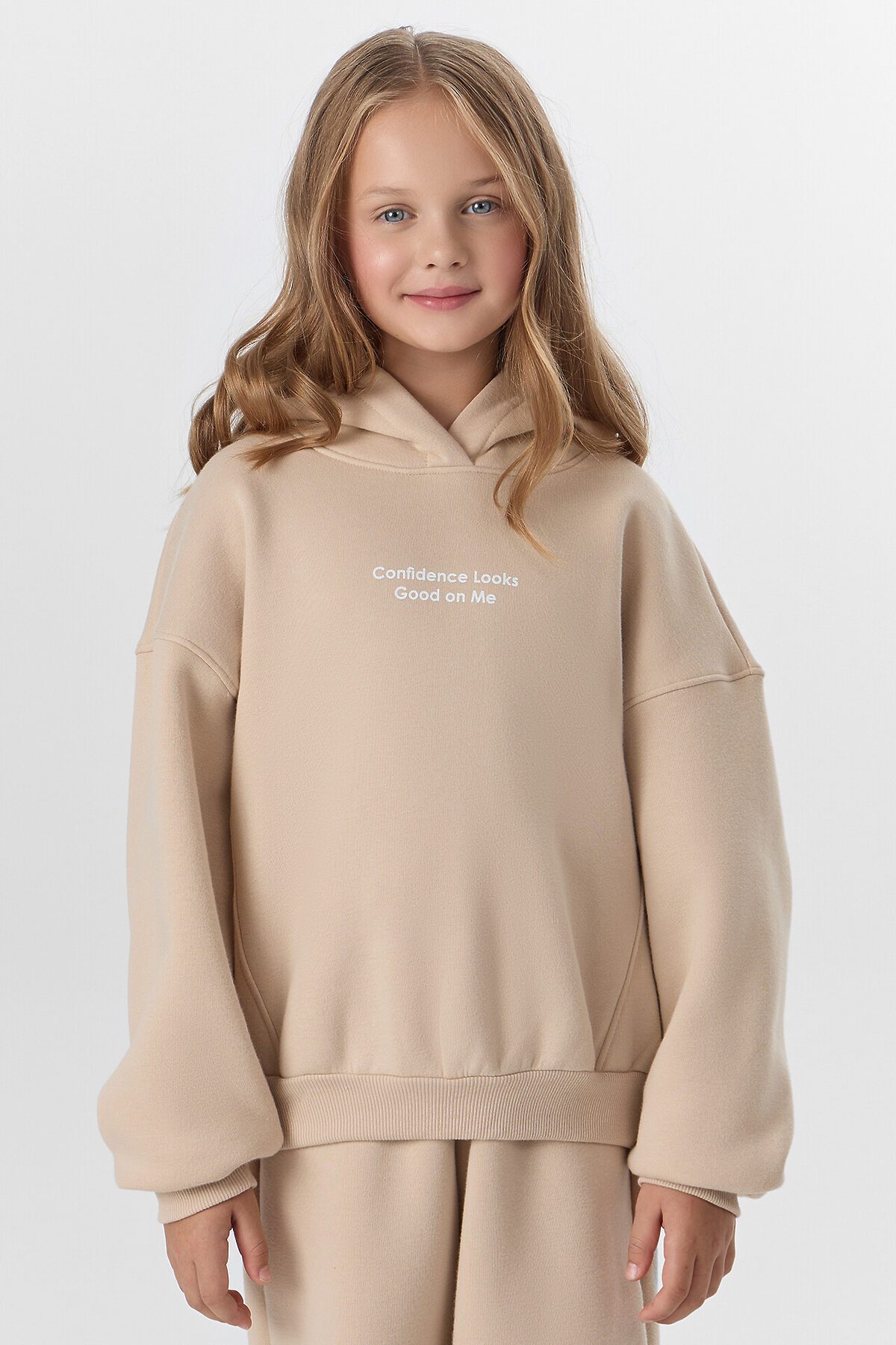 Худи для девочек, свободного силуэта (оверсайз), с капюшоном. Горловина округлой формы. Капюшон со средним швом, на подкладке из основного полотна. Плечо спущено, рукав втачной длинный. Боковые швы перенесены вперед. По низу рукава отрезная манжета из рибаны. Брюки- джогеры прямого силуэта с карманами в боковых швах. Пояс цельнокроеный с внутренней эластичной тесьмой 40RV. С внешней стороны пояса пробиты петли и втянут шнур 8PXС-2. Низ изделия обработан швом в подгибку, внутрь застрочена эластичная тесьма 30RV.