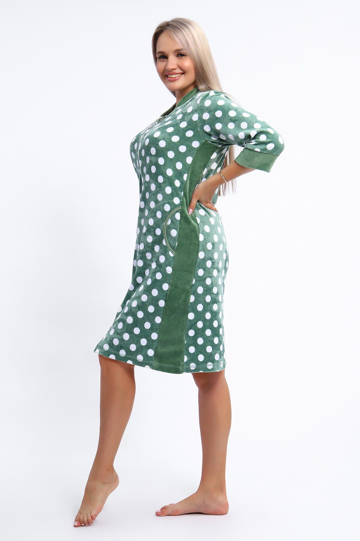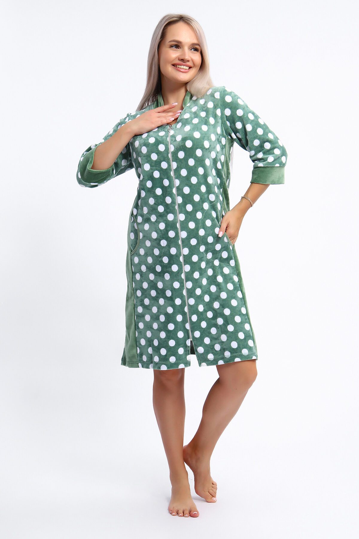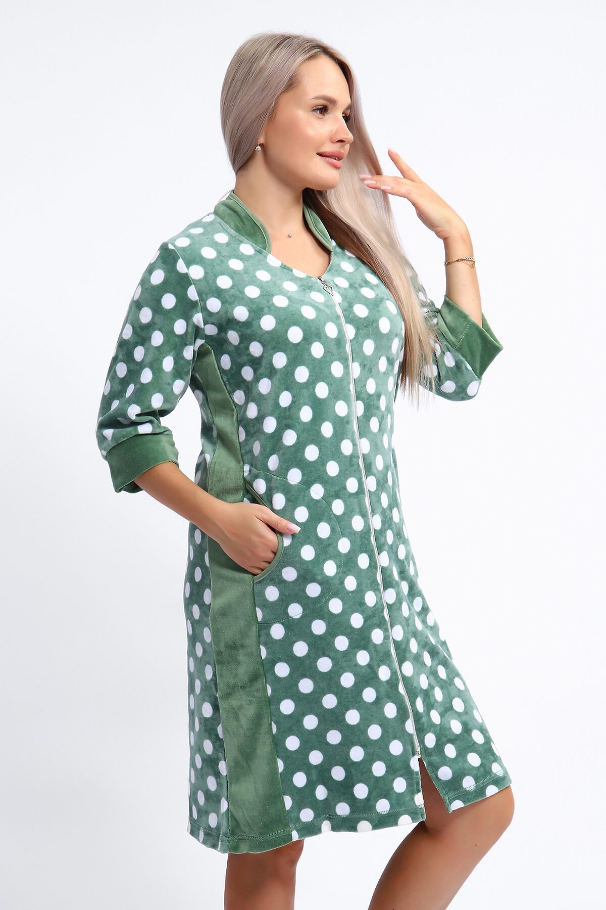 Халат велюровый на молнии в горошек. Воротник-стойка, рукава 3/4 на манжете, по бокам однотонная вставка, с карманами. Ткань велюр, качество отличное, после стирки цвет не теряет, не деформируется, приятное к телу. Для дома и отдыха.