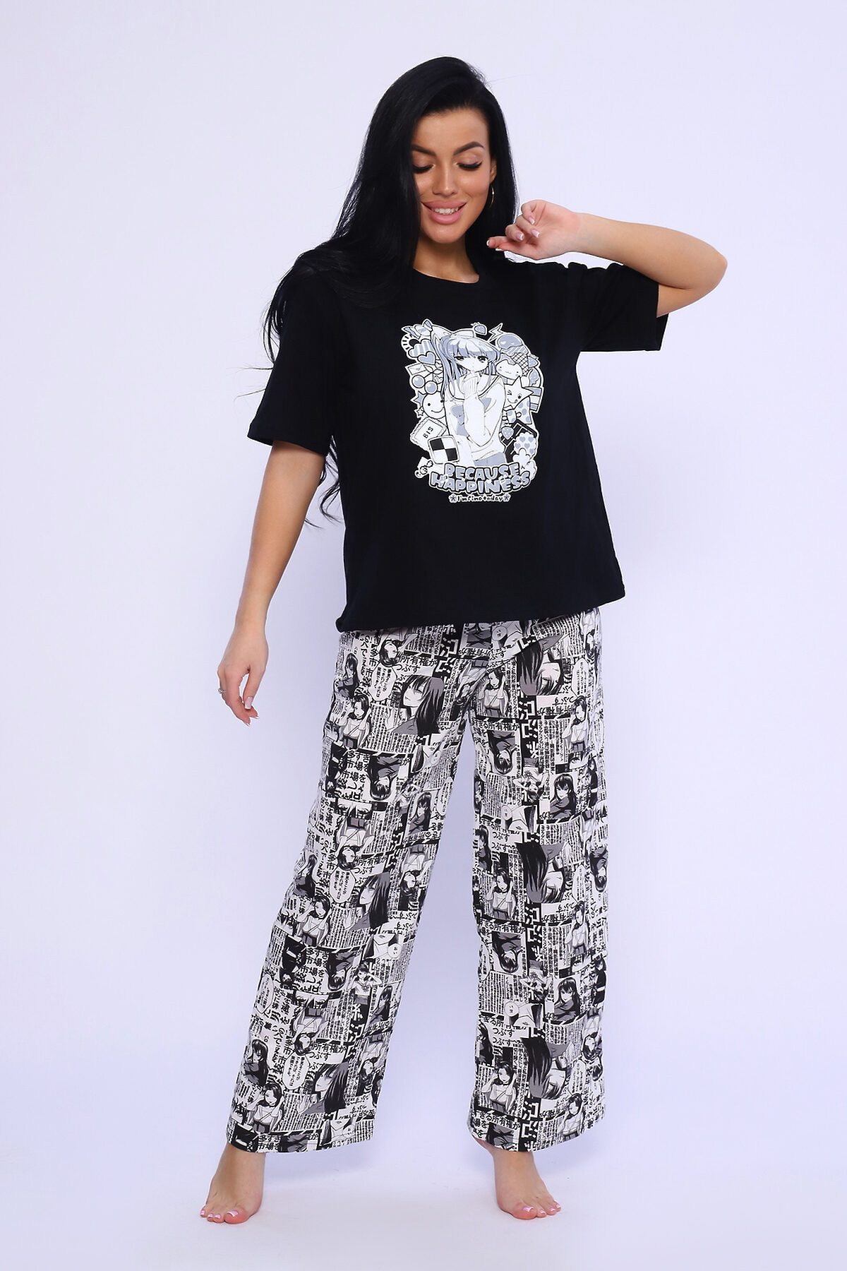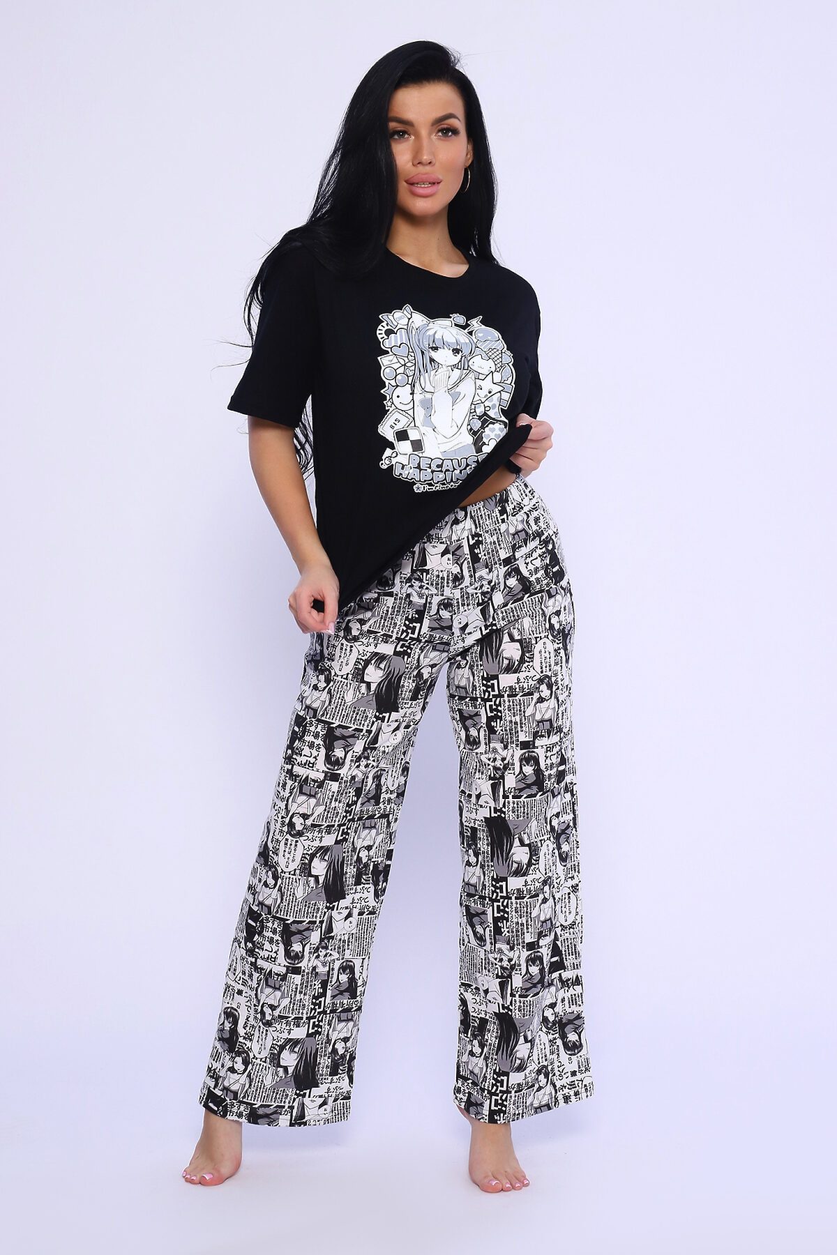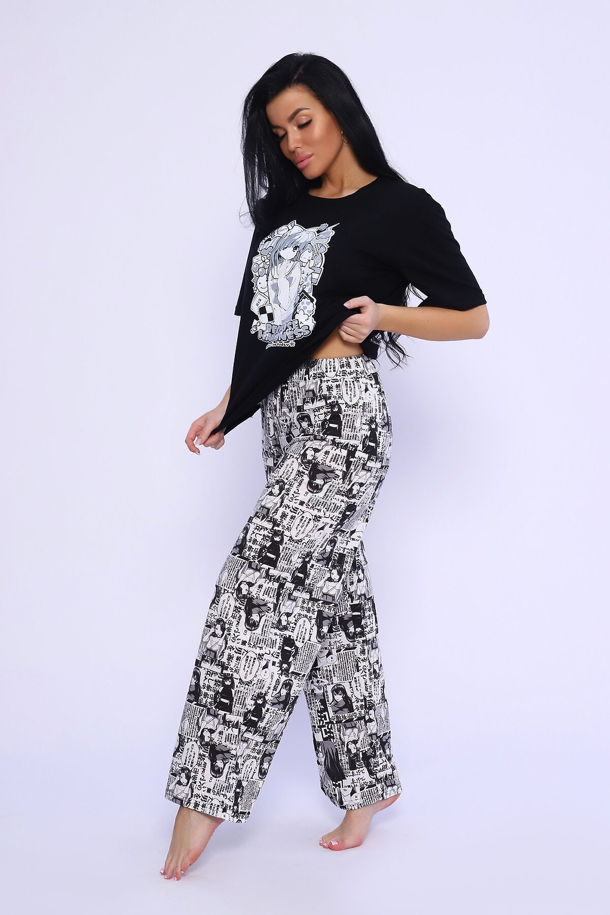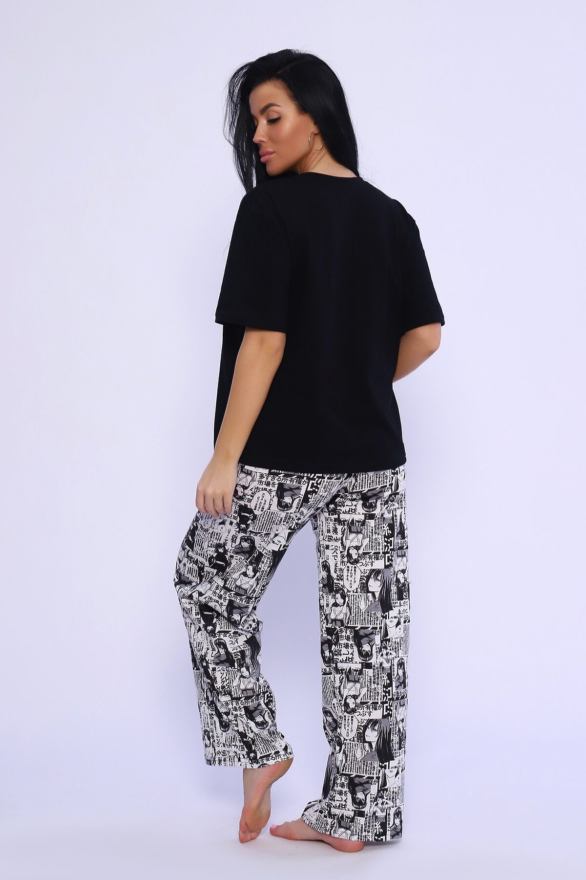 Костюм домашний, футболка прямого кроя с коротким рукавом и брюки свободного кроя.
