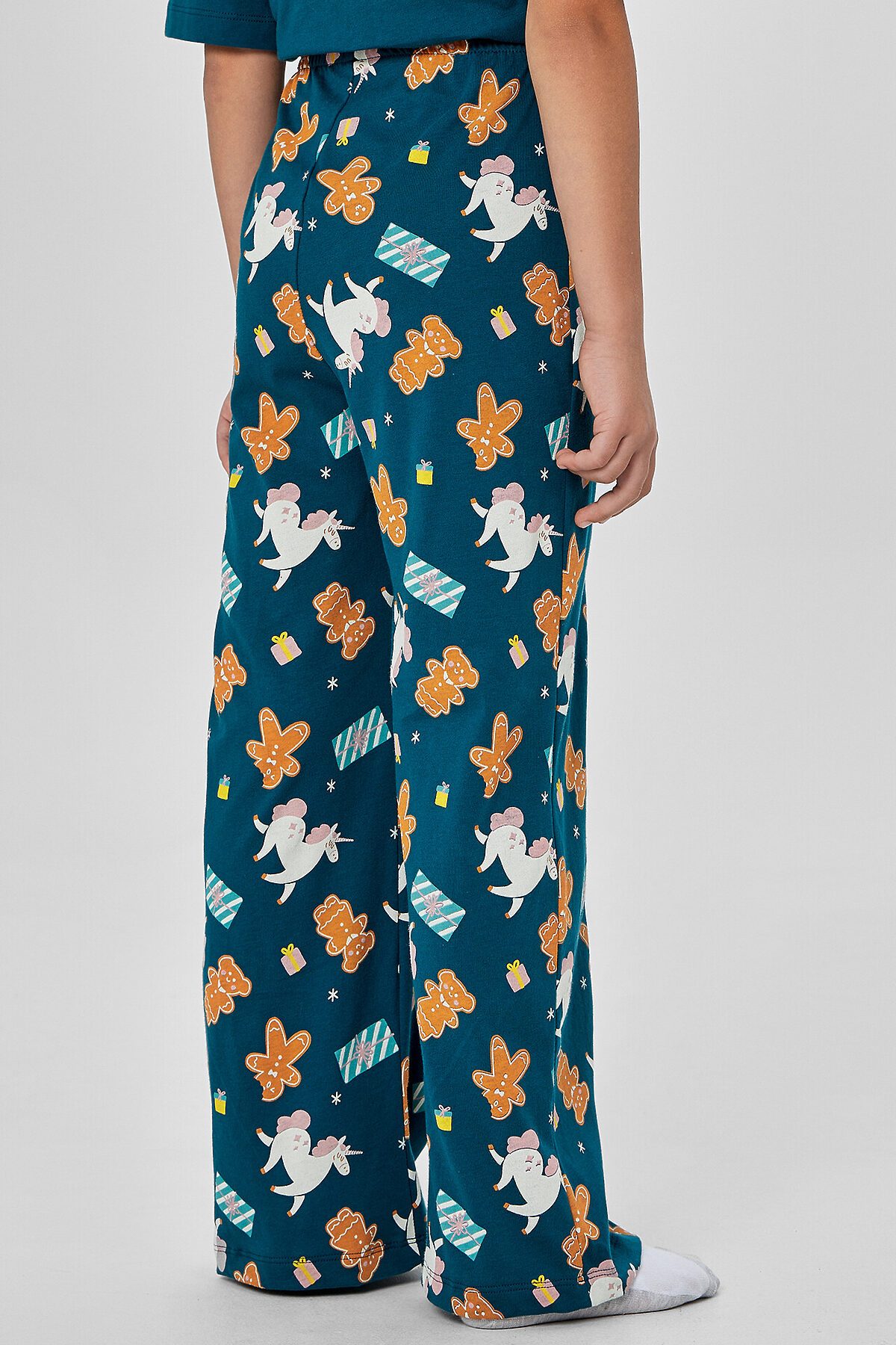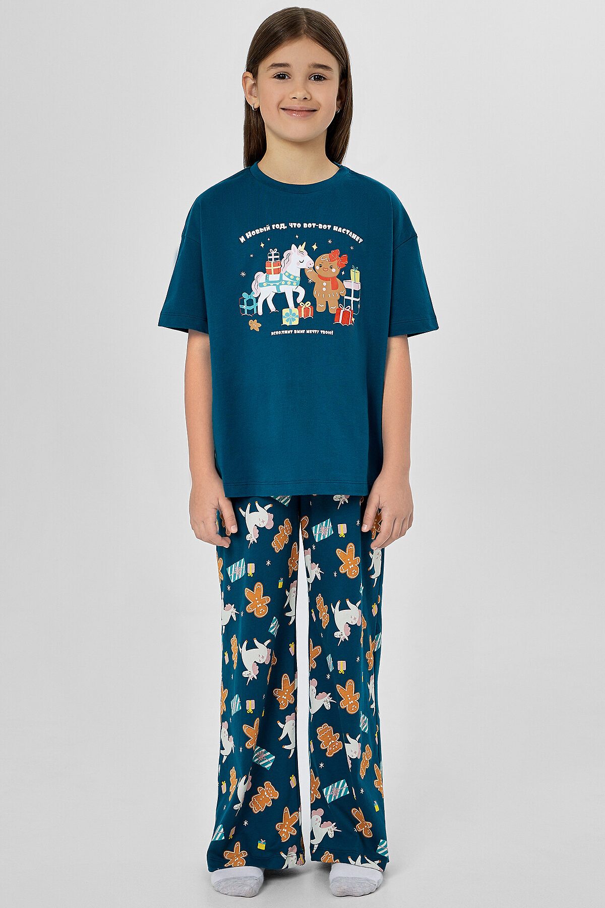 Комплект для девочек состоит из джемпера и брюк. Джемпер прямого, свободного силуэта. Перед и спинка цельнокроеные. Плечо слегка спущено. Горловина круглой формы с притачной обтачкой из основного полотна. Рукав втачной, одношовный, короткий. Брюки прямого, свободного силуэта. Пояс цельнокроеный с эластичной тесьмой внутри(внутрення резина 30RV), ширина 30 мм. Низ джемпера и брюк обработан на 2-х игольной плоскошовной машине швом в подгибку
