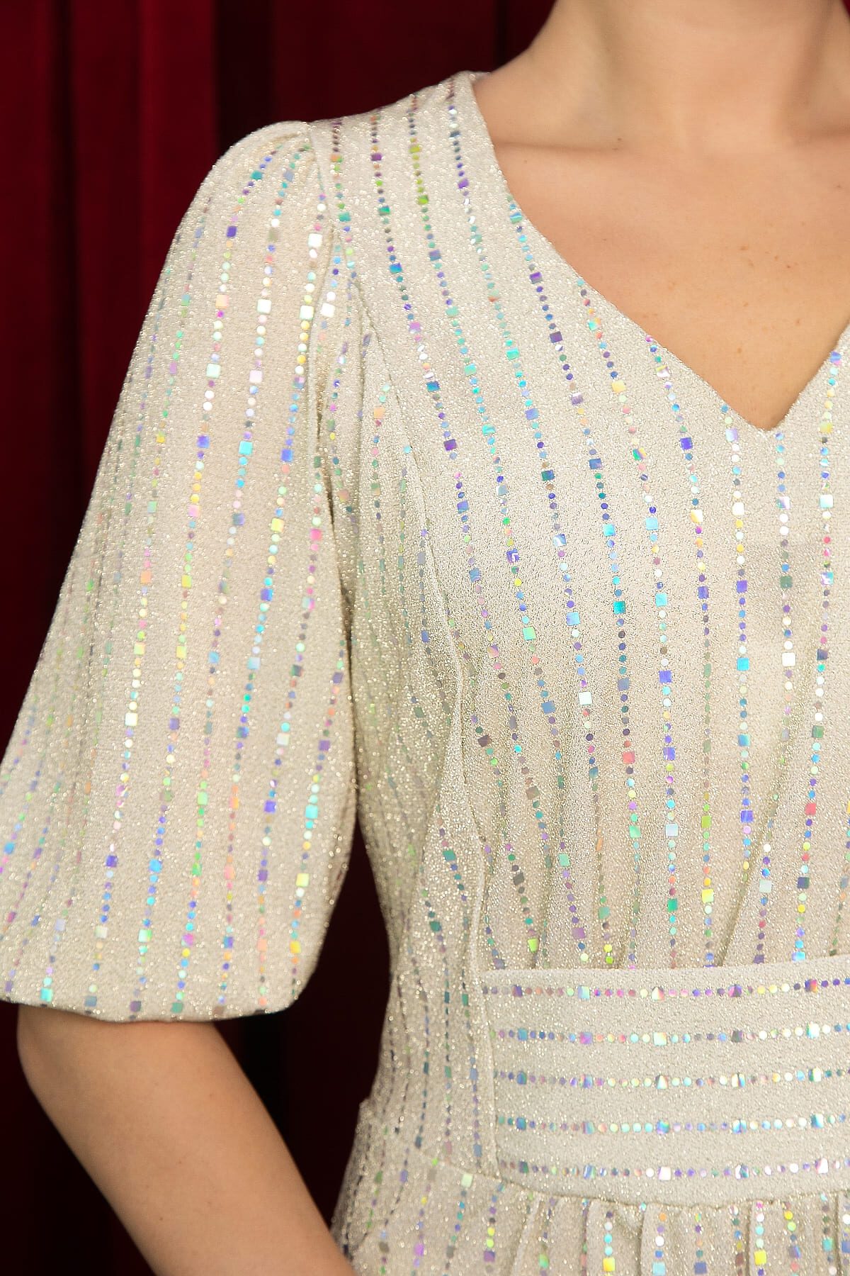 Праздничное приталенное платье длины миди в невероятном оттенке белого золота — элегантное решение для вашего вечернего образа! Благодаря отрезной талии оно гармонично подчеркивает фигуру, а расклешенная юбка придаёт образу легкость и женственность. Рукав реглан средней длины с мягкой сборкой сверху и собранный на резинку внизу создают стильный и комфортный силуэт. V-образная горловина придает изящный акцент, добавляющий нотки утонченности. Спереди платье украшено декоративной сборкой, аккуратно закрытой широким втачным поясом, а сзади пояс чуть поуже и собран на широкую резинку. Этот наряд позволит вам сиять на любом торжестве и подчеркнуть свою уникальность и женственность!
