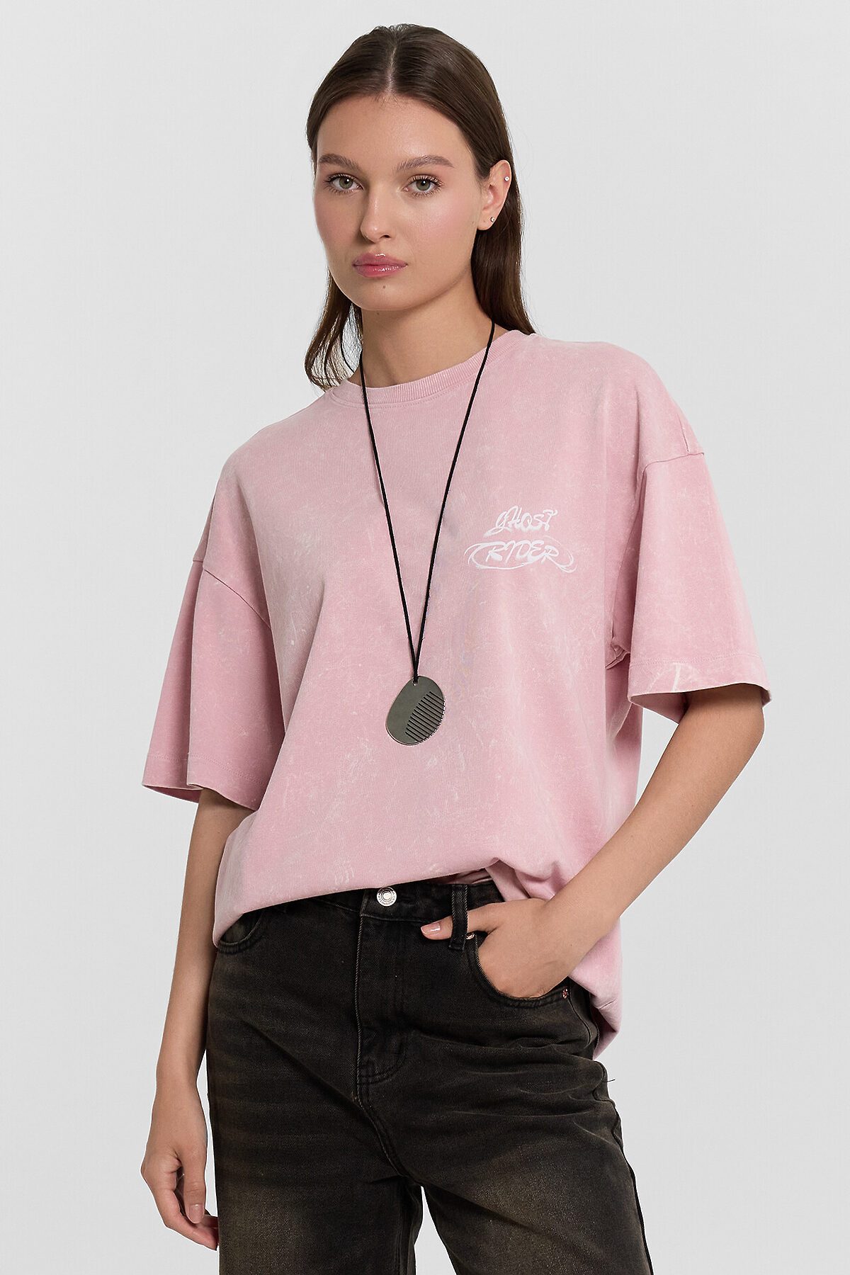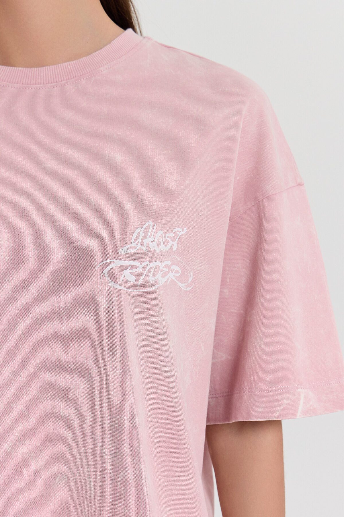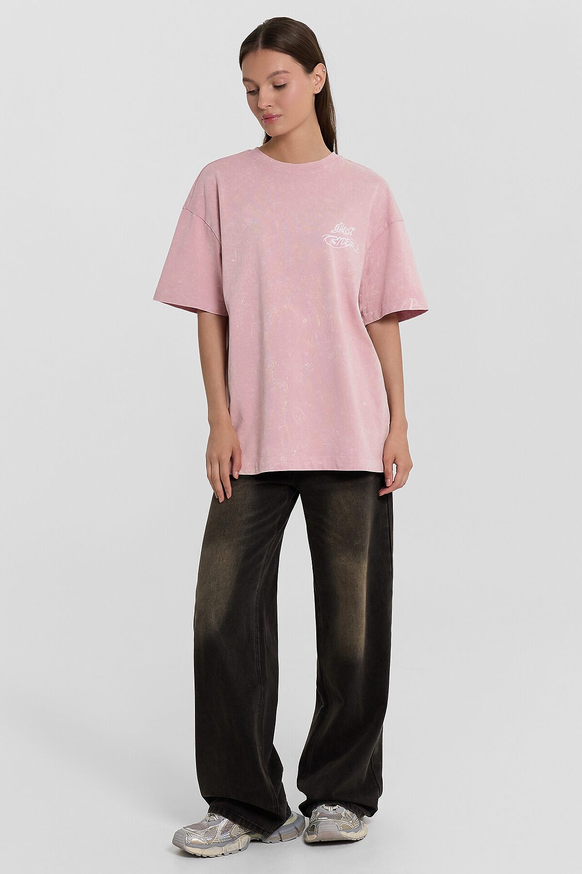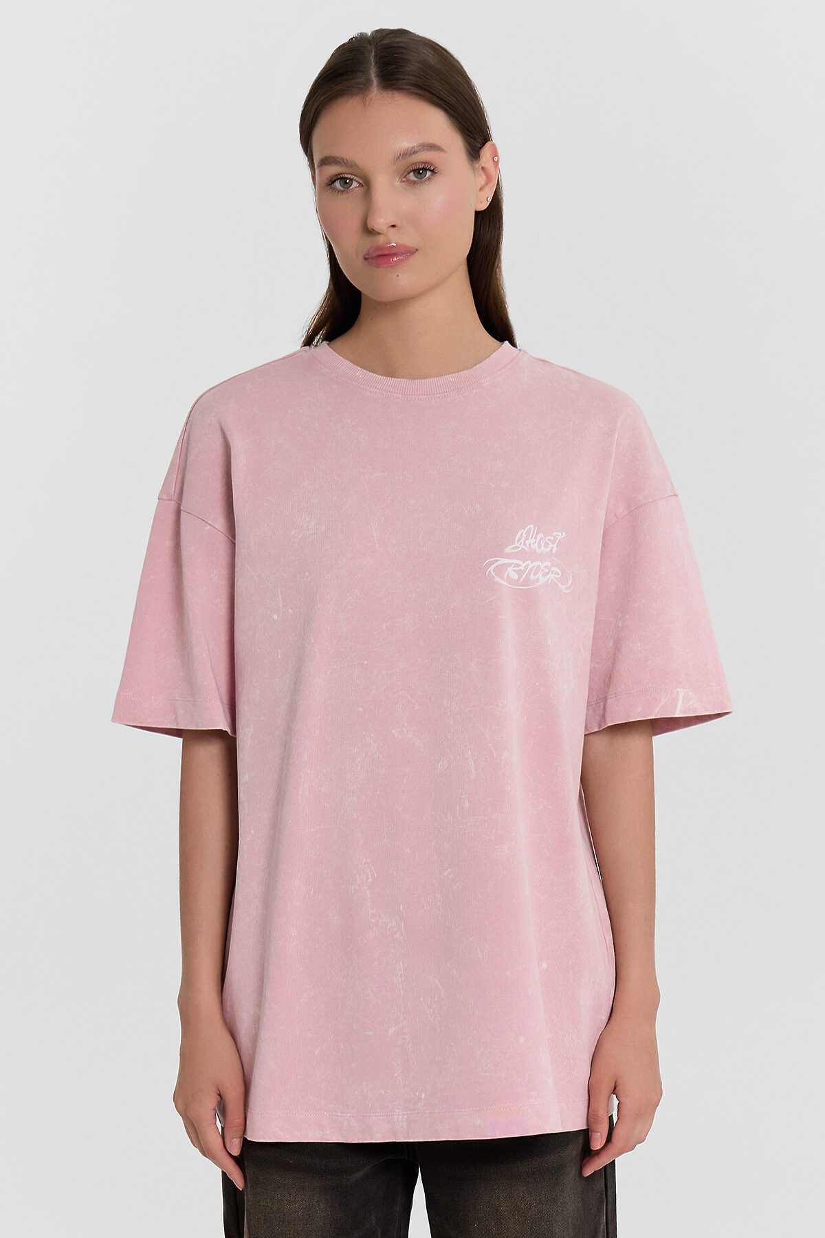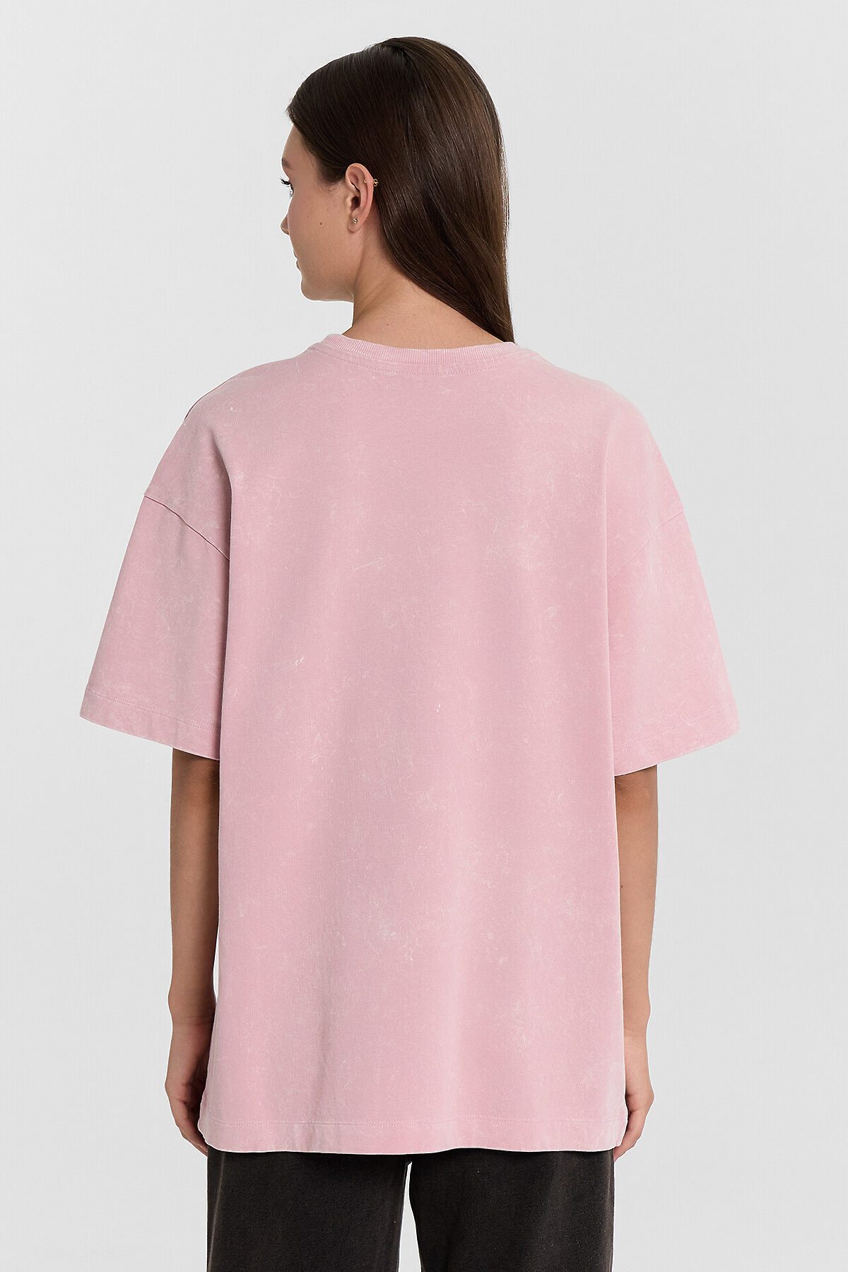 Футболка силуэта оверсайз из трикотажного полотна кулирка. Горловина круглой формы, обтачка горловины из рибаны. Шов горловины спинки закрыт бейкой из основного полотна. Плечо спущено, пройма углублена. Рукав втачной, широкий, длиной чуть выше локтя. Футболка удлиненная.