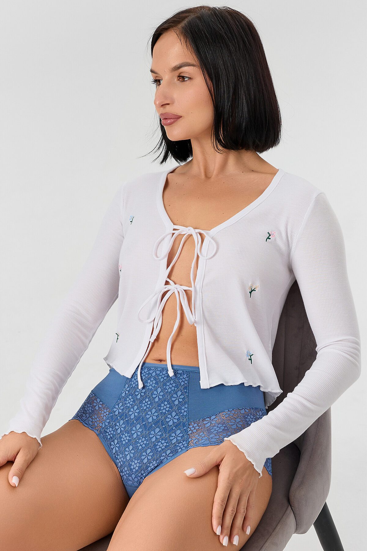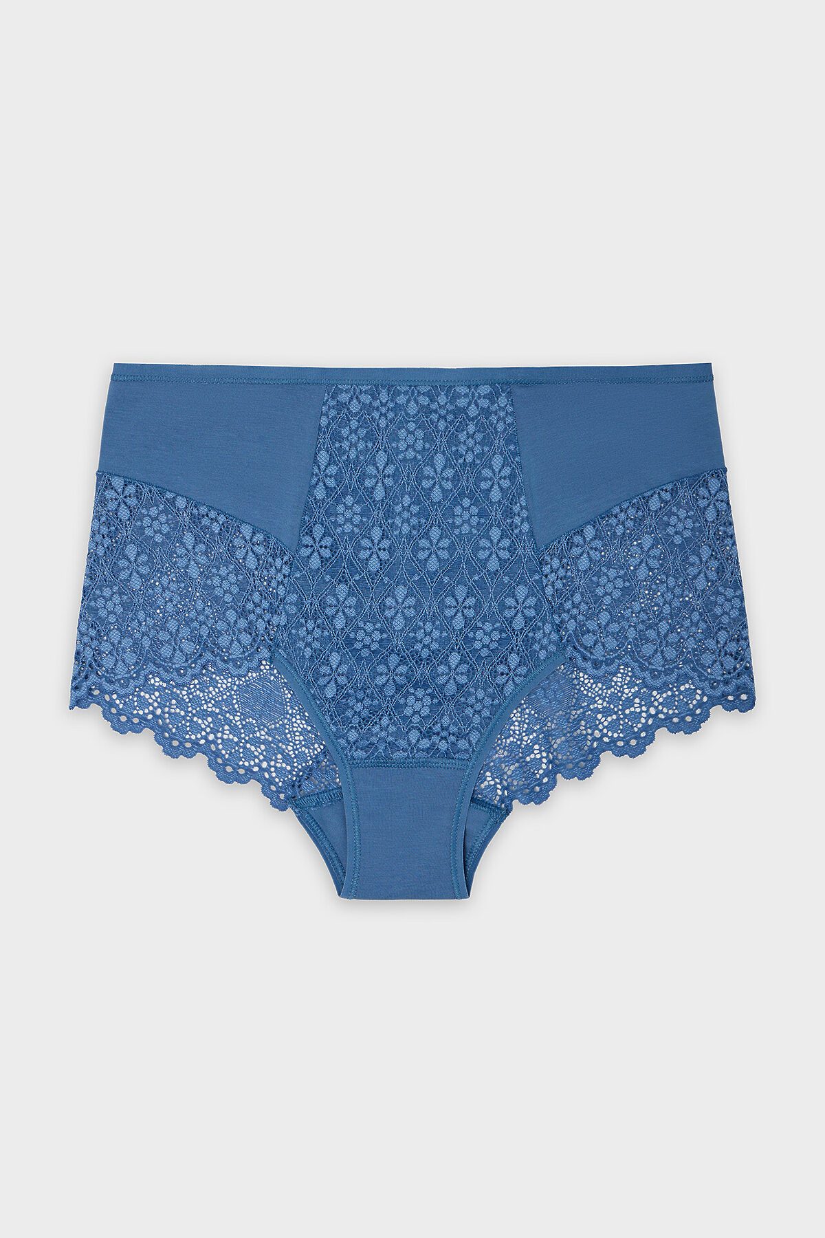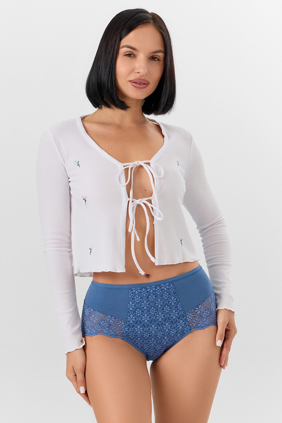 Трусы женские макси с высокой посадкой из кулирного полотна и эластичного кружева. Перед с вертикальным и горизонтальным членением. Передняя центральная деталь из кулирного полотна с наложением наверх эластичного кружева. Ластовица отрезная на подкладке из основного полотна. Срезы ластовицы обработаны эл тесьмой 6 мм (жилка тканая Wt4-6, девсел 13460 W) с наложением на лицевую сторону полотна и с узким верхним застилом в край. Задняя деталь со средним швом и с горизонтальным членением. Вертикальные и горизонтальные швы собраны на ширителе. Верхний срез обработан эластичной тесьмой 10 мм (жилка тканая Wt4-10, девсел 13460 W) с наложением на лицевую сторону полотна и с узким верхним застилом в край.