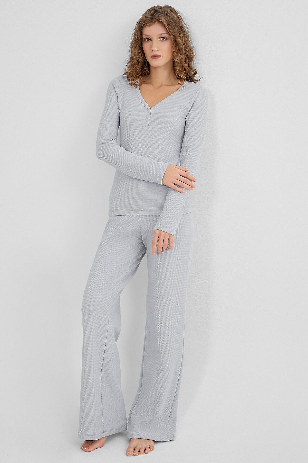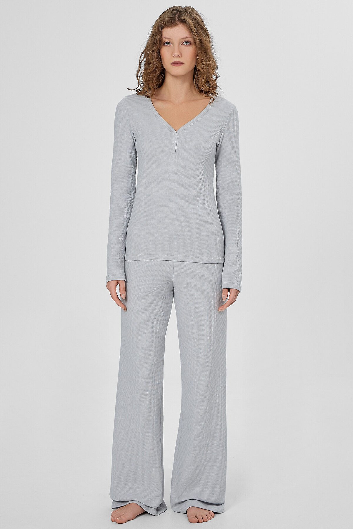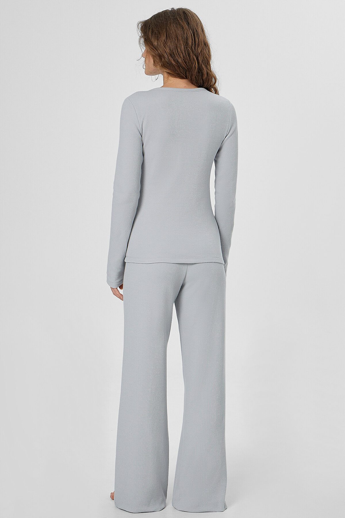 Комплект женский состоит из джемпера и брюк. Джемпер прилегающего силуэта. Горловина V-образная, обработана бейкой из основного полотна. Рукава втачные длинные. По переду обработана застежка на книпперы. Нижние срезы джемпера и рукавов обработаны швом вподгибку. Брюки прямые длинные. Посадка срердняя. Пояс цельнокроеный с эластичной тесьмой внутри (внутр. 40мм 40RV). Нижние срезы брюк обработаны швом вподгибку.