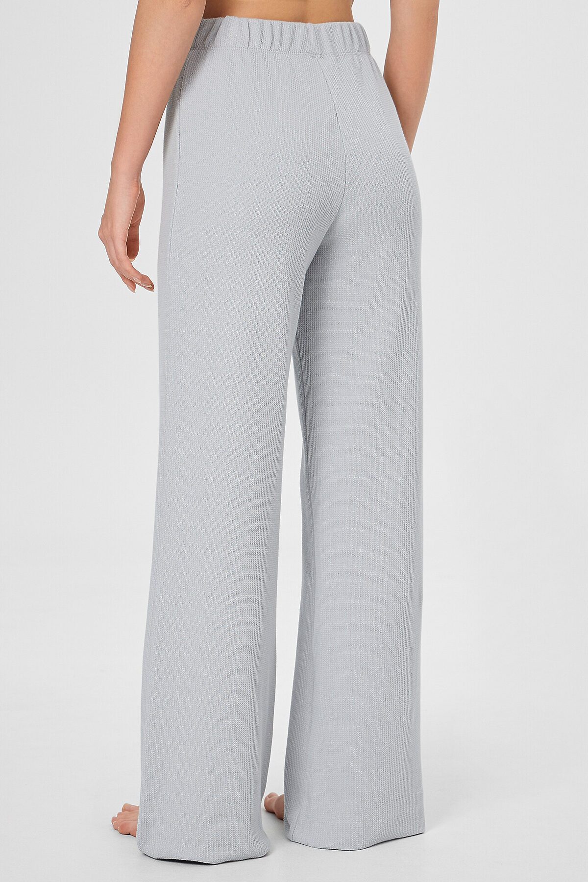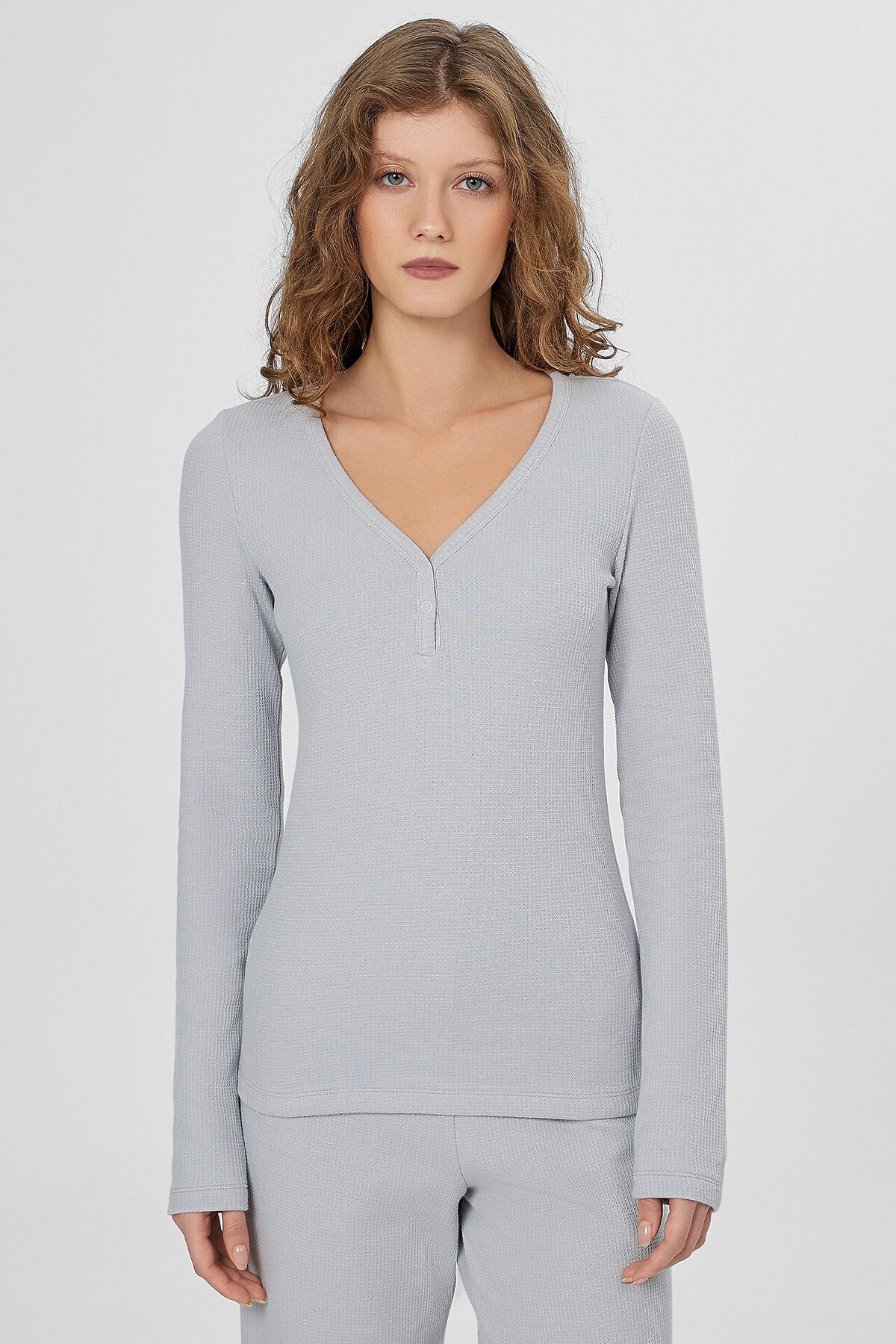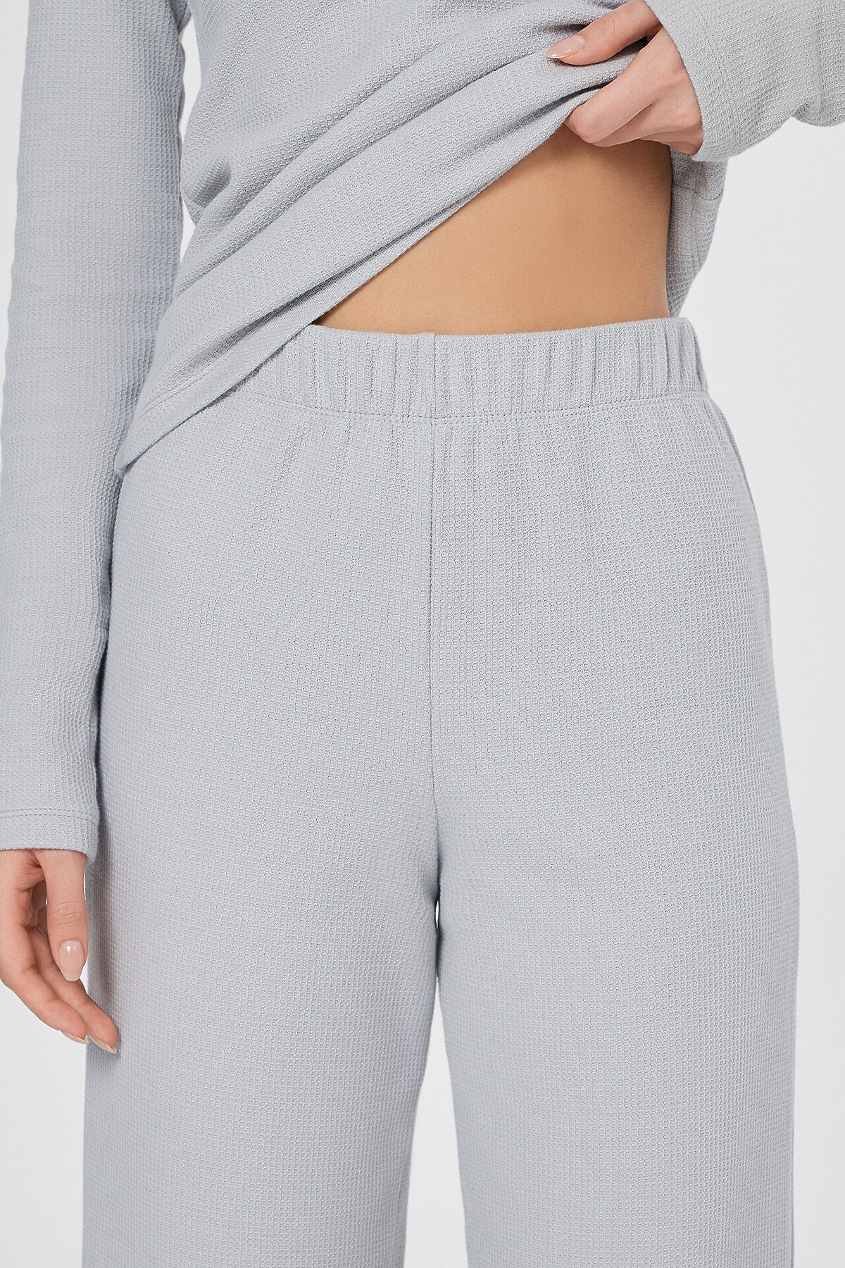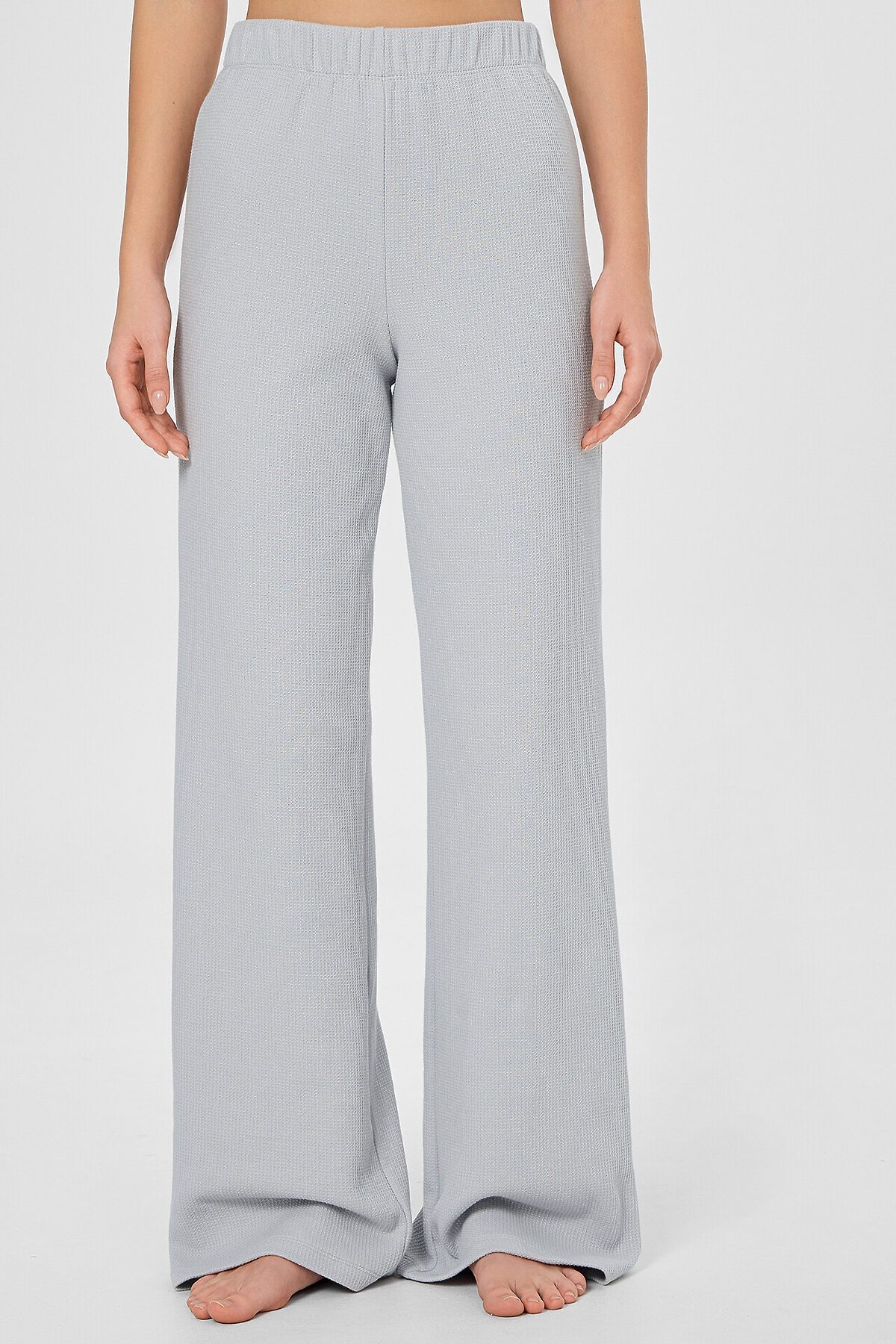 Комплект женский состоит из джемпера и брюк. Джемпер прилегающего силуэта. Горловина V-образная, обработана бейкой из основного полотна. Рукава втачные длинные. По переду обработана застежка на книпперы. Нижние срезы джемпера и рукавов обработаны швом вподгибку. Брюки прямые длинные. Посадка срердняя. Пояс цельнокроеный с эластичной тесьмой внутри (внутр. 40мм 40RV). Нижние срезы брюк обработаны швом вподгибку.